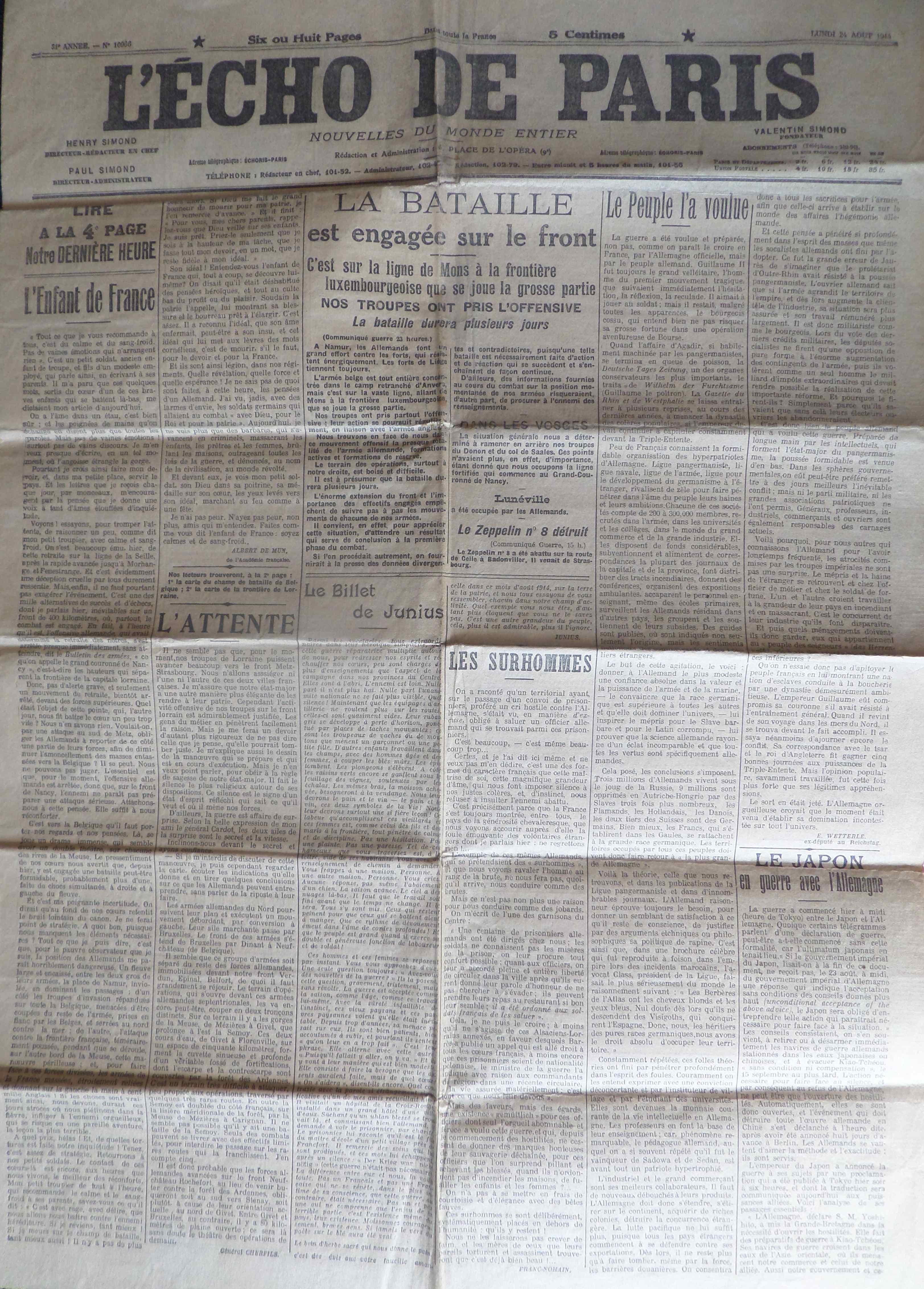 L’ECHO DE PARIS du 24 Août 1914 (21ème jour de guerre)