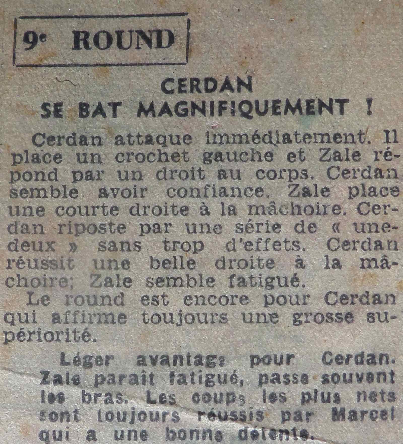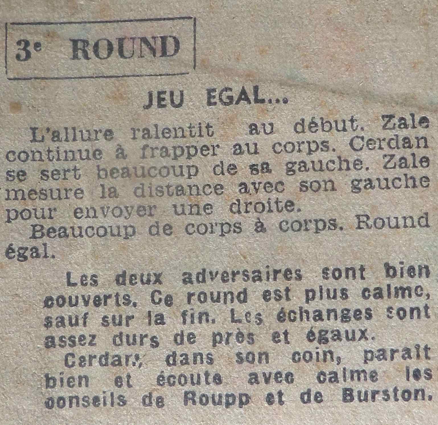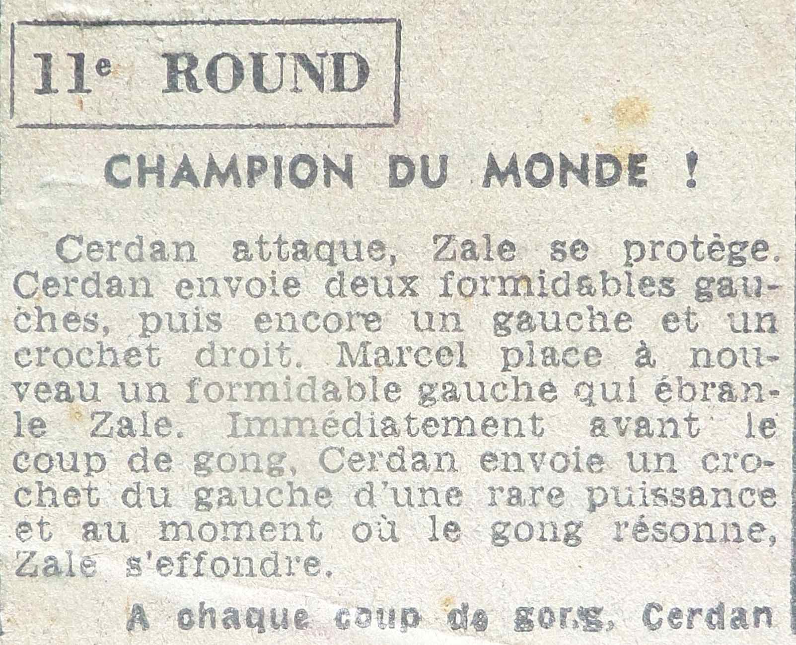 Et l’on peut lire le combat round par round, du 1er au 11ème puisque Cerdan le gagna avant la limite, sur KO.