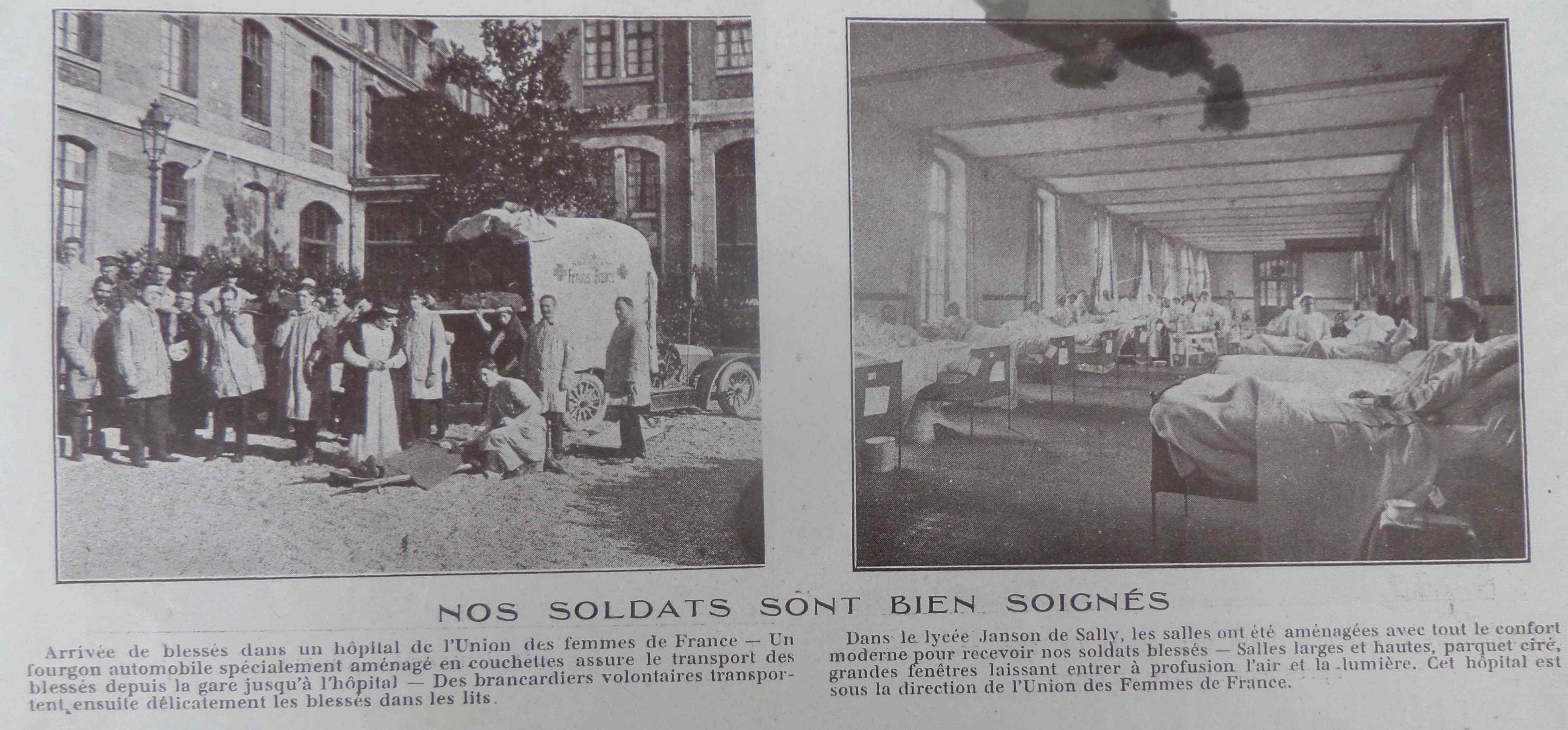 l’ambulance transportant les blessés de la gare au Lycée Janson de Sally à Paris tenu par l’Union des Femmes de France (association de secours d’obédience protestante)