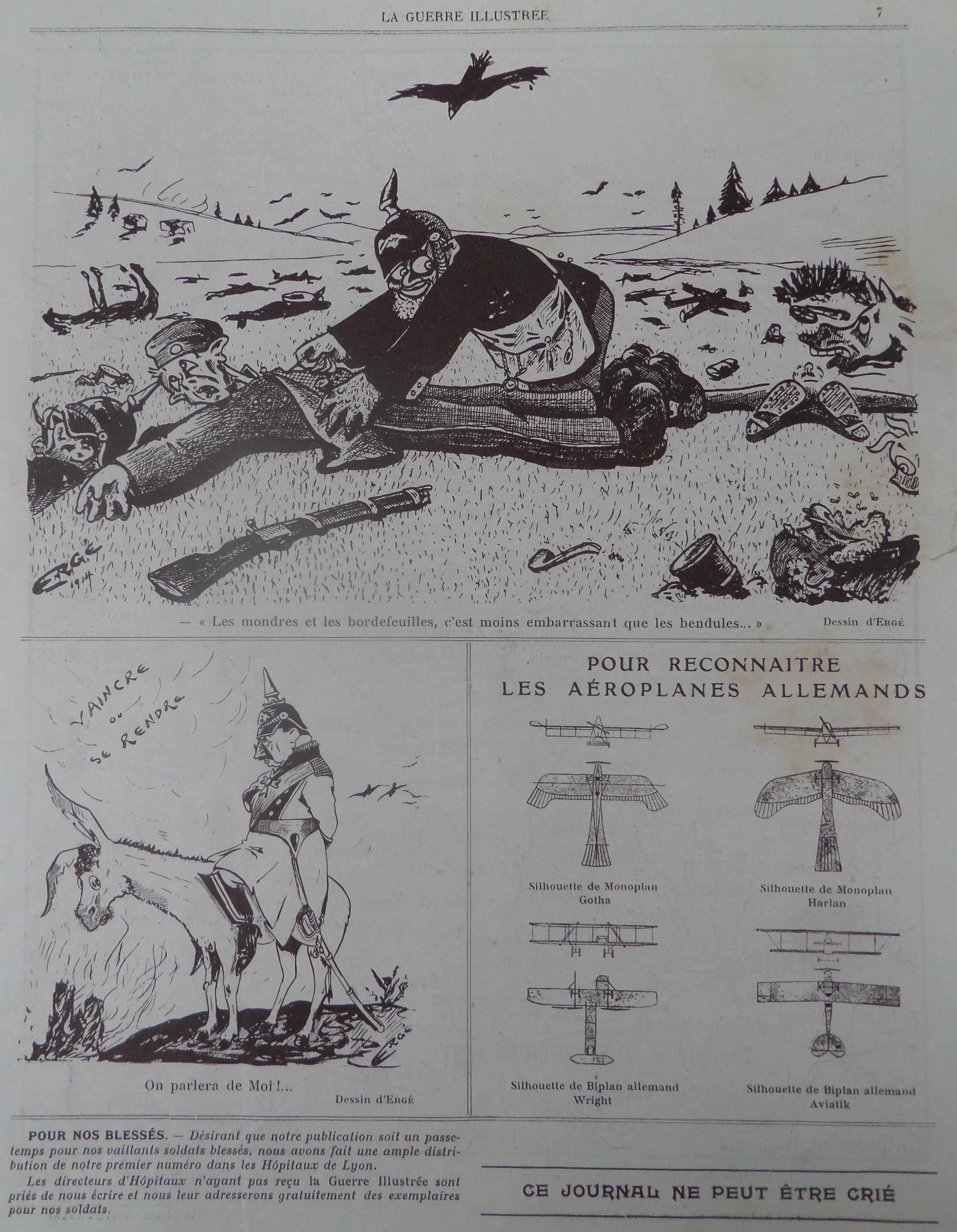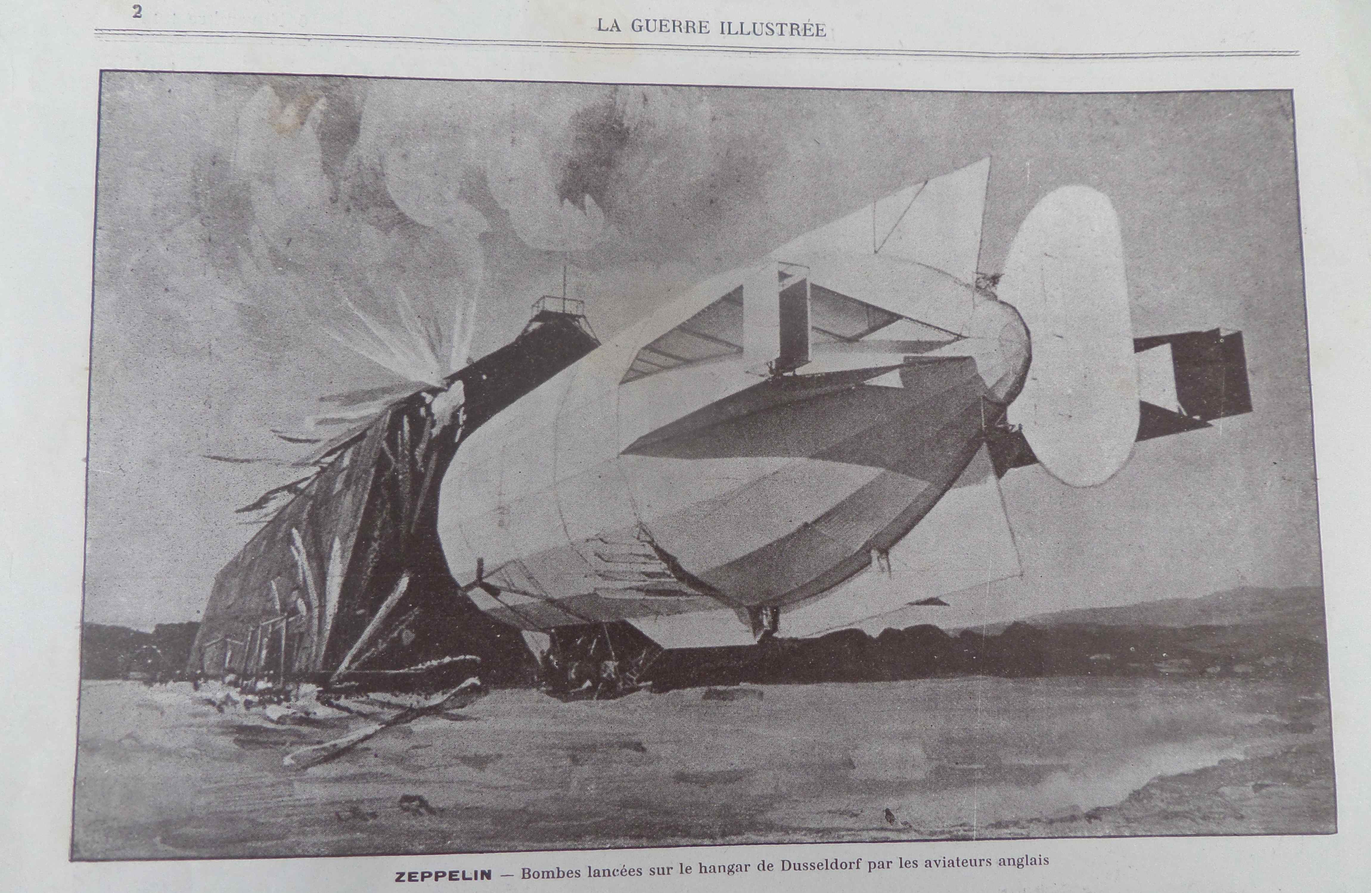 On retrouve en page intérieure un dessin d’un hangar à Zeppelin détruit par l’aviation anglaise avec le dirigeable en mauvaise posture