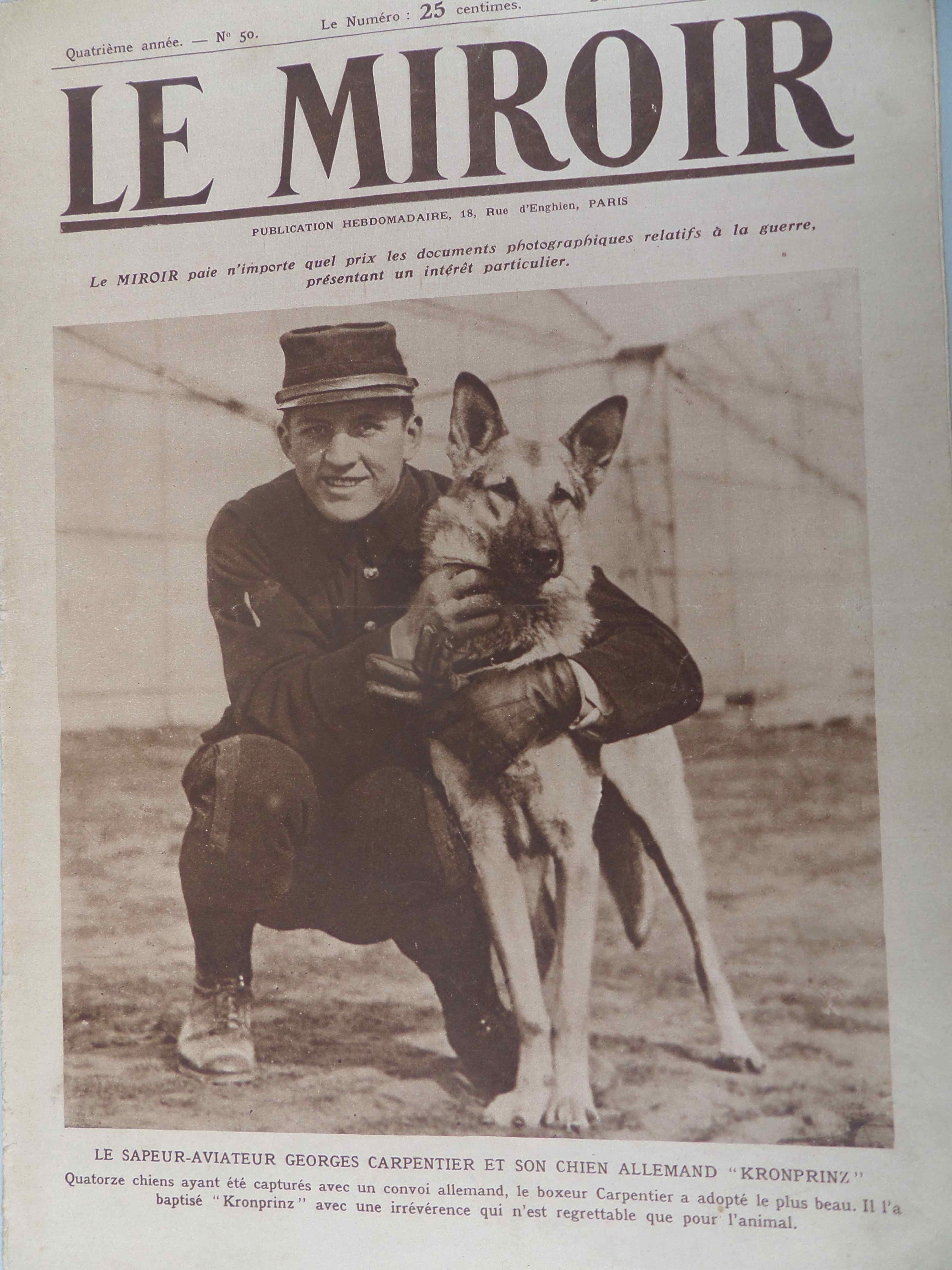 Ce jeune homme qui vient d’adopter un chien « allemand », c’est le futur grand champion français de boxe Georges Carpentier qui était aux prémices d’une grande carrière et qui allait devenir champion du monde des mi-lourds le 19 octobre 1920. Carpentier servit dans l’armée de l’air et fut blessé pendant la guerre.