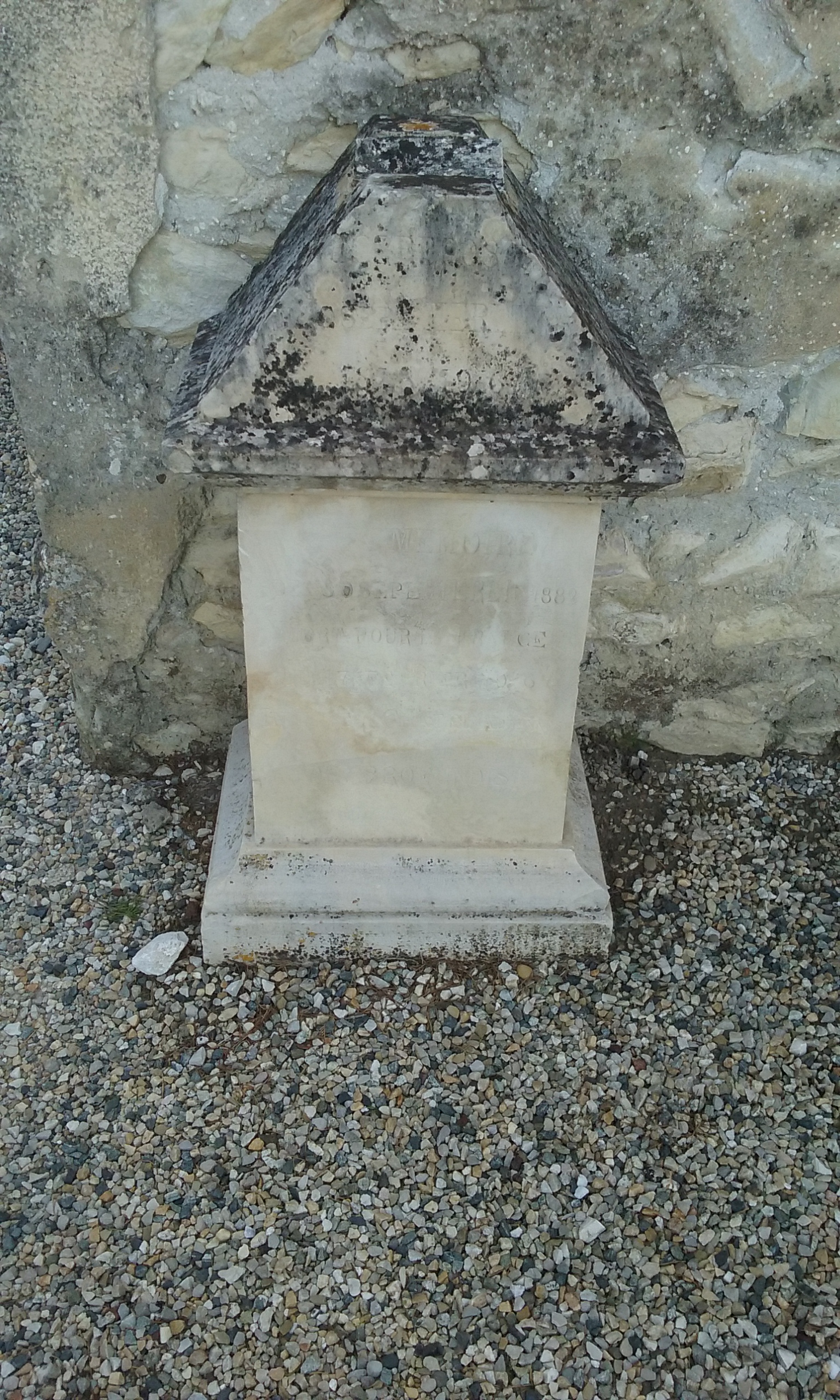 La plaque tombale de Merlin Joseph très abîmée mais que tout le monde peut voir quand il passe rue Delpech devant le Monument aux Morts puisqu’elle est adossée à l’arrière de la chapelle, à côté de celui-ci (hors cimetière). La lecture du nom est délicate, on devine le mieux l’inscription « Mort pour la France ».