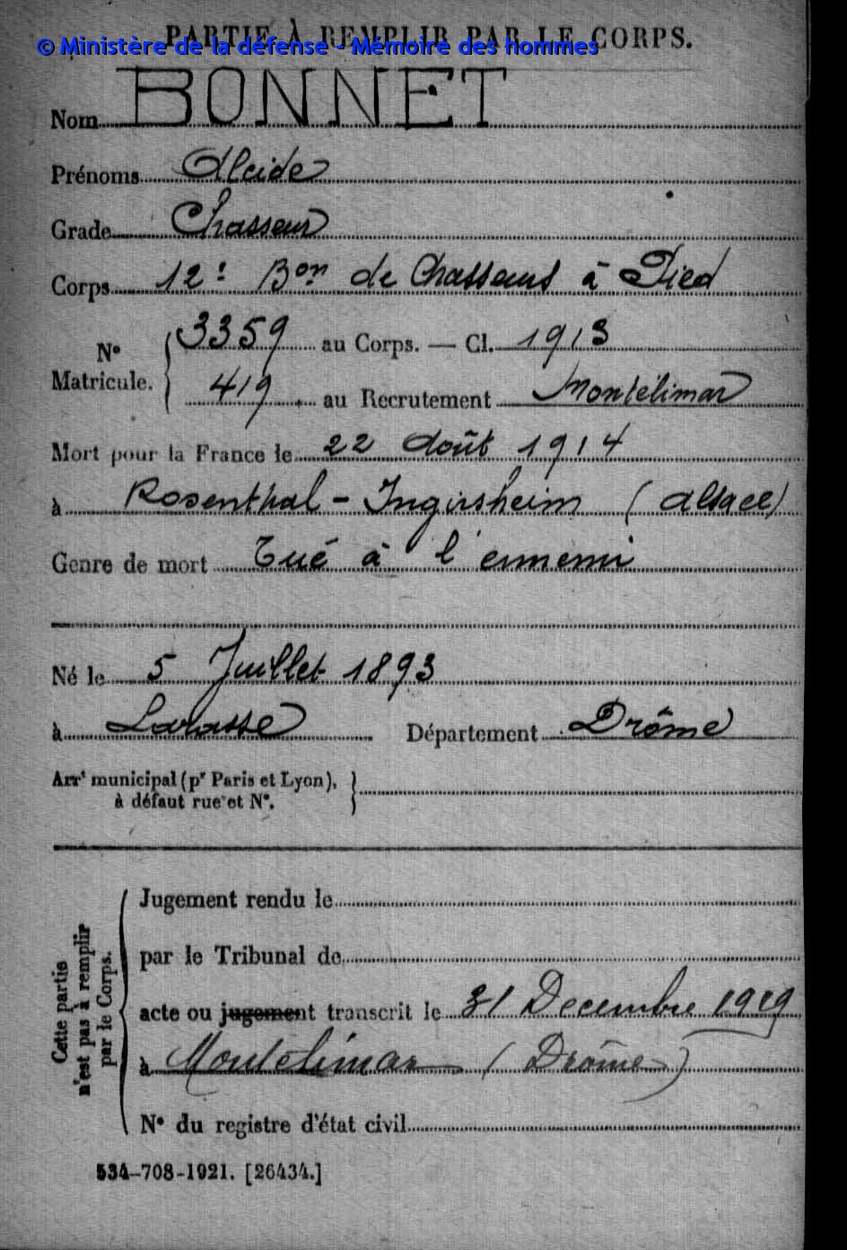 On voit que ce soldat a été tué en Alsace au début de la guerre, pendant ce terrible mois d’août 1914. Son unité prit part aux combats victorieux qui permirent un moment de reprendre une partie de l’Alsace. Dans le site: