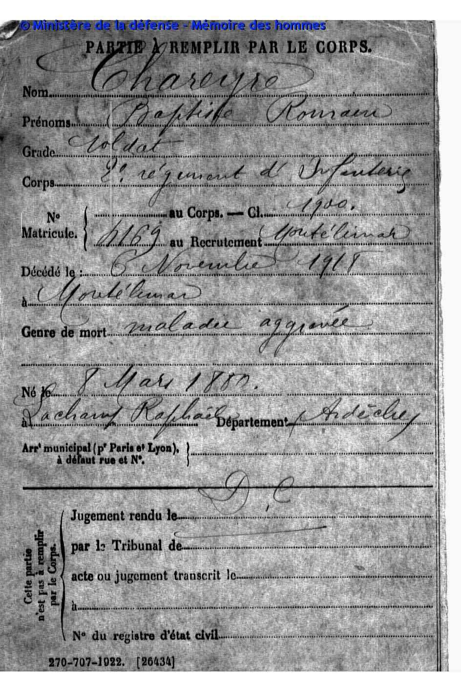 6 soldats moururent de maladie et 5 des suites de leurs blessures soit plus de la moitié des Morts anconnais: en hôpital ou ambulance (7) et 3 chez eux (Marcel Quézel-Crasaz à Ancone, Romain Chareyre à Montélimar et Abel Landraud probablement chez lui). Hôpitaux près des combats (illisible dans la Somme, à Nancy, à Giromagny -Territoire de Belfort-, à Chatel -Ardennes-, à Royallieu -Oise-) ou plus éloigné (hôpital de Saint-Mandé -près de Paris- ou à Béziers)…