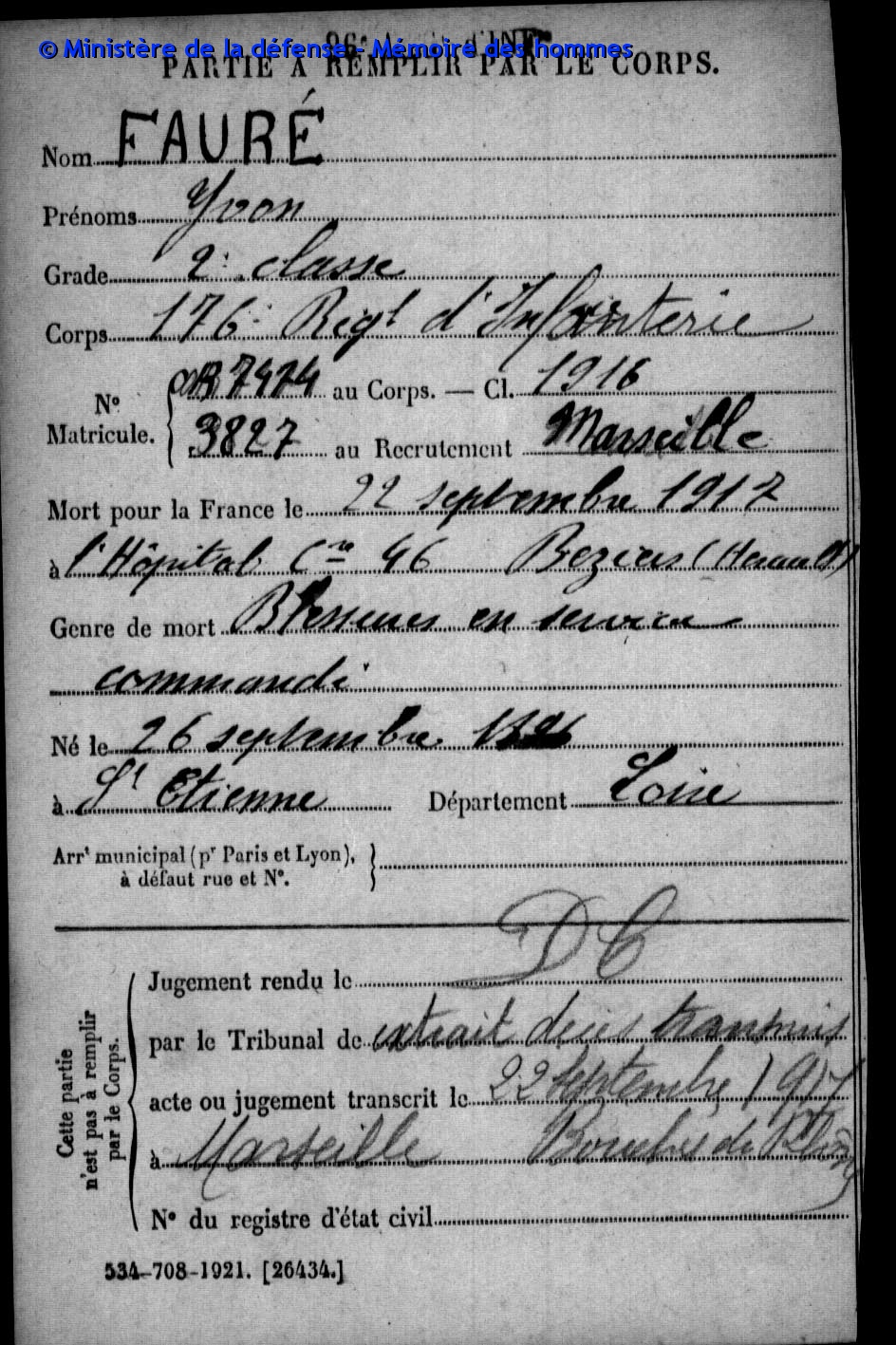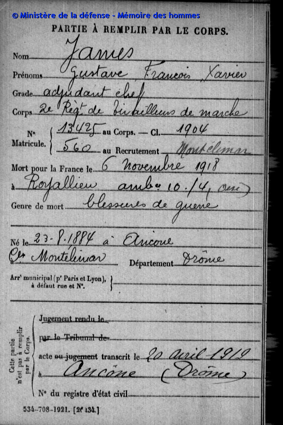 Gustave James succomba à ses blessures 2 jours plus tard, à 5 jours du 11 novembre… deux jours avant Romain Chareyre (fiche ci-dessus) qui décéda le 8 novembre.
