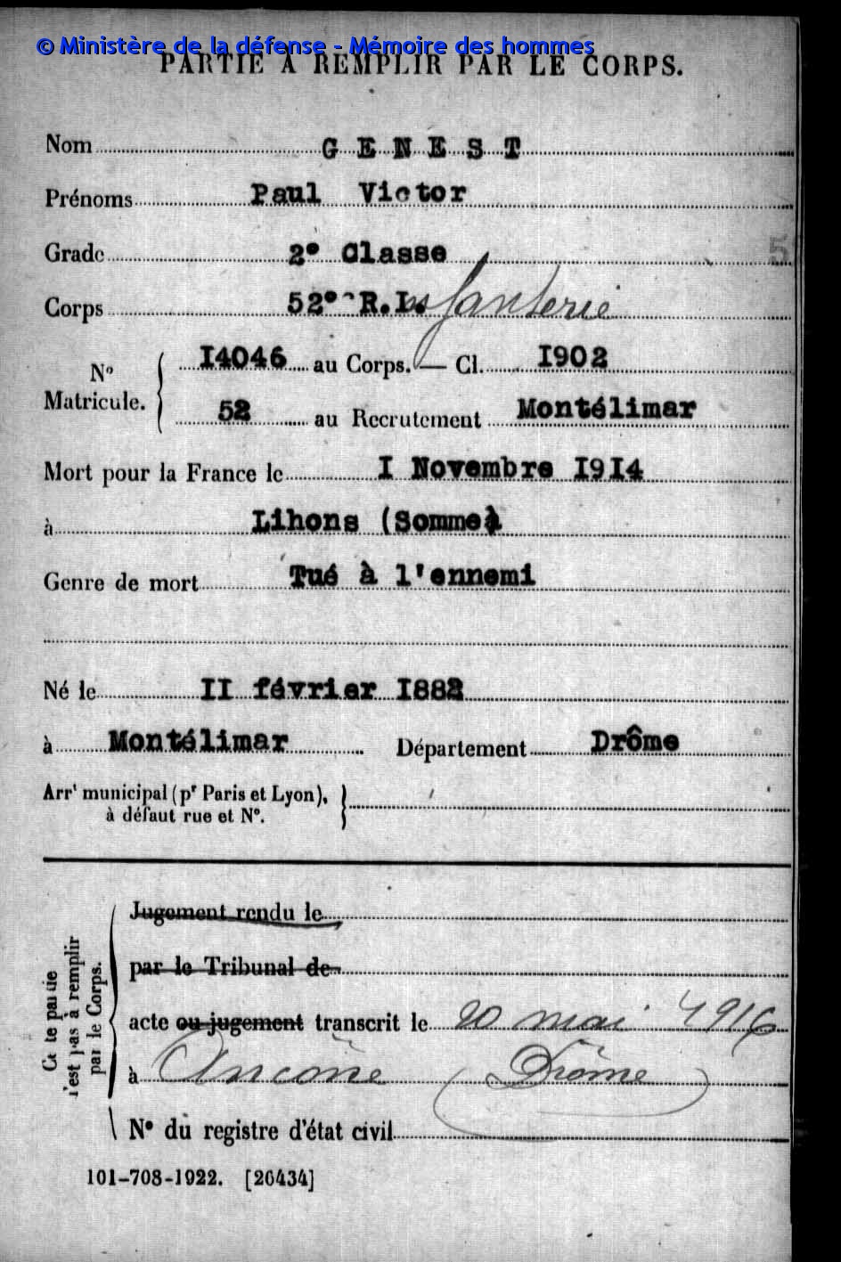8 Poilus sont donc morts lors des combats, 6 fiches partant la mention « Tué à l’ennemi » comme celle de Paul Genest