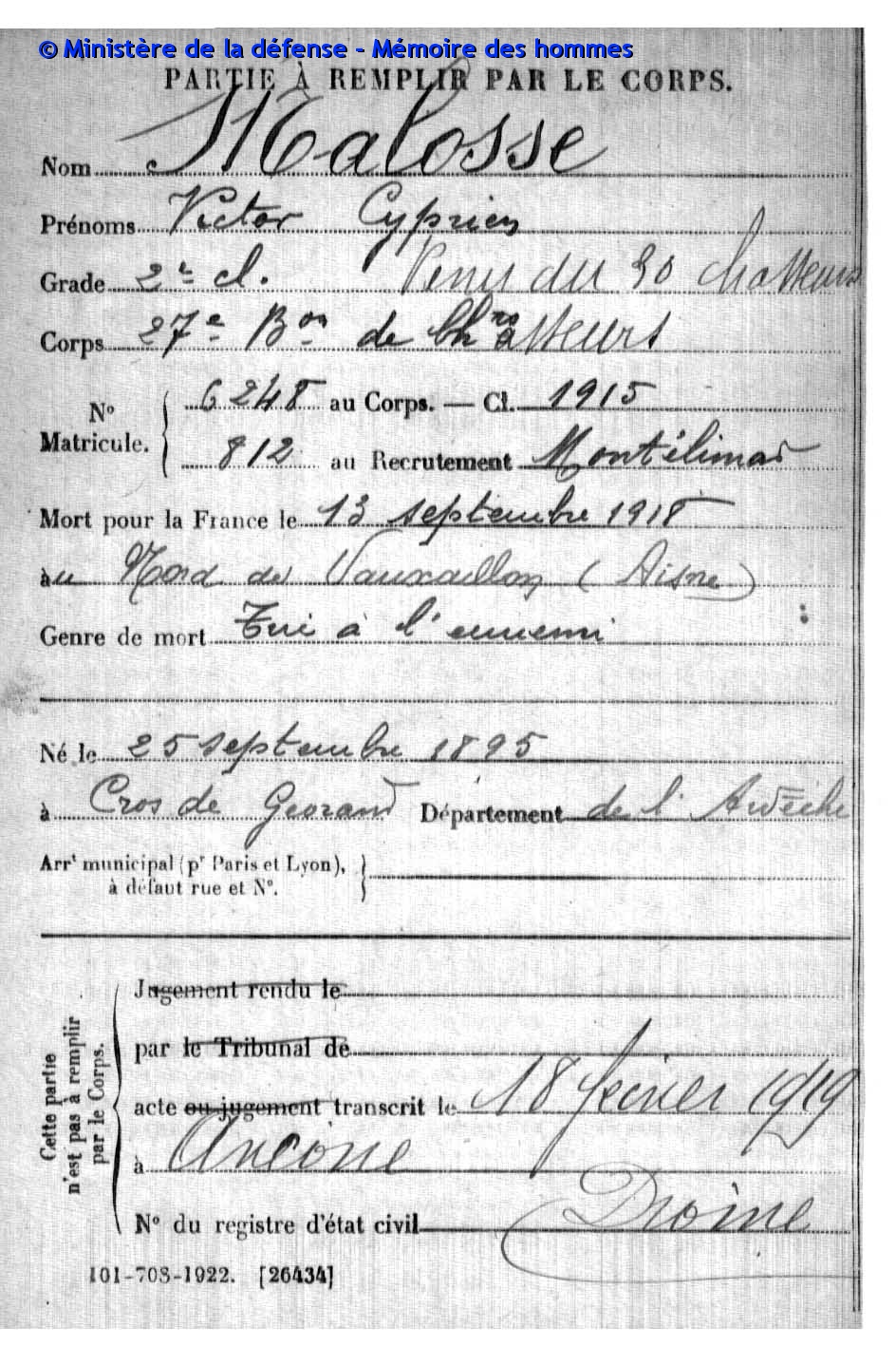 9 sont d’Ancone (ou 10 si l’on compte Abel Landraud) et 4 de Montélimar, 1 de Savasse et 1 de Chateauneuf-du-Rhône soit 15 ou 16/19 de l’Agglo. Baptiste Romain Chareyre et Victor Malosse viennent d’Ardèche, le premier de Lachamp-Raphaël et le second du Cros-de Géorand en Ardèche, près du lac d’Issarlès, où l’exode rural doit l’avoir poussé vers notre village de la vallée du Rhône. Yvon Faure est né à Saint-Etienne.