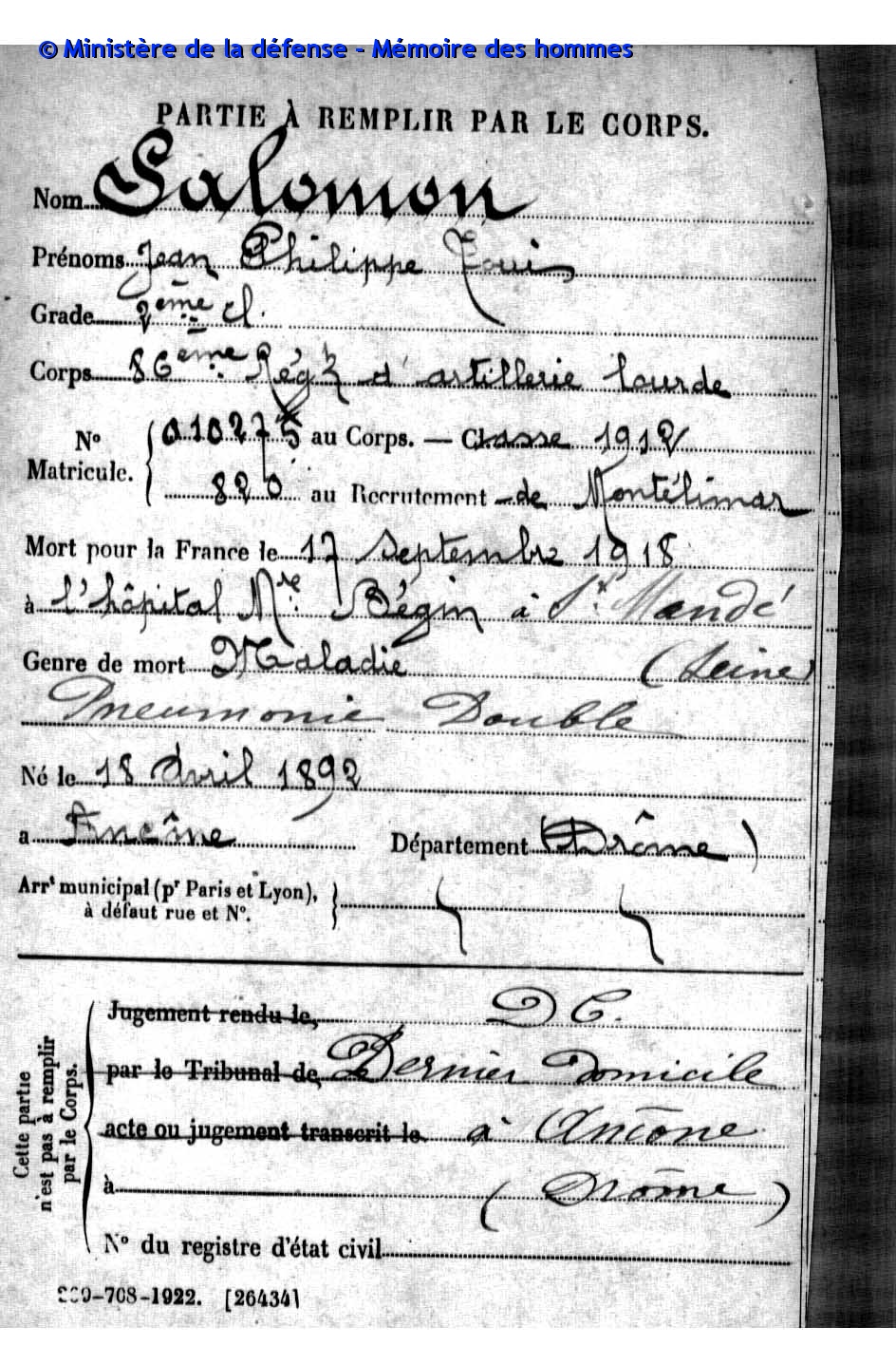Jean-Philippe Louis Salomon est mort à Saint-Mandé d’une double pneumonie en 1918.