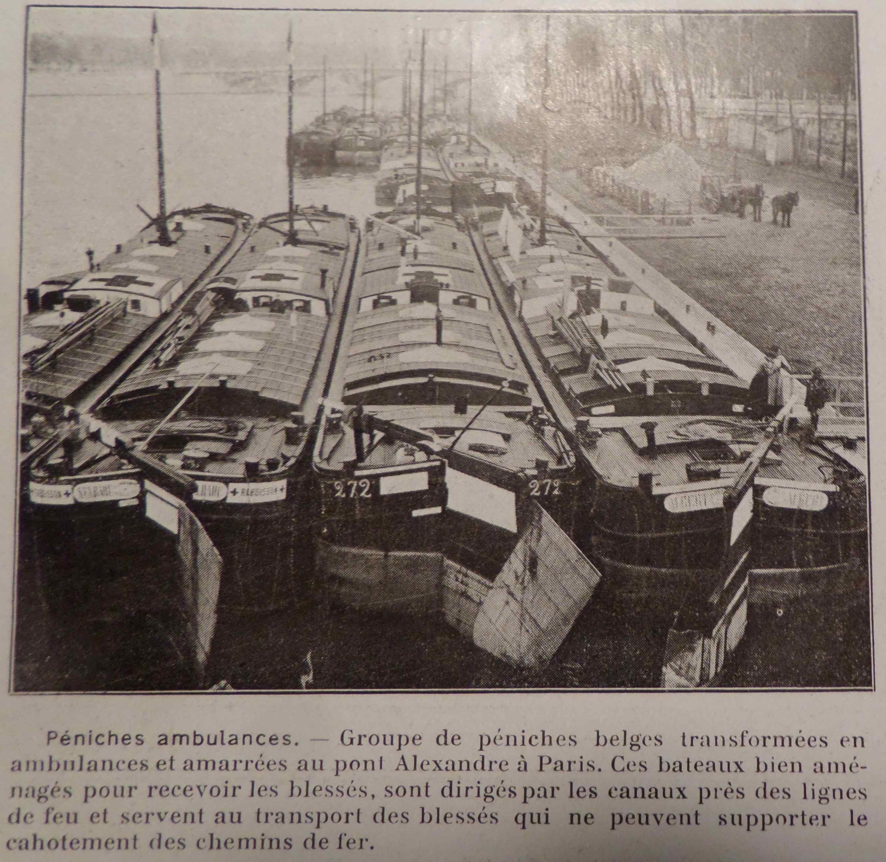 d’autres péniches belges à Paris ce coup-ci, près du pont Alexandre III, servant à transporter les blessés les plus graves par les voies navigables, ce transport étant plus doux que par le fer.