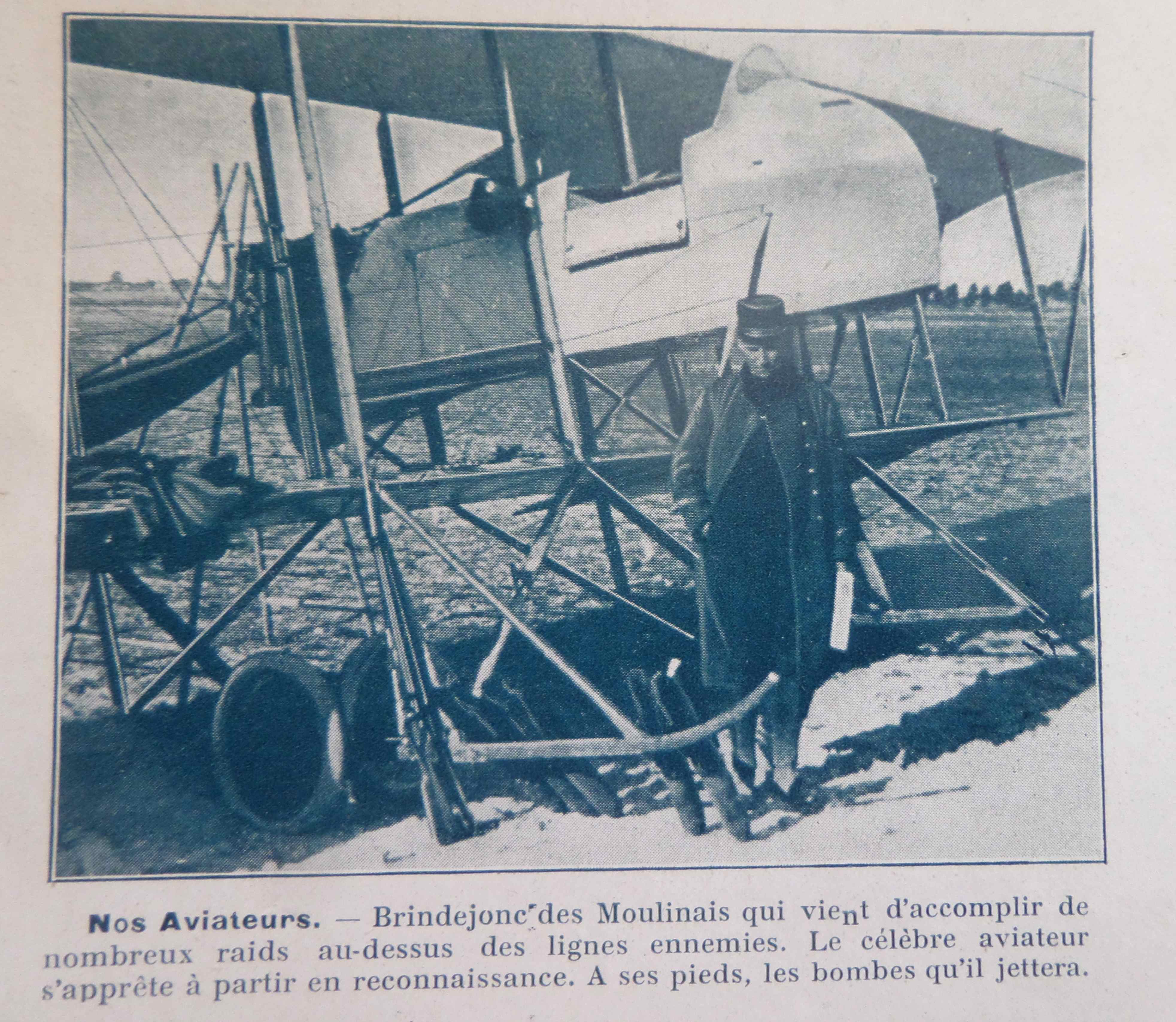 De l’aviation également, avec un pilote au nom original de Marcel Brindejonc des Moulinais qui pose avec les bombes qu’il va emporter pour sa mission.