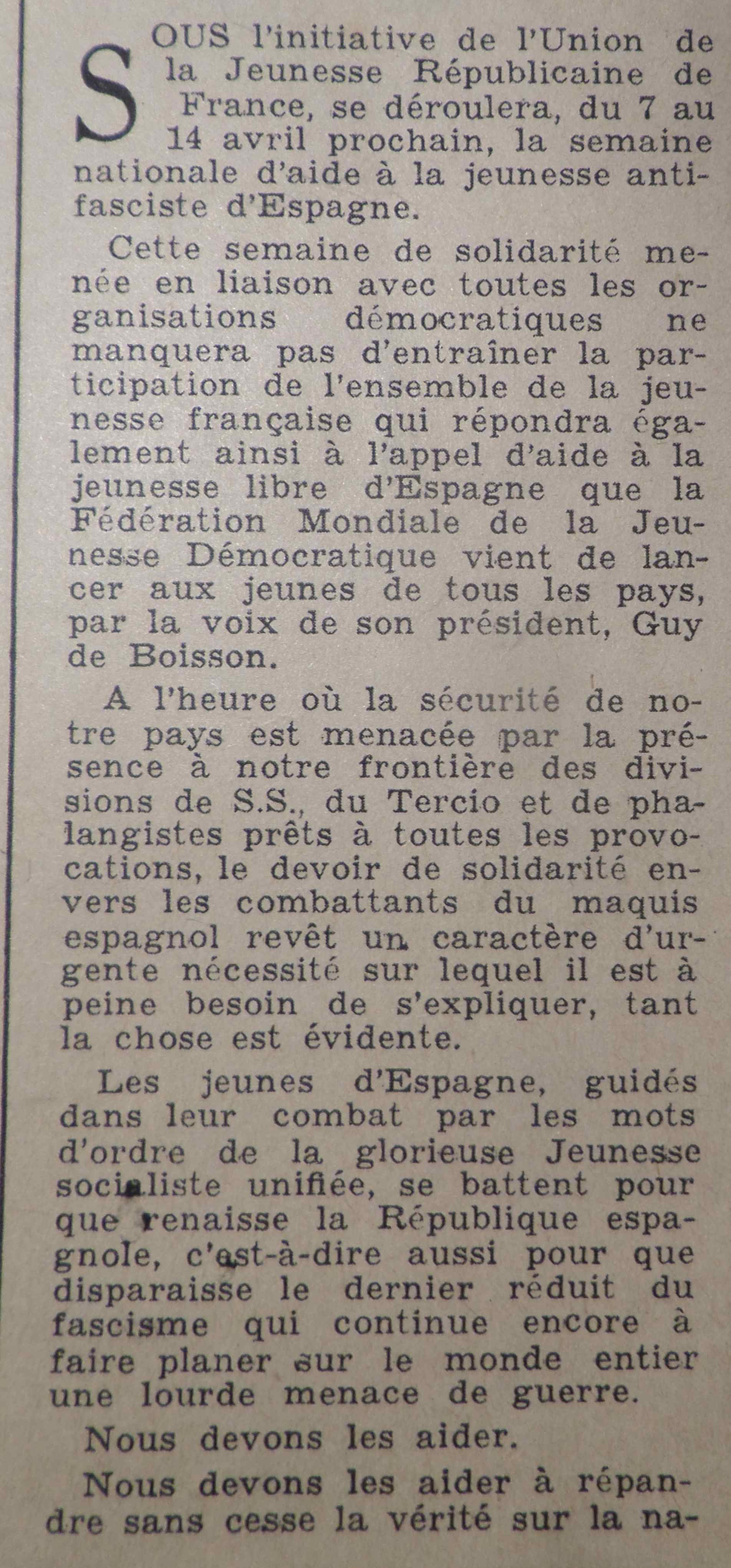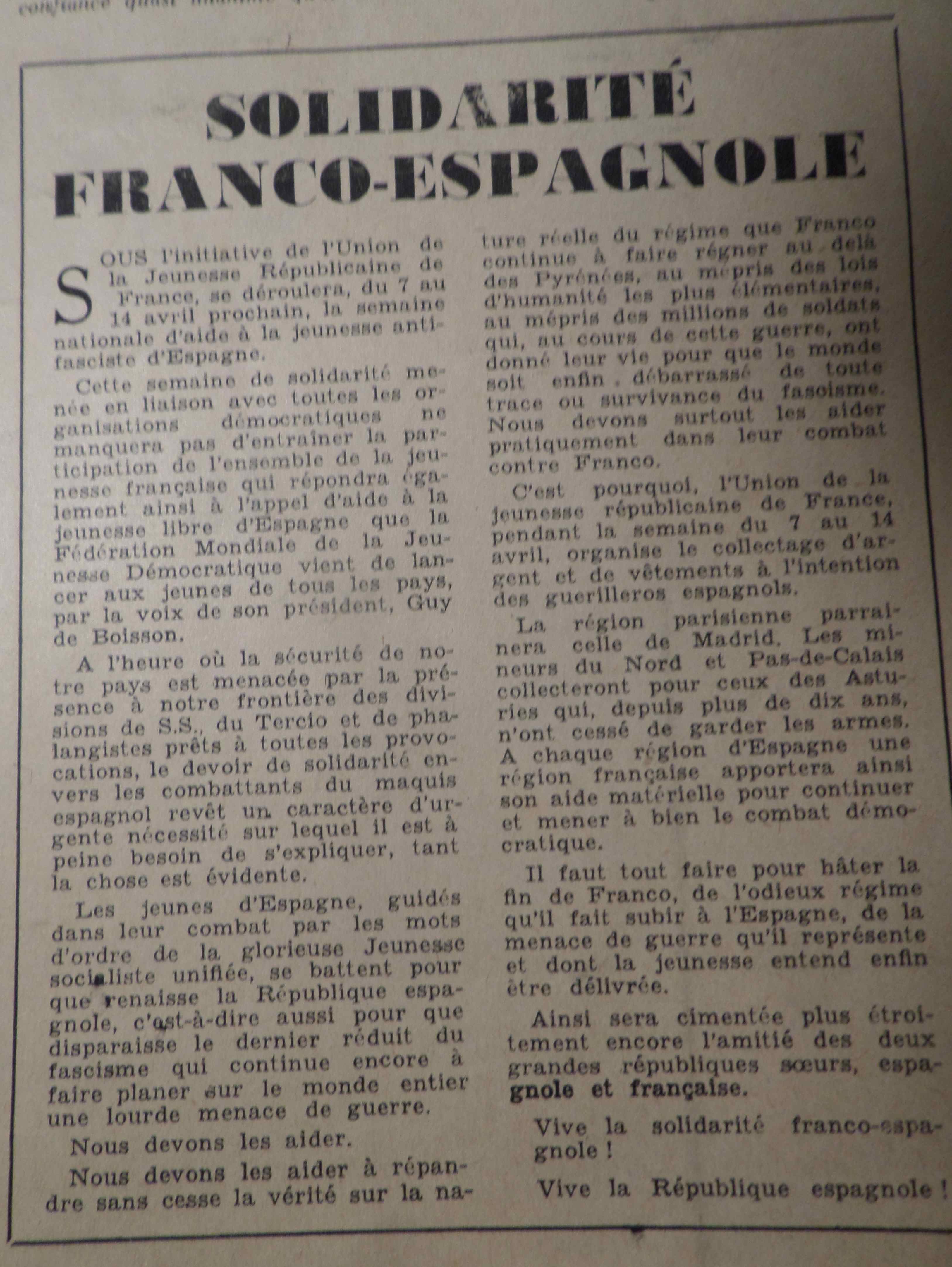 Mais pour celui présenté, un article en page 3 appelle carrément la jeunesse à la lutte contre le régime franquiste, pour soutenir les guérilleros combattant dans la clandestinité.