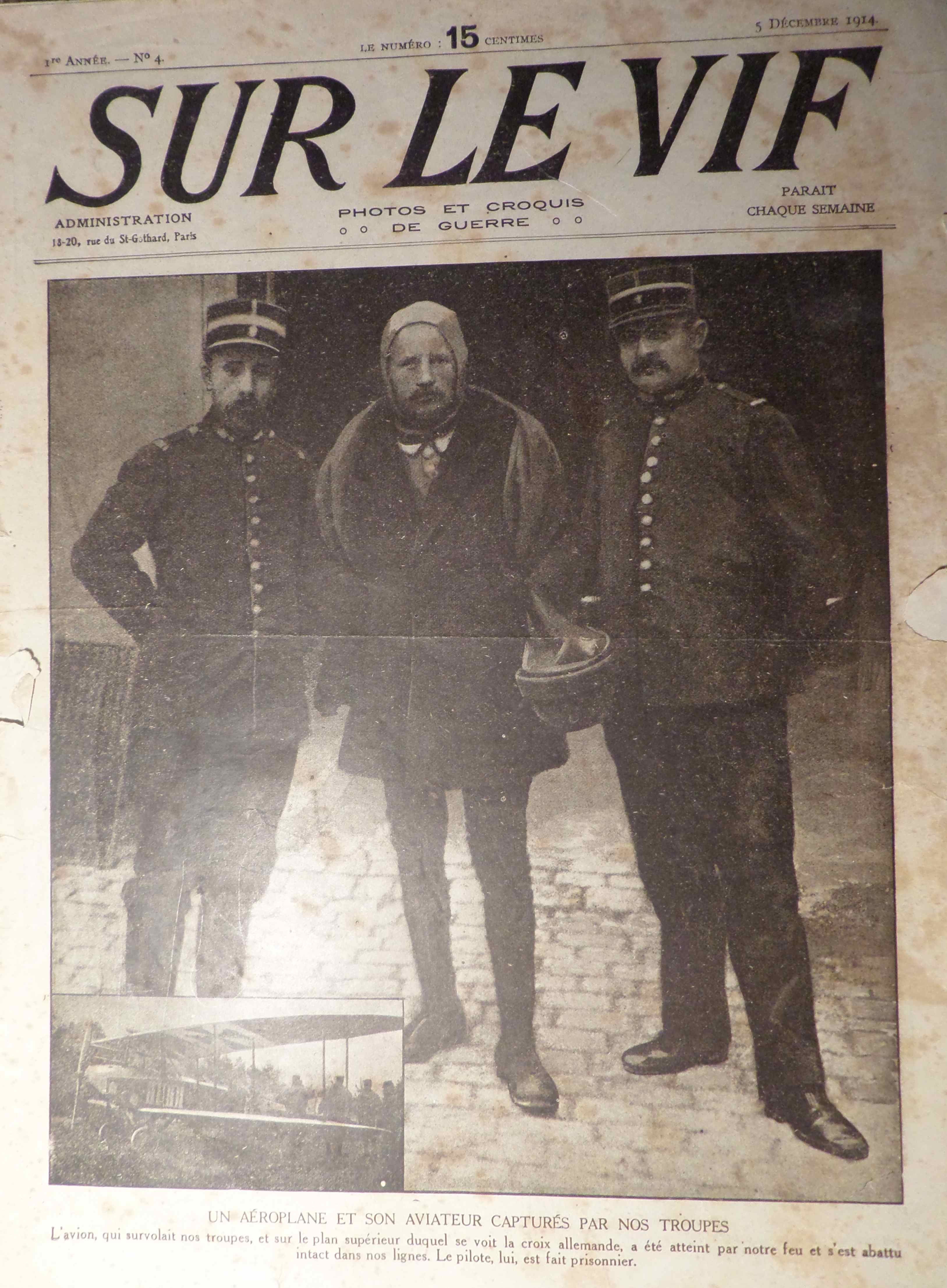A la Une de ce n°4 de SUR LE VIF plutôt abîmé, un aviateur allemand a été fait prisonnier car il a dû atterrir derrière les lignes françaises sur son aéroplane. Un tel fait était toujours très intéressant pour les services ennemis qui pouvaient ainsi découvrir les dernières innovations techniques adverses pour les copier.