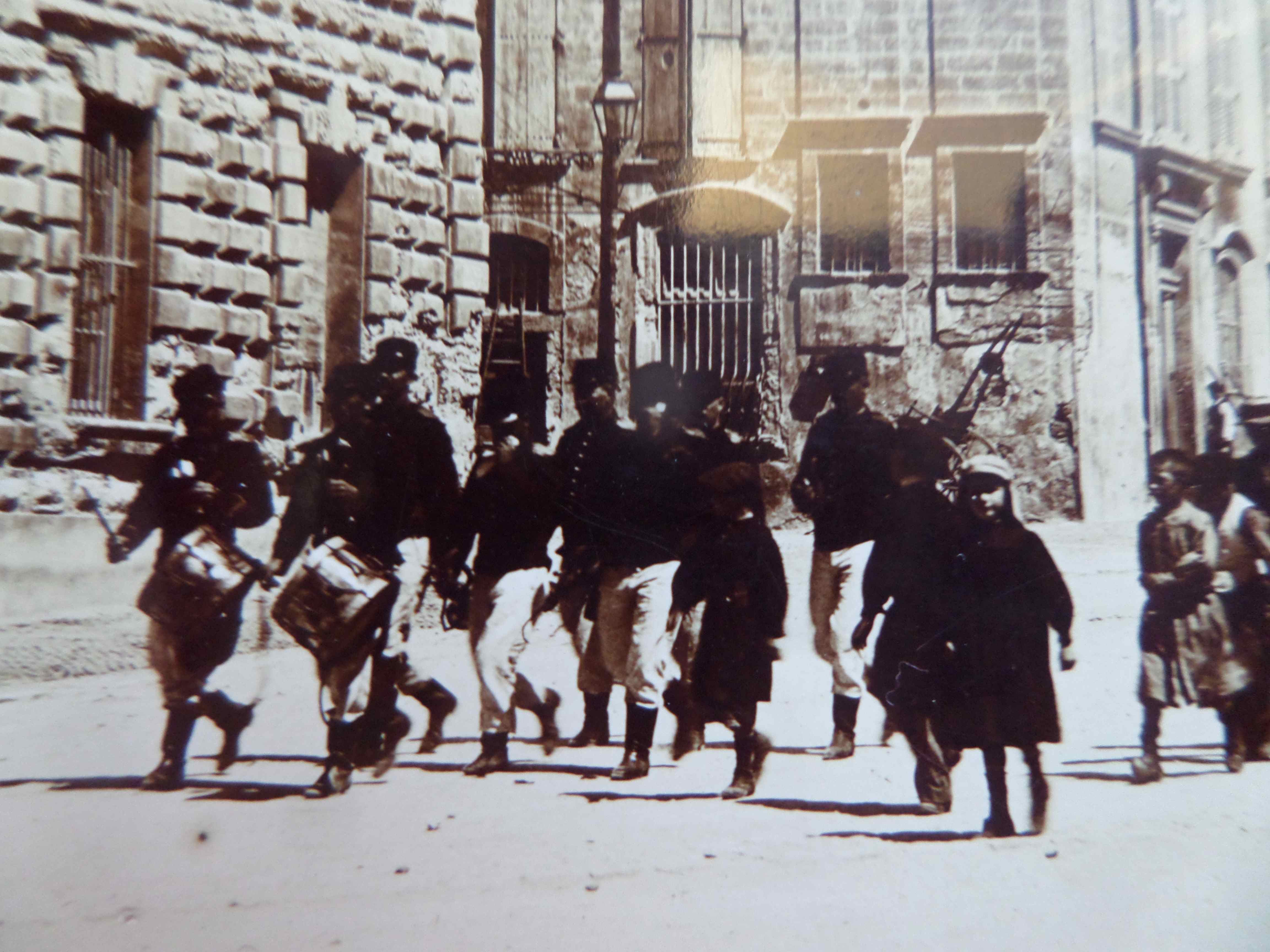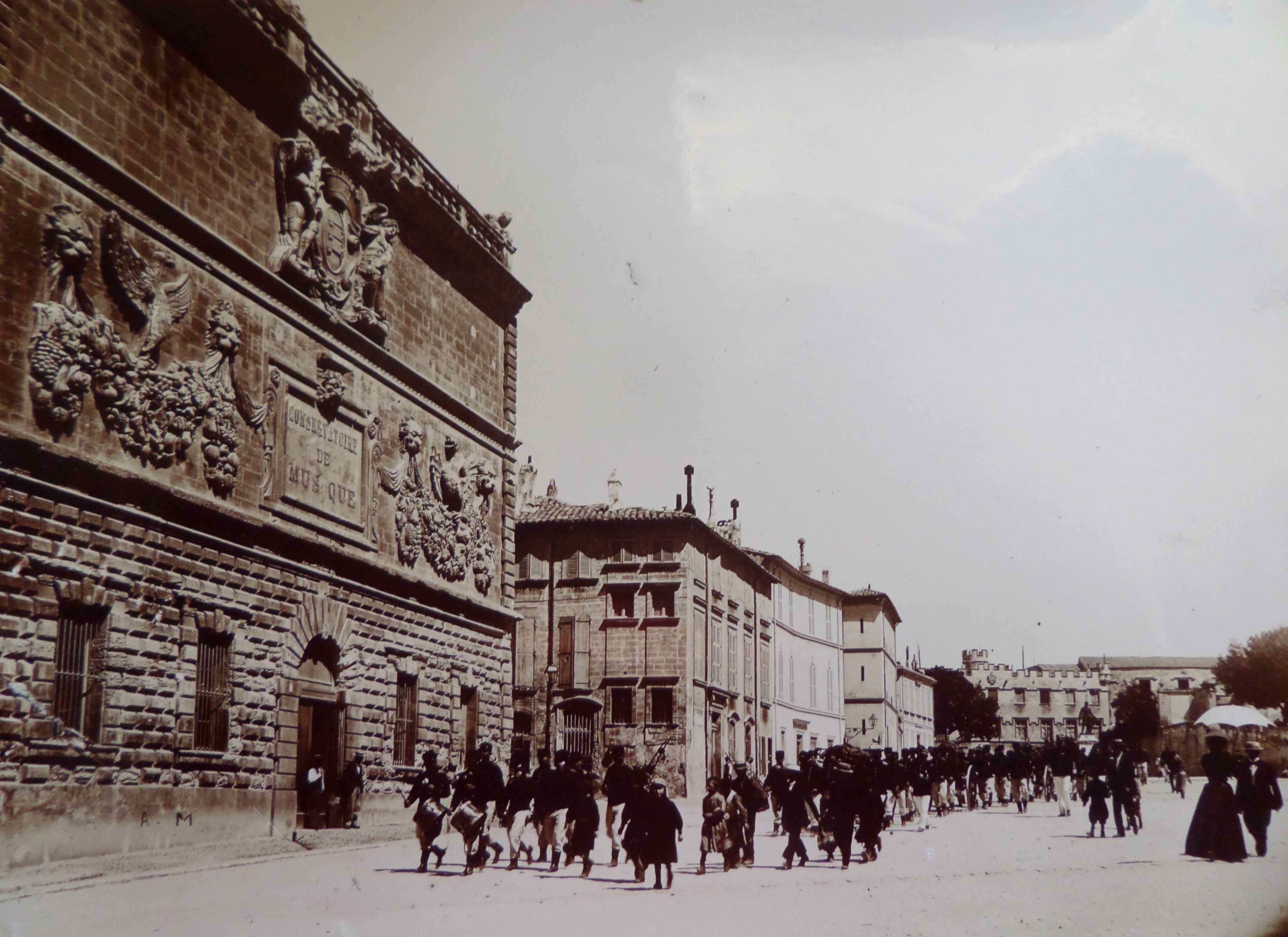 qui traverse la place du Palais des Papes, pour se rendre sur la place de l’Horloge et la rue de la République. En quelles circonstances? L’absence de légende ne nous permet pas de le savoir.
