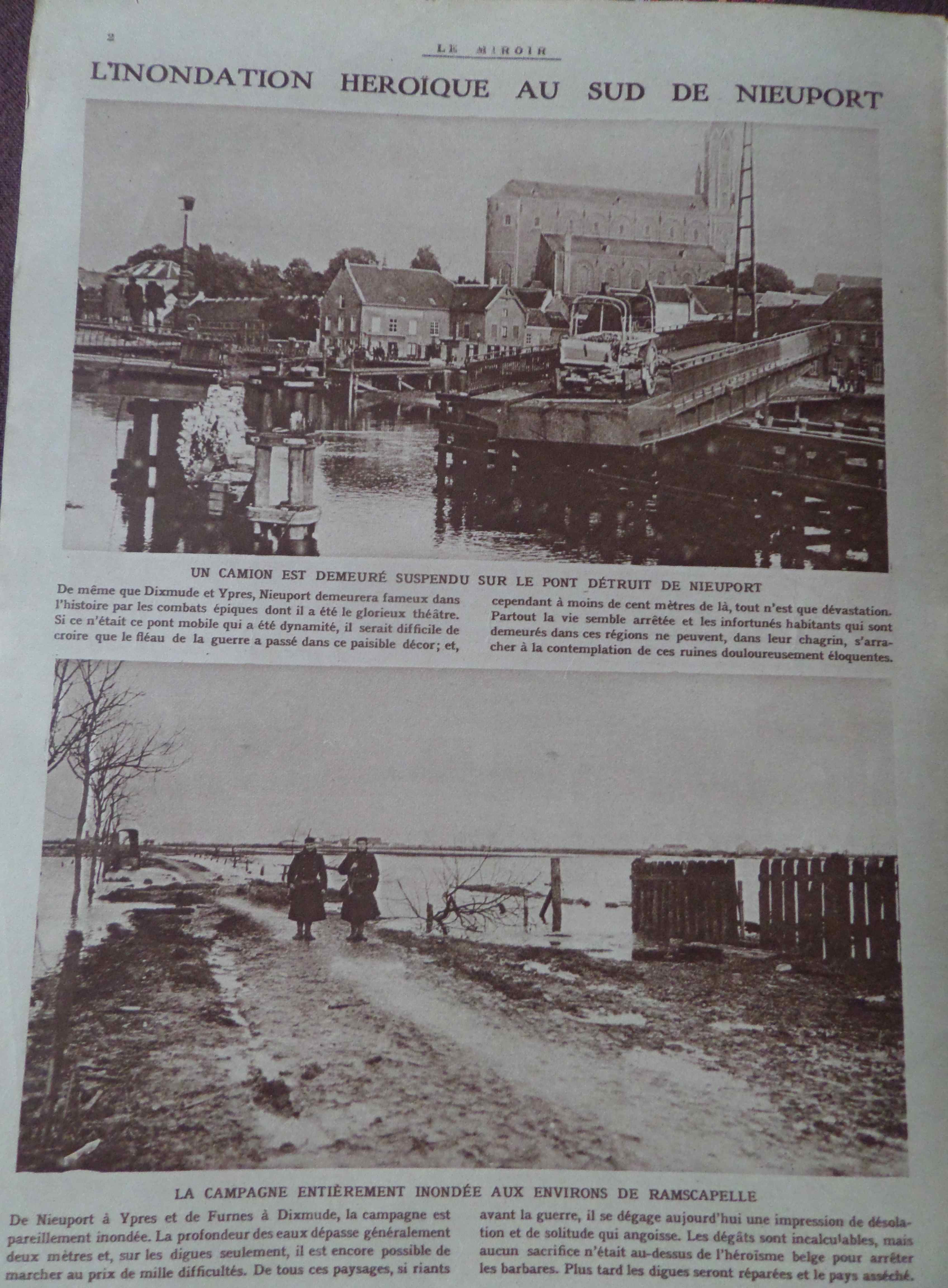 en haut la destruction d’un pont métallique à Nieuport, en bas les terres inondées de Flandre occidentale.