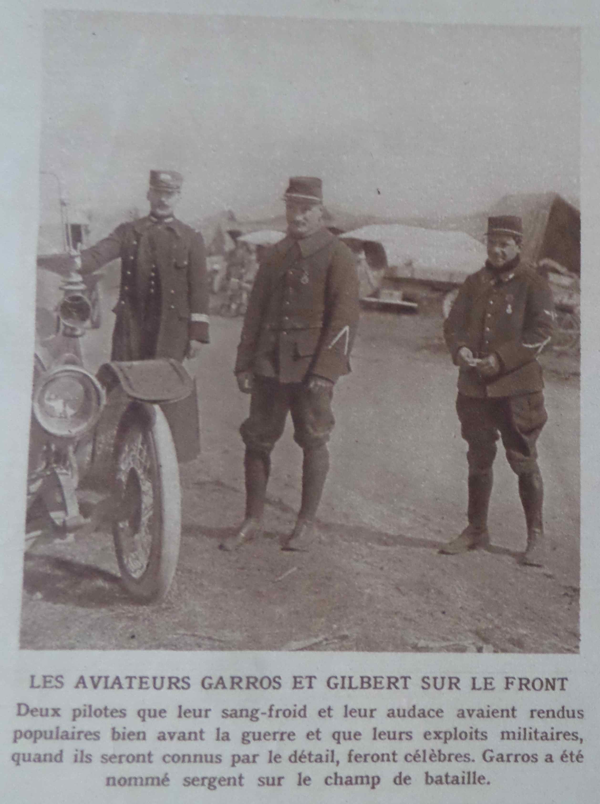 une photo de Roland Garros au centre que le tennis rendra célèbre ! A ses côtés Gilbert. La légende de la vue dit que Garros vient d’être nommé sergent. Il sera tué plus tard lors d’un combat aérien, un mois avant la fin de la guerre et le stade de tennis de Paris du bois de Boulogne prendra son nom 10 ans plus tard.