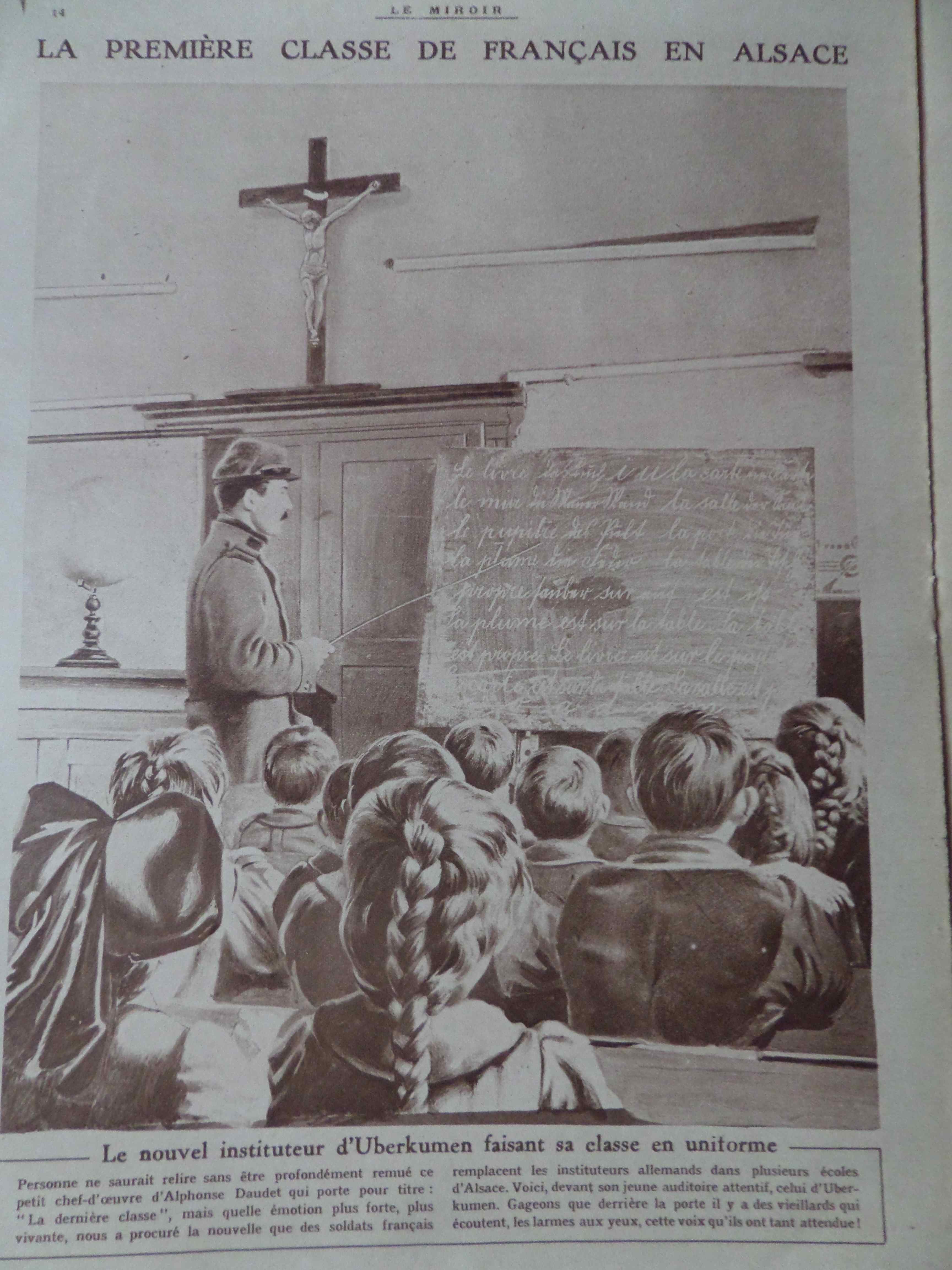 montrant un instituteur-soldat (ayant remplacer l’instituteur allemand) ré-alphabétiser en français l’Alsace, à Ueberkumen proche de Mulhouse. De la pure propagande, l’Alsace n’ayant guère été libérée avant 1918.