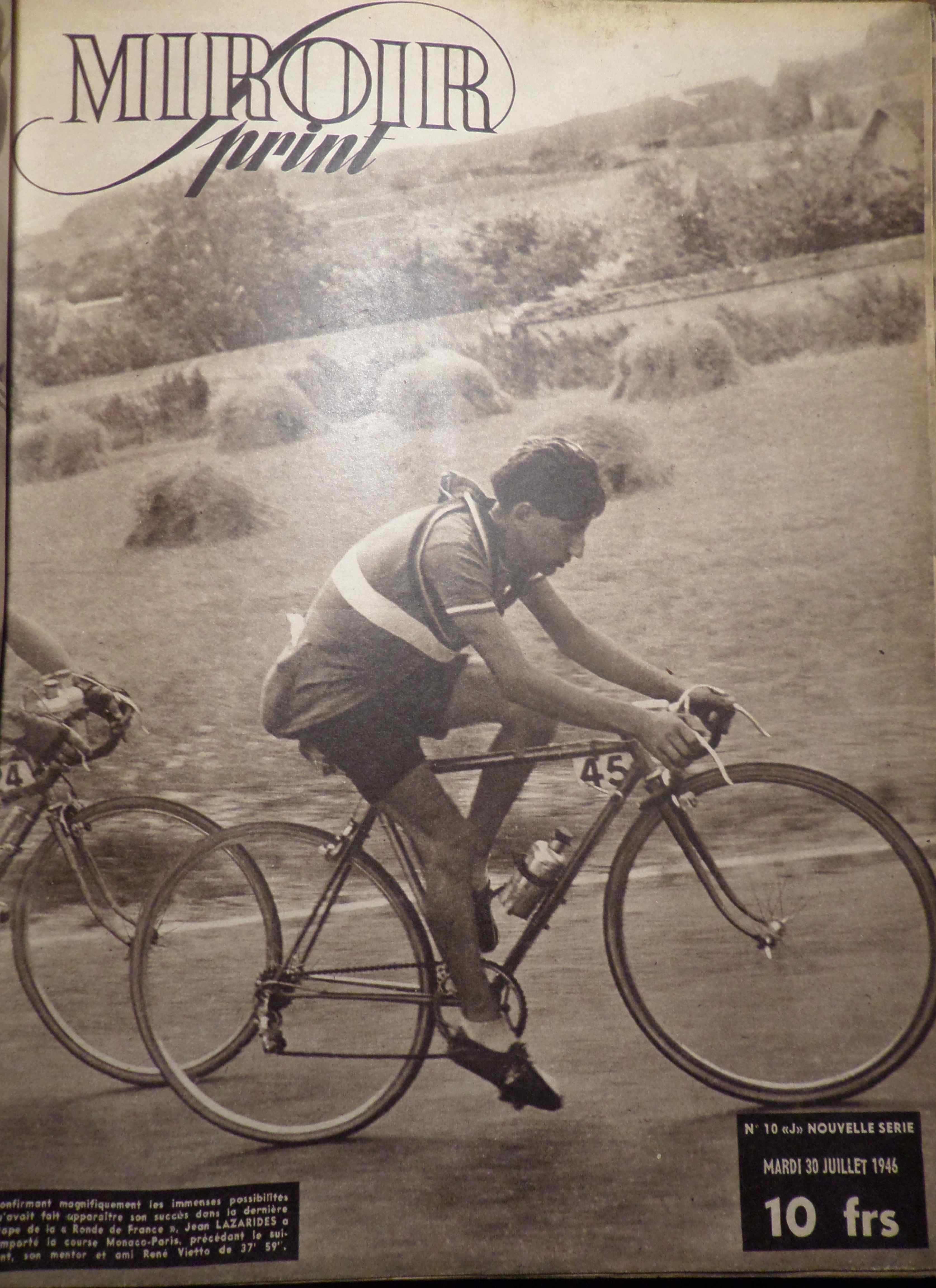 Seconde épreuve de ce mois de juillet 46, Monaco-Paris avec cette Une du décidément intenable Apo Lazaridès dans le Miroir Sprint du 30 juillet 1946: