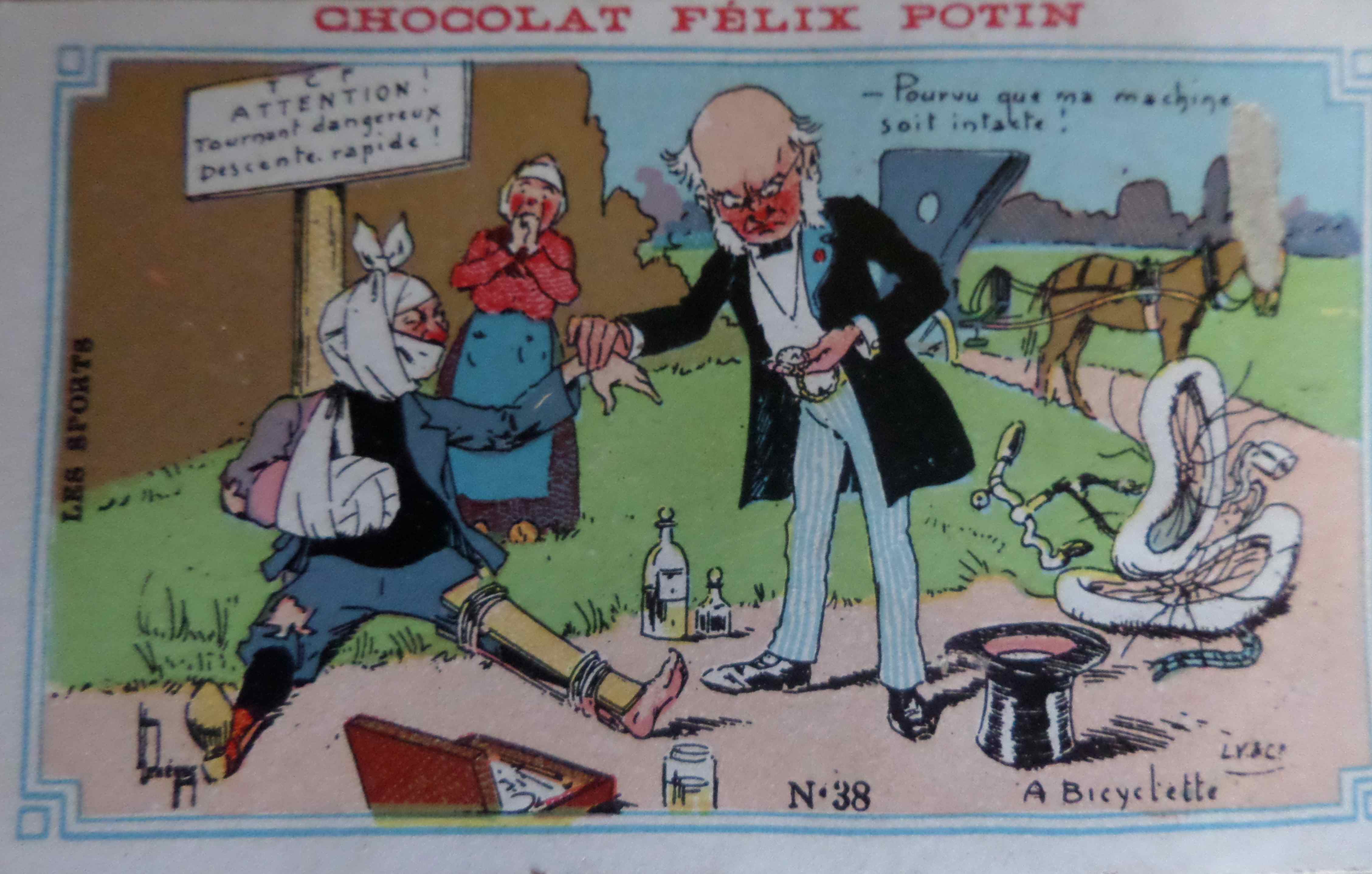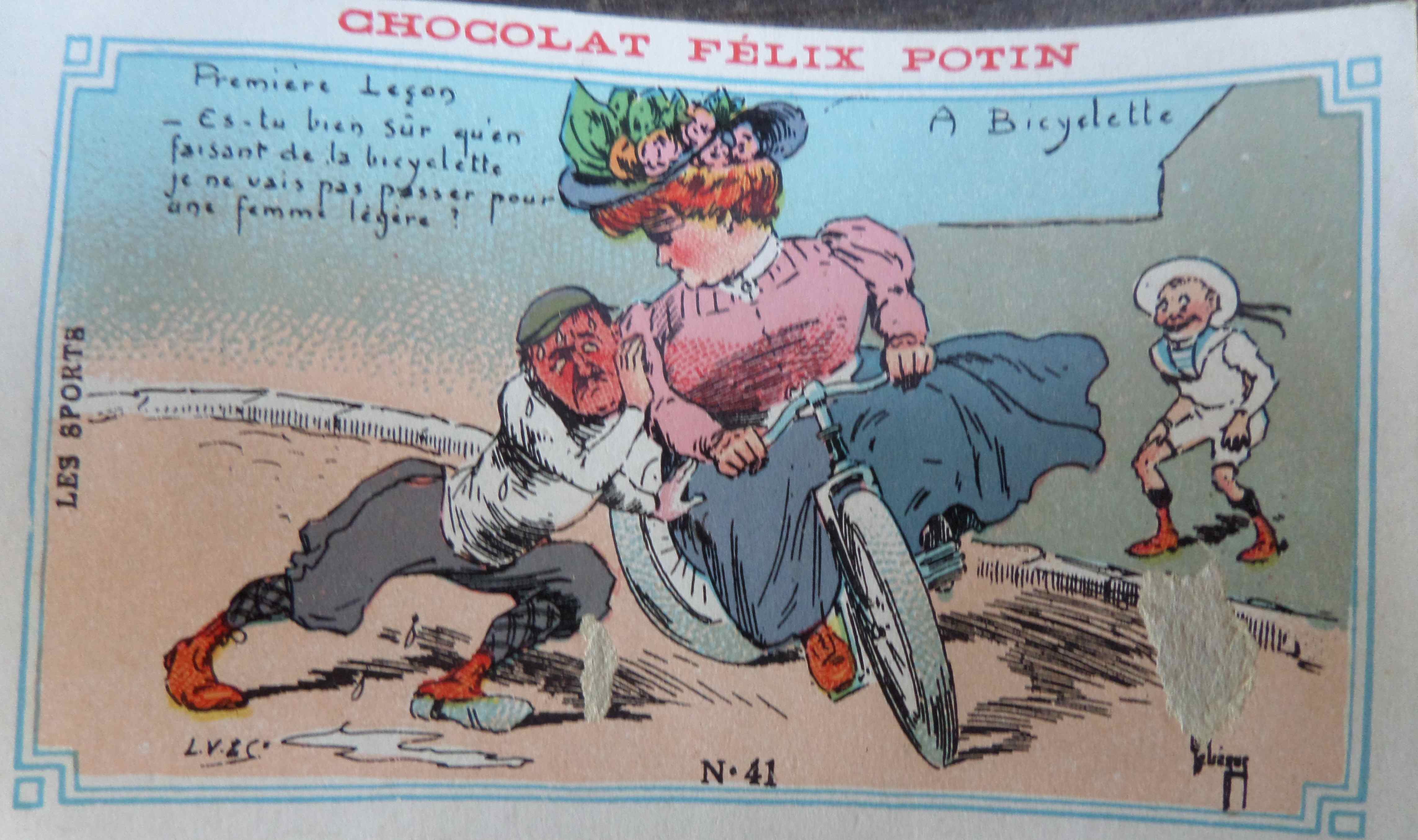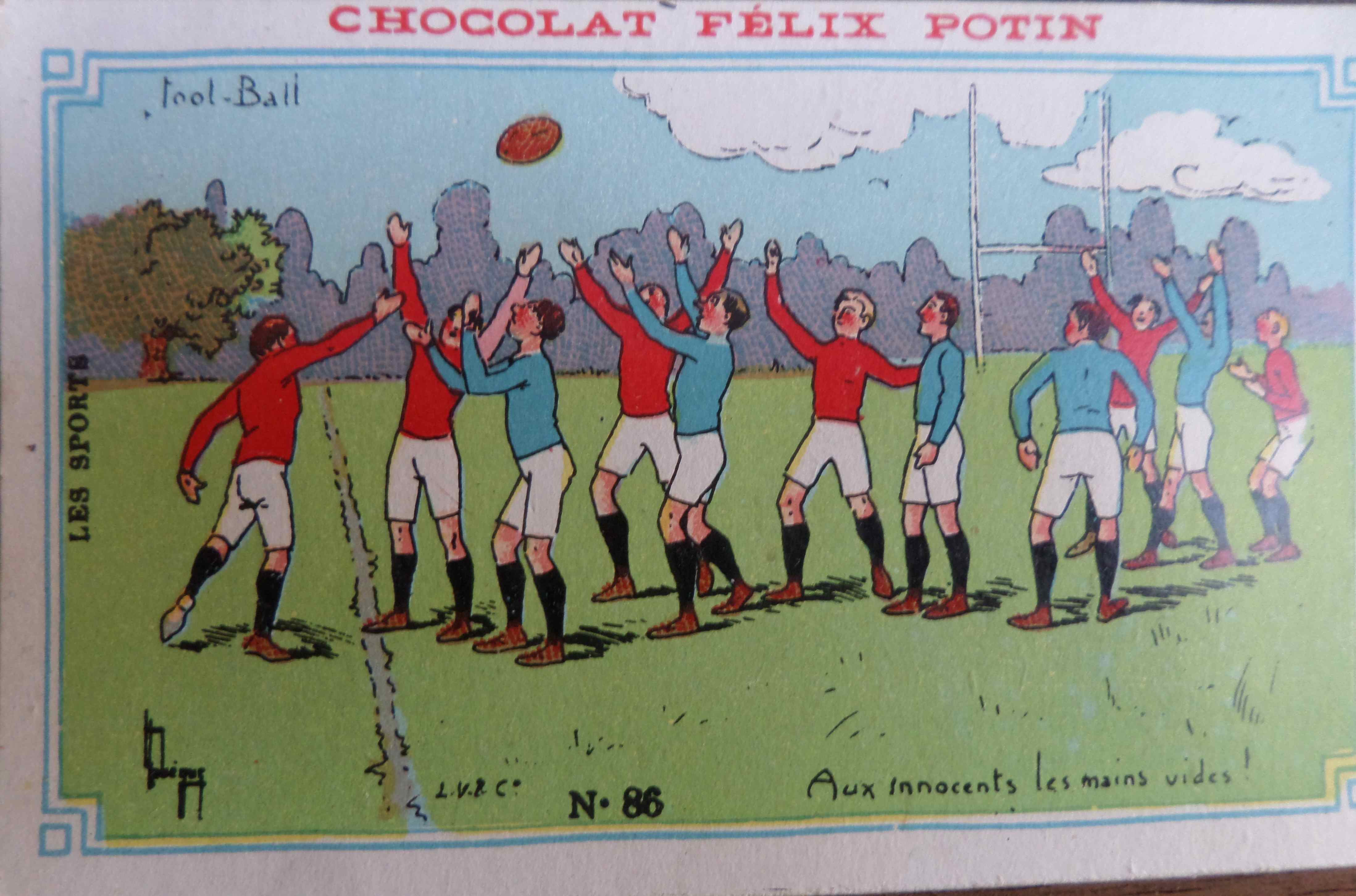 Quelques images humoristiques distribuées par le Chocolat Félix Potin fin XIXème siècle, début XXème siècle. Nous sommes au tout début de la bicyclette et du cyclisme et le rugby se fait encore appeler football.