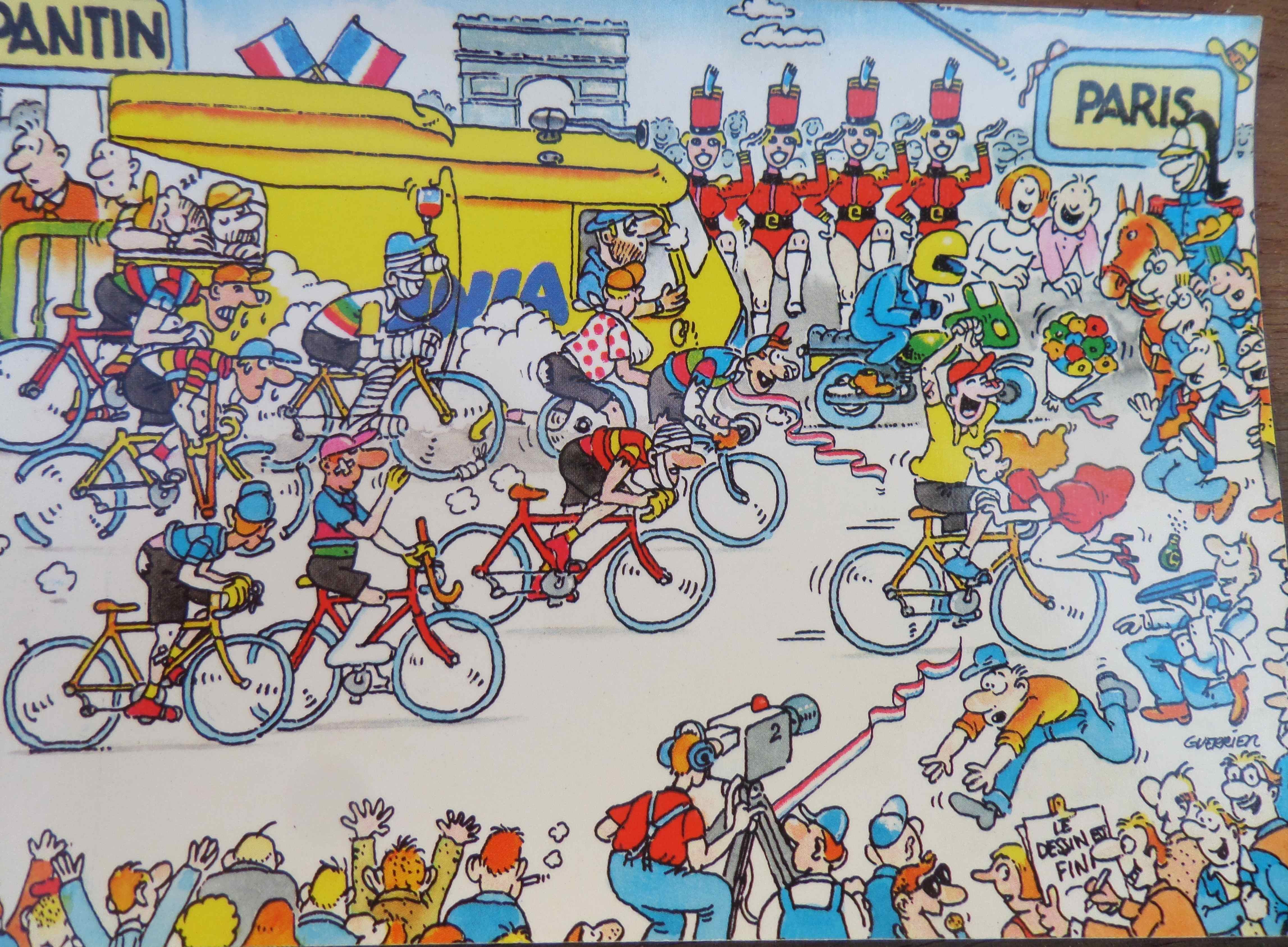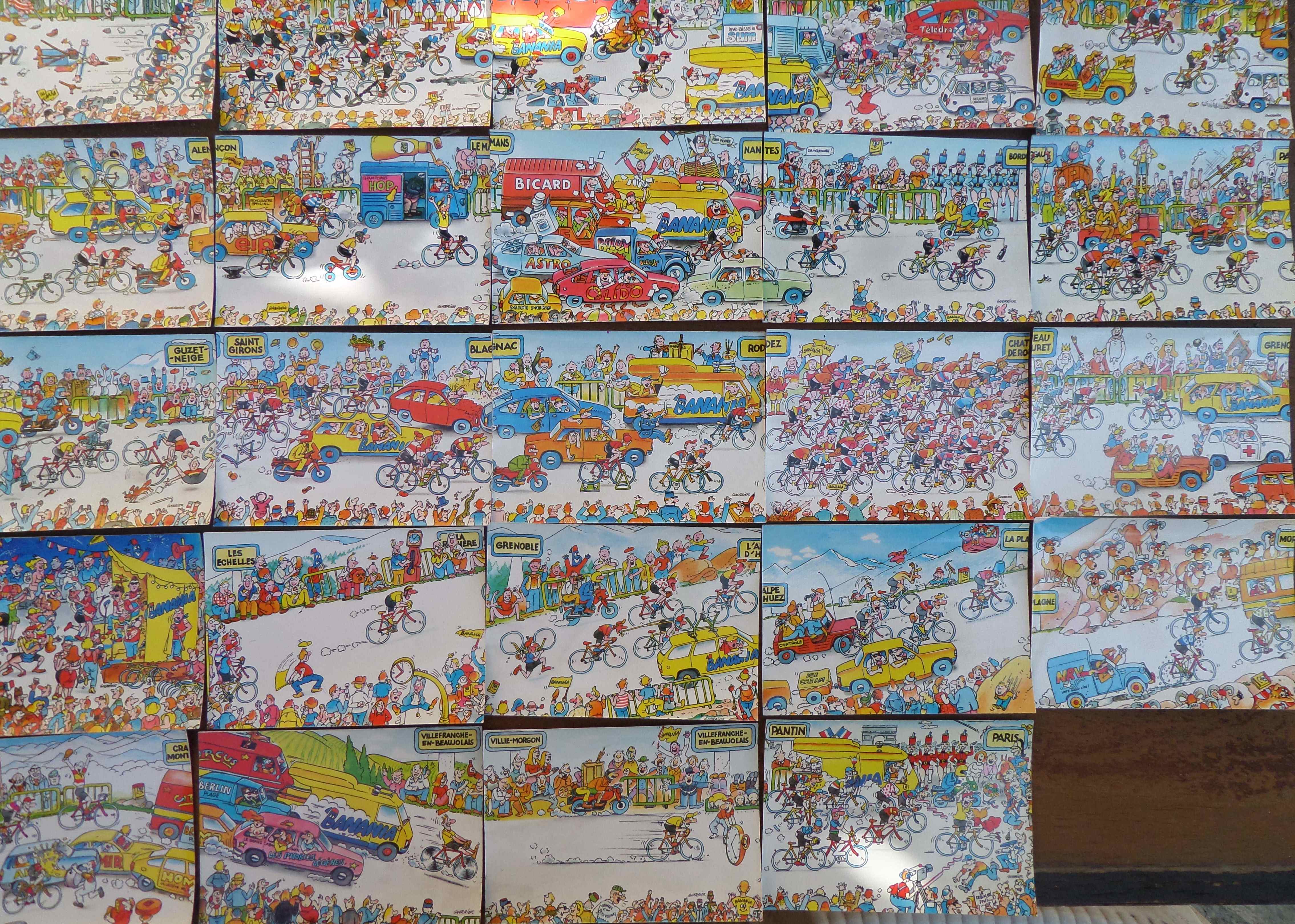Le dessin de chaque carte se poursuit par la droite avec celui de la carte suivante par les spectateurs, les cyclistes et même le nom de la ville étape quand celle-ci avait la chance d’accueillir à la fois l’arrivée le soir et le départ le lendemain. Mises bout à bout, cela fait donc une longue frise de 3 mètres 60!