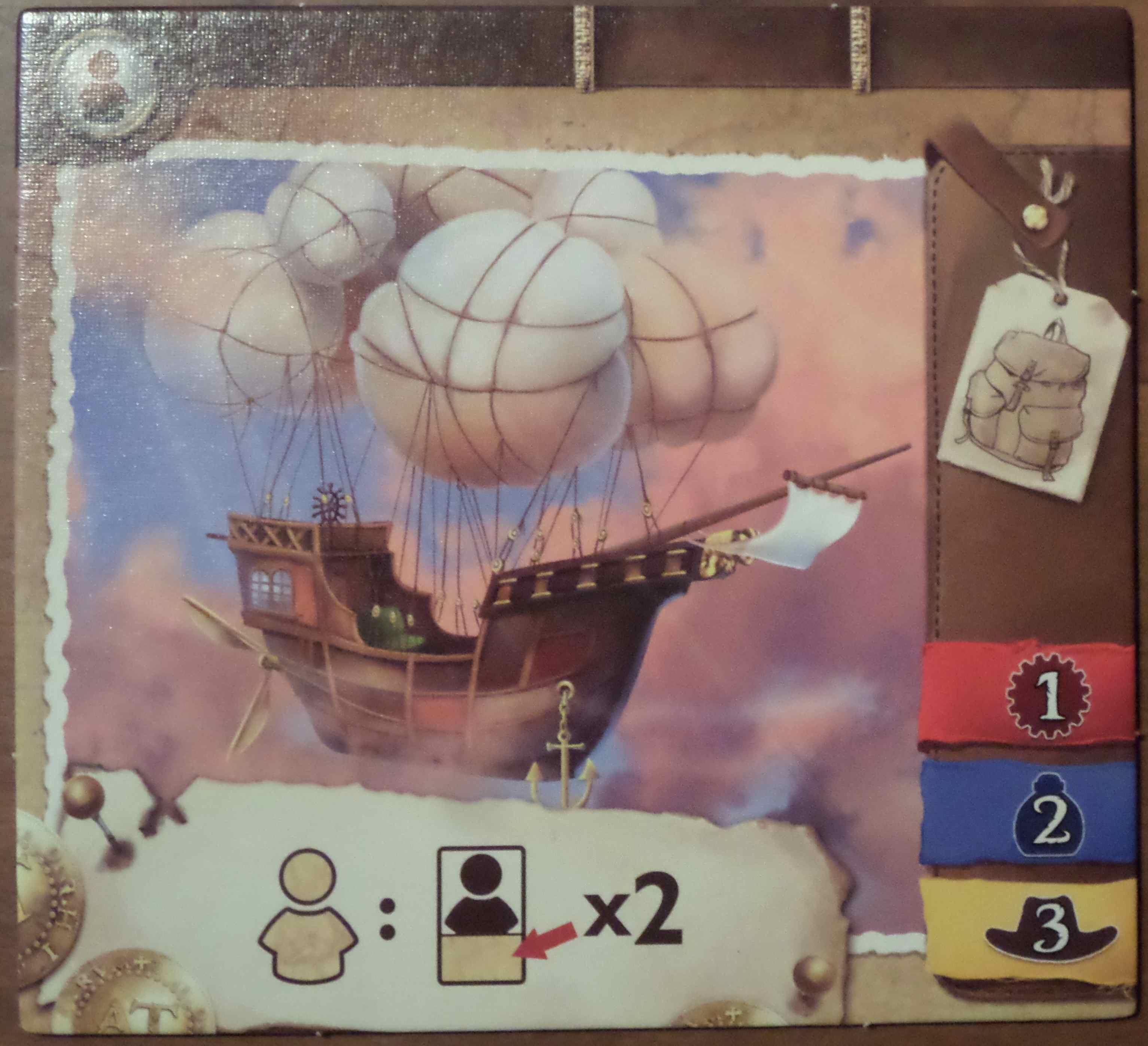 Pour cette expédition en bateau volant, on ne part qu’avec 1 en technique, 2 en vivres et 3 en vêtements. Par contre quand on pose un aventurier, on applique 2 fois son pouvoir ! Tout autant redoutable !