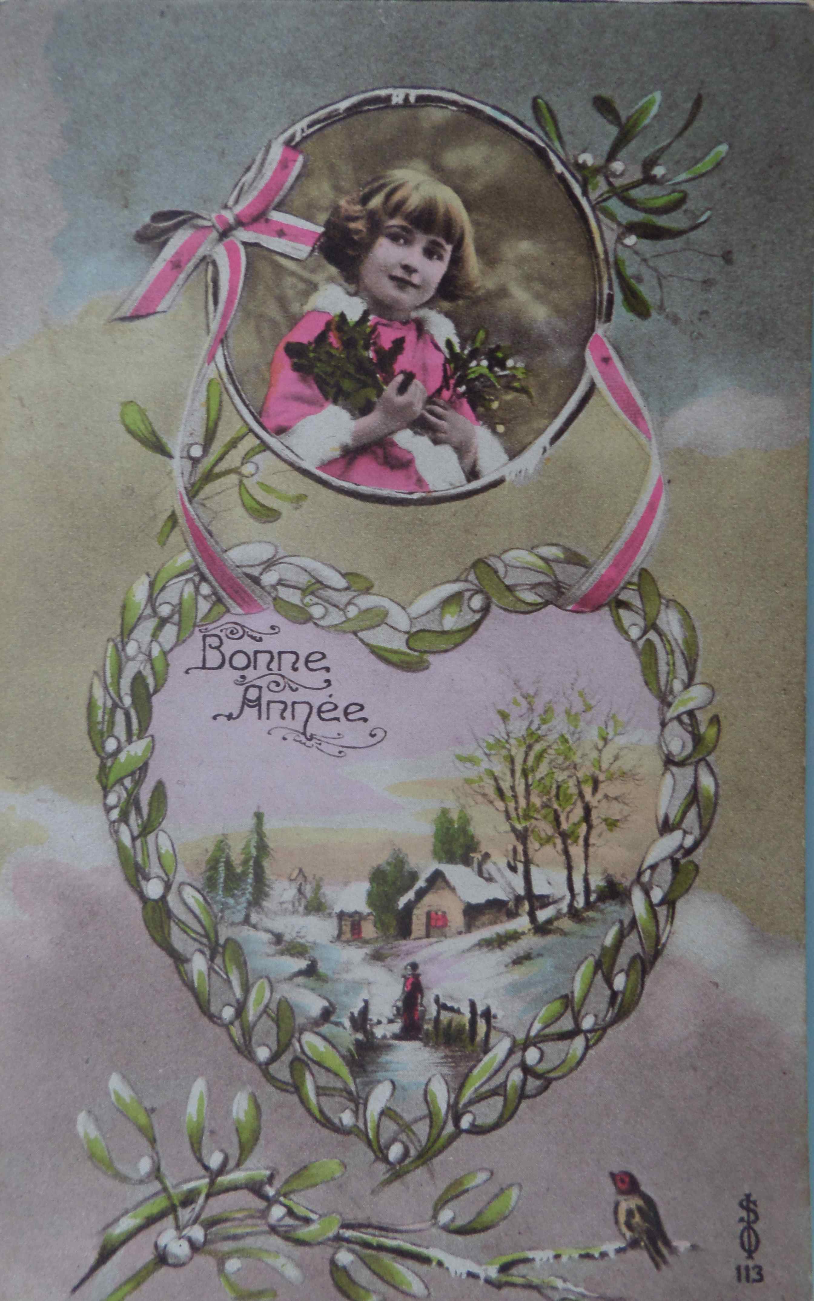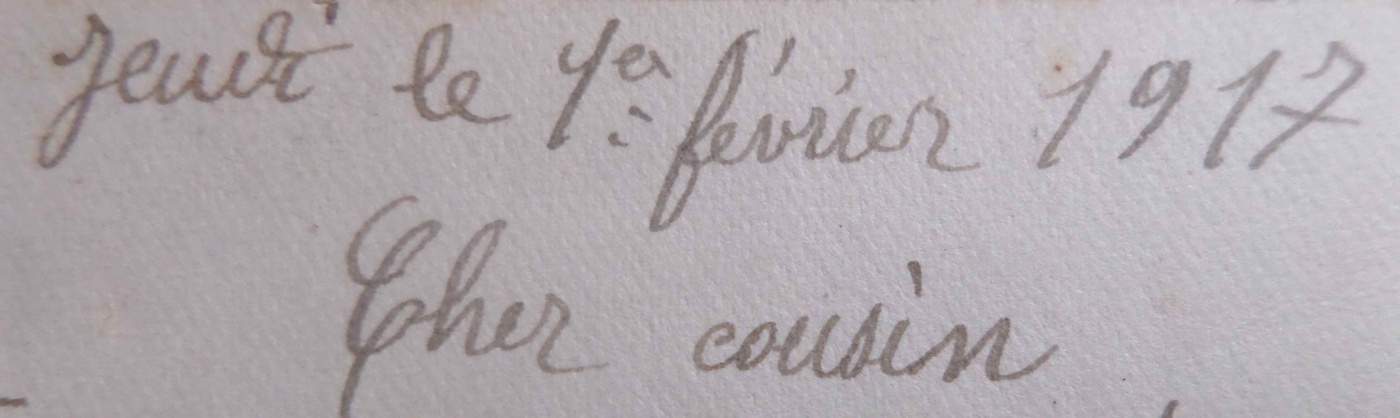 Une carte fantaisie envoyée à l’artilleur alpin Séraphin Guérin par sa cousine (du côté de sa mère) Marie Radelet le 1er février 1917.