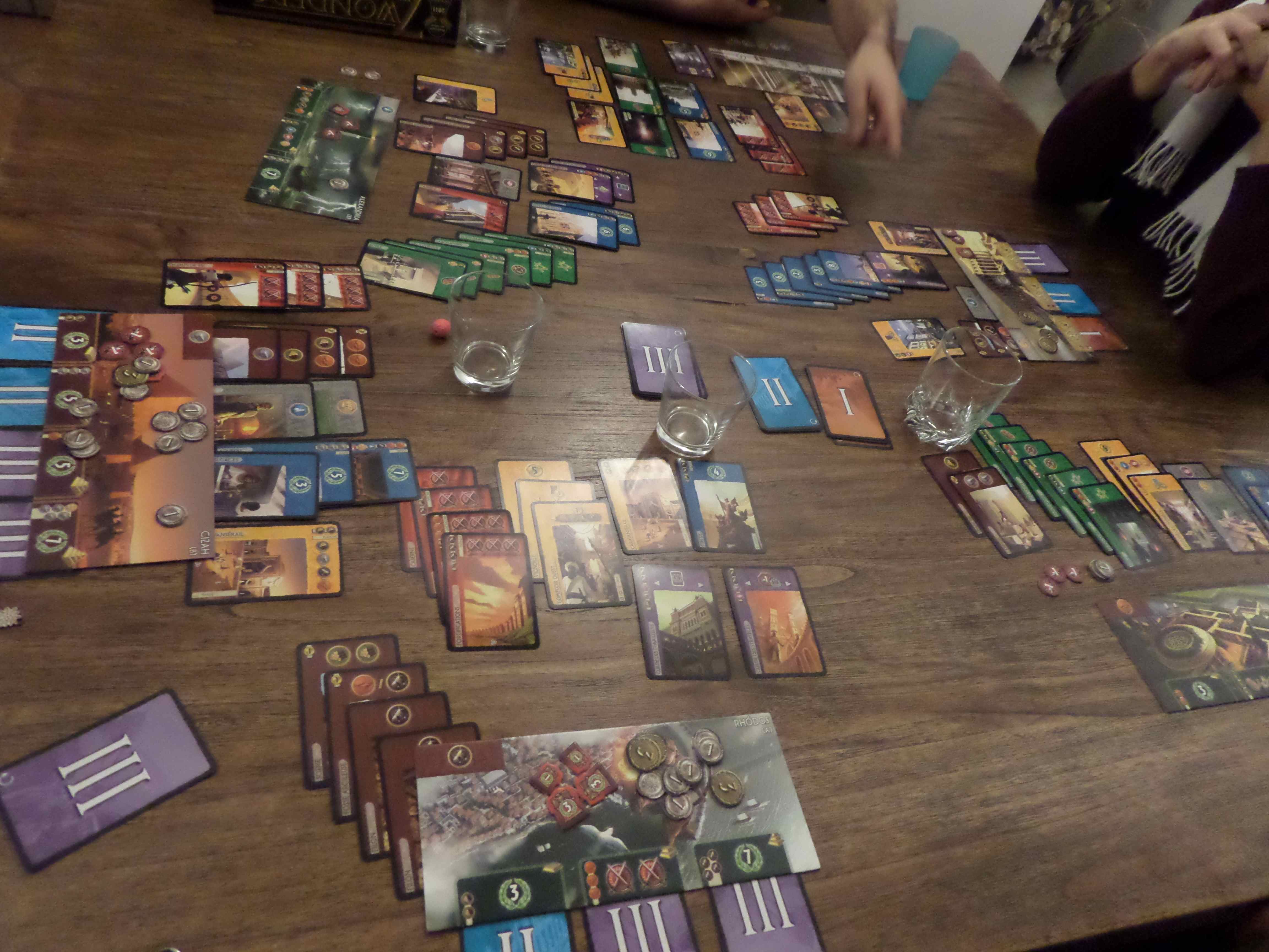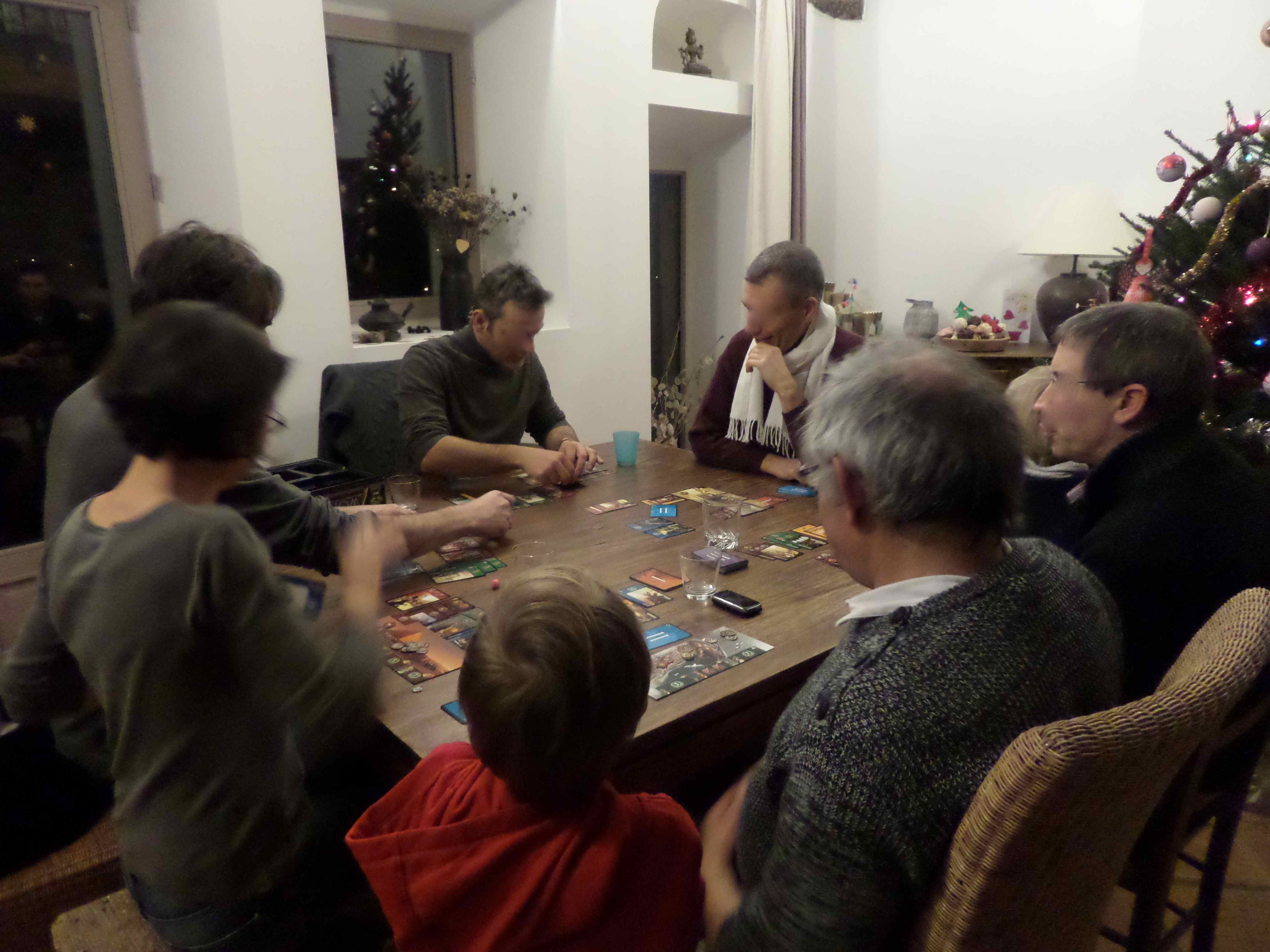 Théo est fan de 7 WONDERS, le jeu de cartes primé à Cannes en 2011. Alors, il a acheté une table en fonction sur laquelle 6 joueurs (euse) peuvent s’y retrouver sans se gêner et où un septième aurait eu sa place. Pas un gros jeu, mais on en comprend toutes les finesses après quelques parties… développer les techniques, développer le militaire, aller chercher les cartes bleues qui donnent des points de victoire cash, chercher les guildes en s’appuyant sur ce qu’on fait ses 2 voisins immédiats. Ghislain découvrait pourtant le jeu et il a remporté la victoire avec 53 points, victoire que j’aurais pu lui contester si je n’avais pas oublié de prendre des pièces quand j’ai posé une carte jeune (51 points au final).