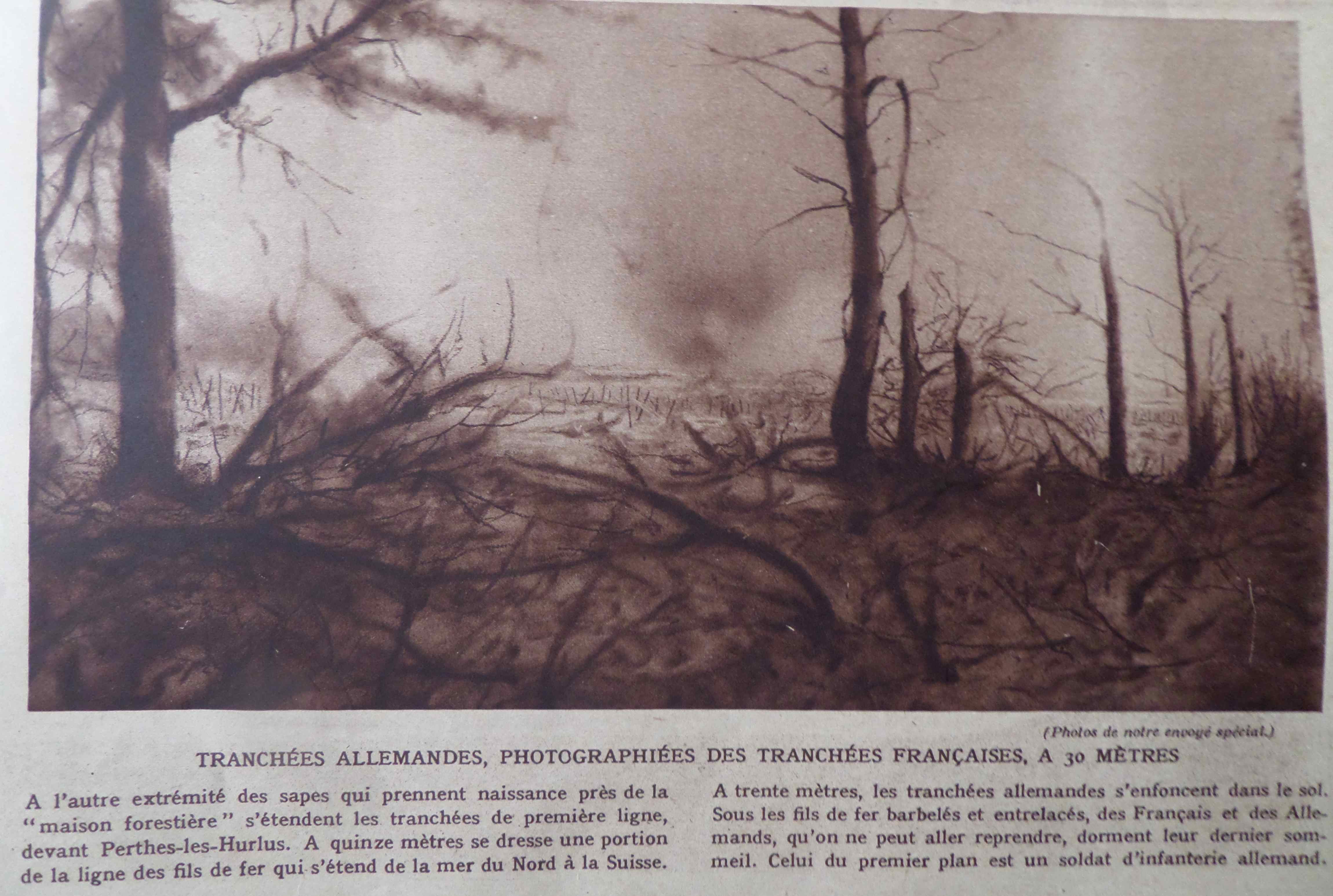 Cette photo retouchée a eu le mérite d’être prise près de la ligne de front. Les arbres sont déchiquetés. Nous sommes à Perthes-lès-Hurlus, commune rayée de la carte après septembre 1914 et qui ne sera jamais reconstruite. 29 communes sont dans ce cas: 9 dans l’Aisne et dans la Meuse, 7 dans la Meuse et 4 en Meurthe-et-Moselle sans compter les innombrables villages du Nord, Pas-de-Calais, Somme qui durent être entièrement refaits.