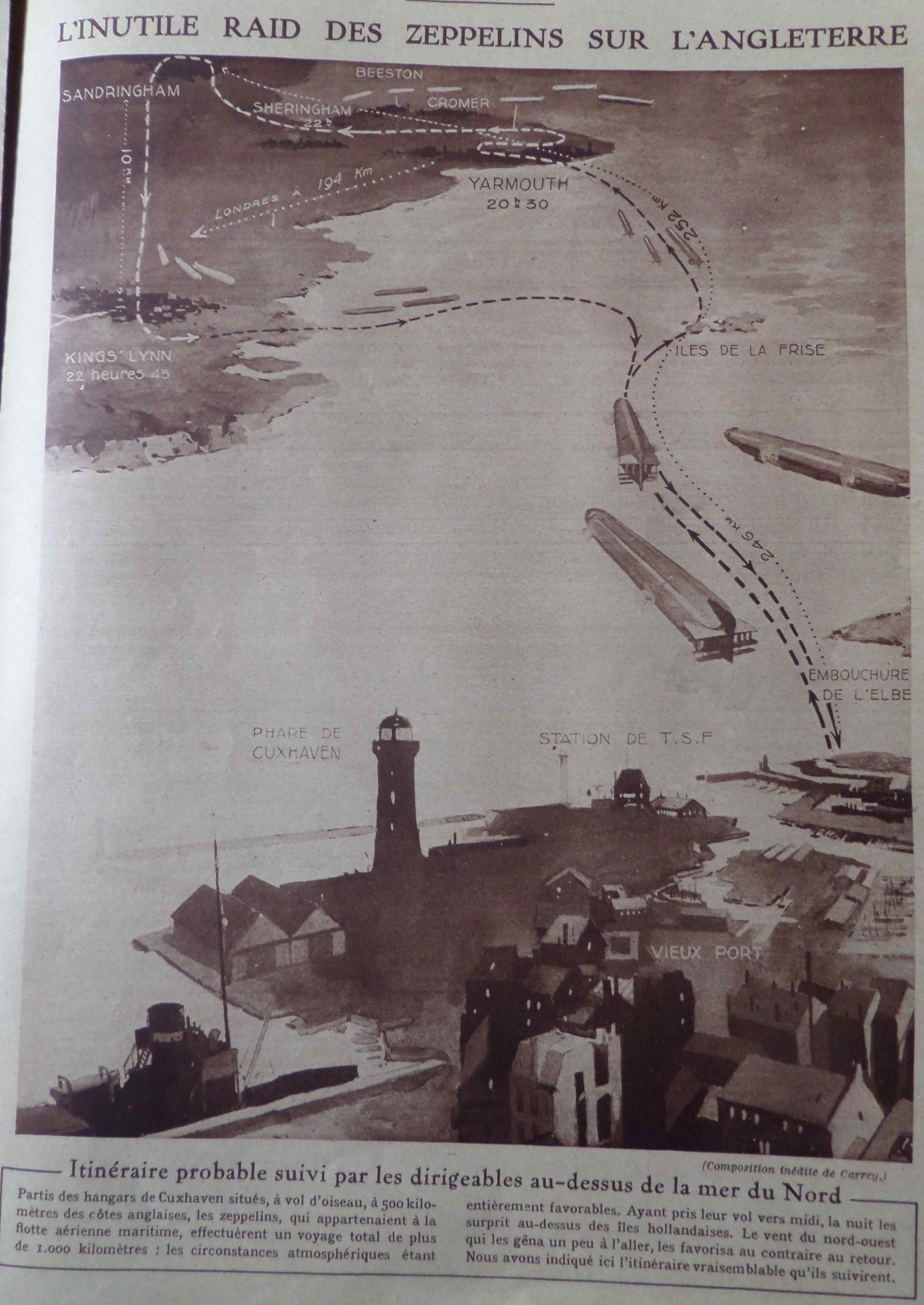 Le dessin de Carrey pour expliquer le périple de 1000 km d’un groupe de Zeppelin partis bombarder les côtes anglaises.