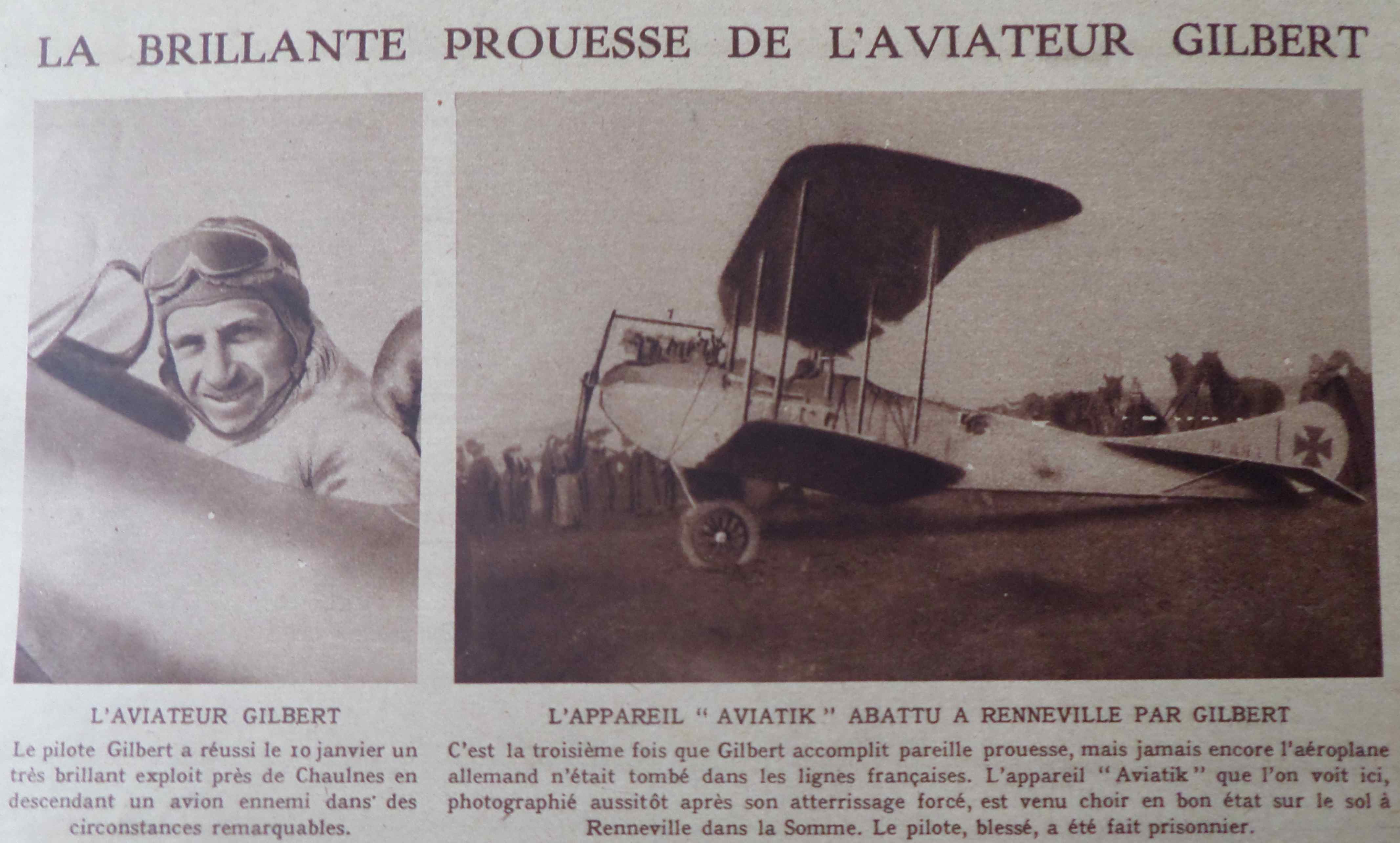 L’exploit de l’aviateur Eugène Gilbert qui réussira à abattre (à forcer à se poser) un Aviatik allemand dont l’observateur fut tué. On voit l’impact de la balle mortelle qui a traversé le radiateur de l’avion allemand pour atteindre mortellement le lieutenant von Falkenstein.