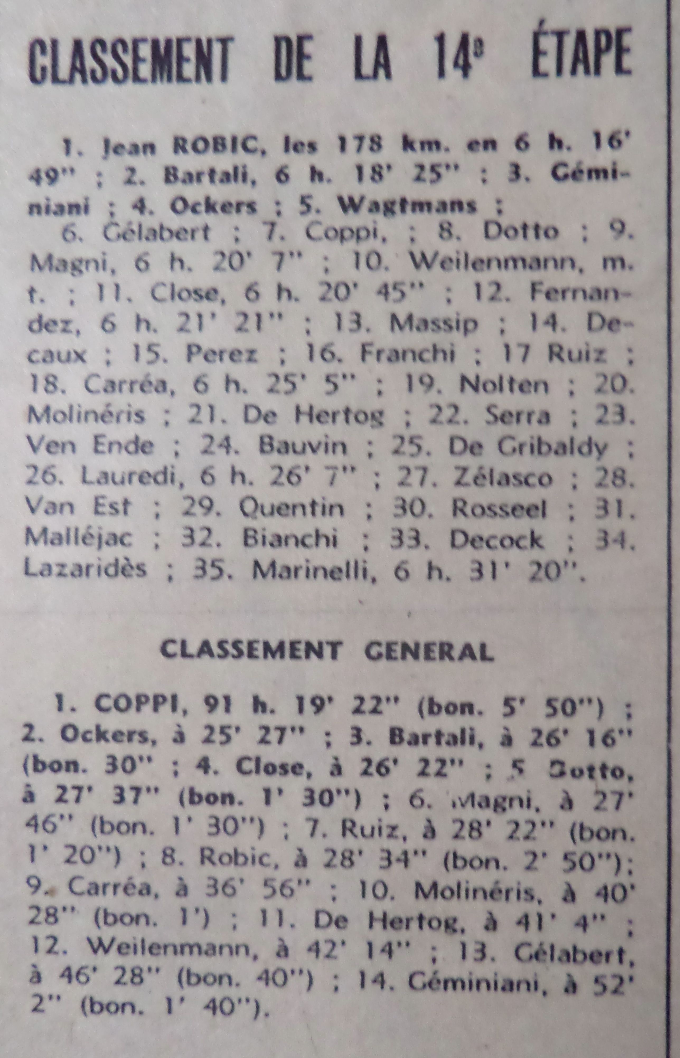 où l’on voit que Coppi possède maintenant plus de 25 minutes d’avance sur son second, le Belge Stan Ockers.