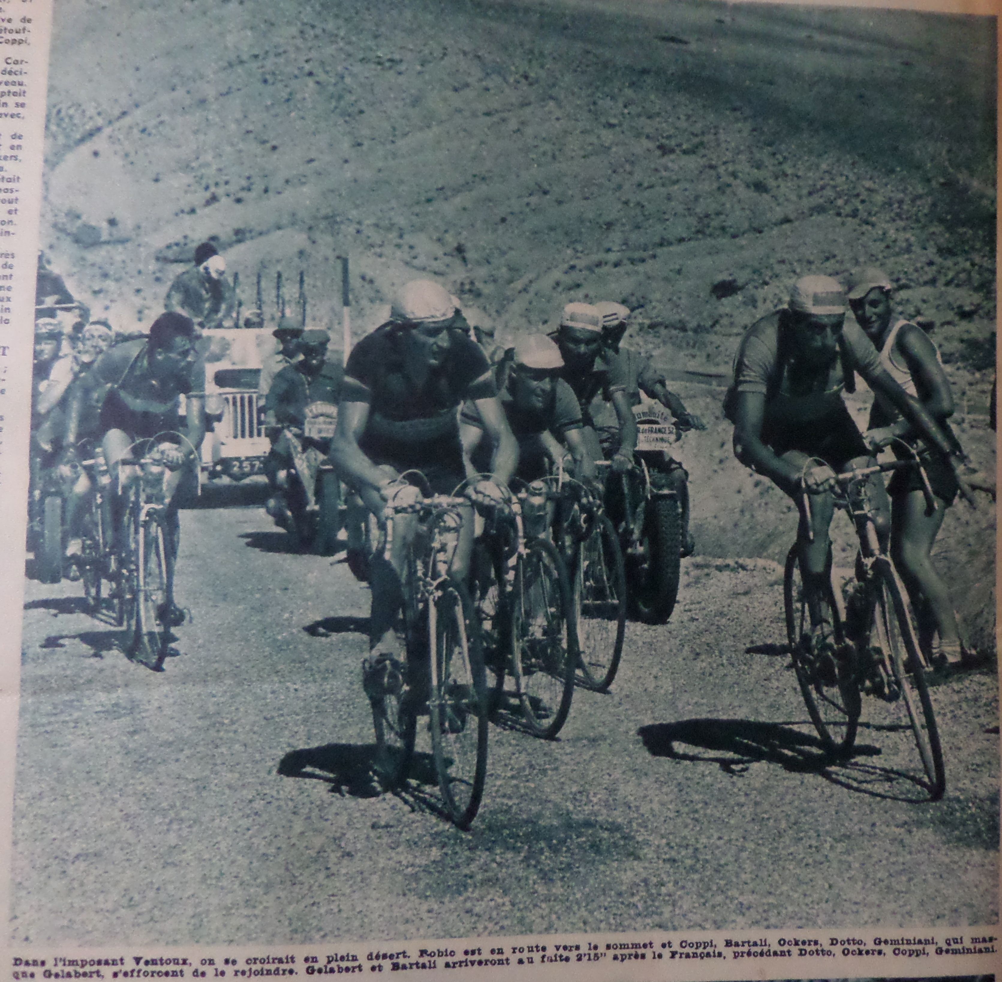 Les photo-reporters voulurent aussi immortaliser l’image d’un Coppi en chasse derrière le Breton, chose rarissime dans ce Tour où le champion italien était le plus souvent loin devant les autres.