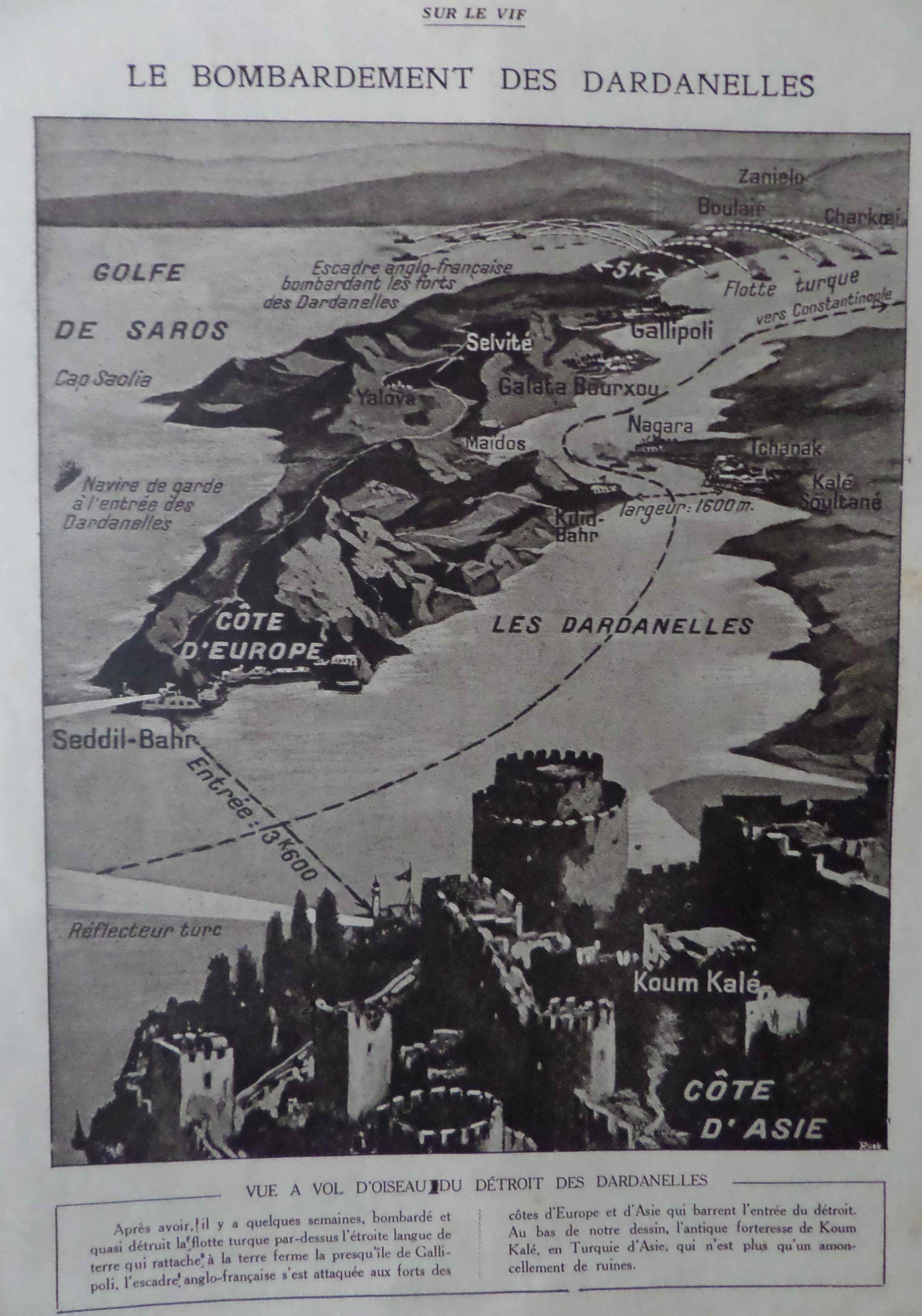On y voit la flotte anglo-française bombardant les positions turques après avoir détruit la flotte ottomane. Dans le commentaire, on nous dit que l’ancienne forteresse de Kalé n’est plus qu’un amoncellement de ruines. Tiens ! ce n’est pas barbare de détruire un monument antique comme on l’a dit il y a peu, pour les bombardements allemands sur la cathédrale de Reims ?