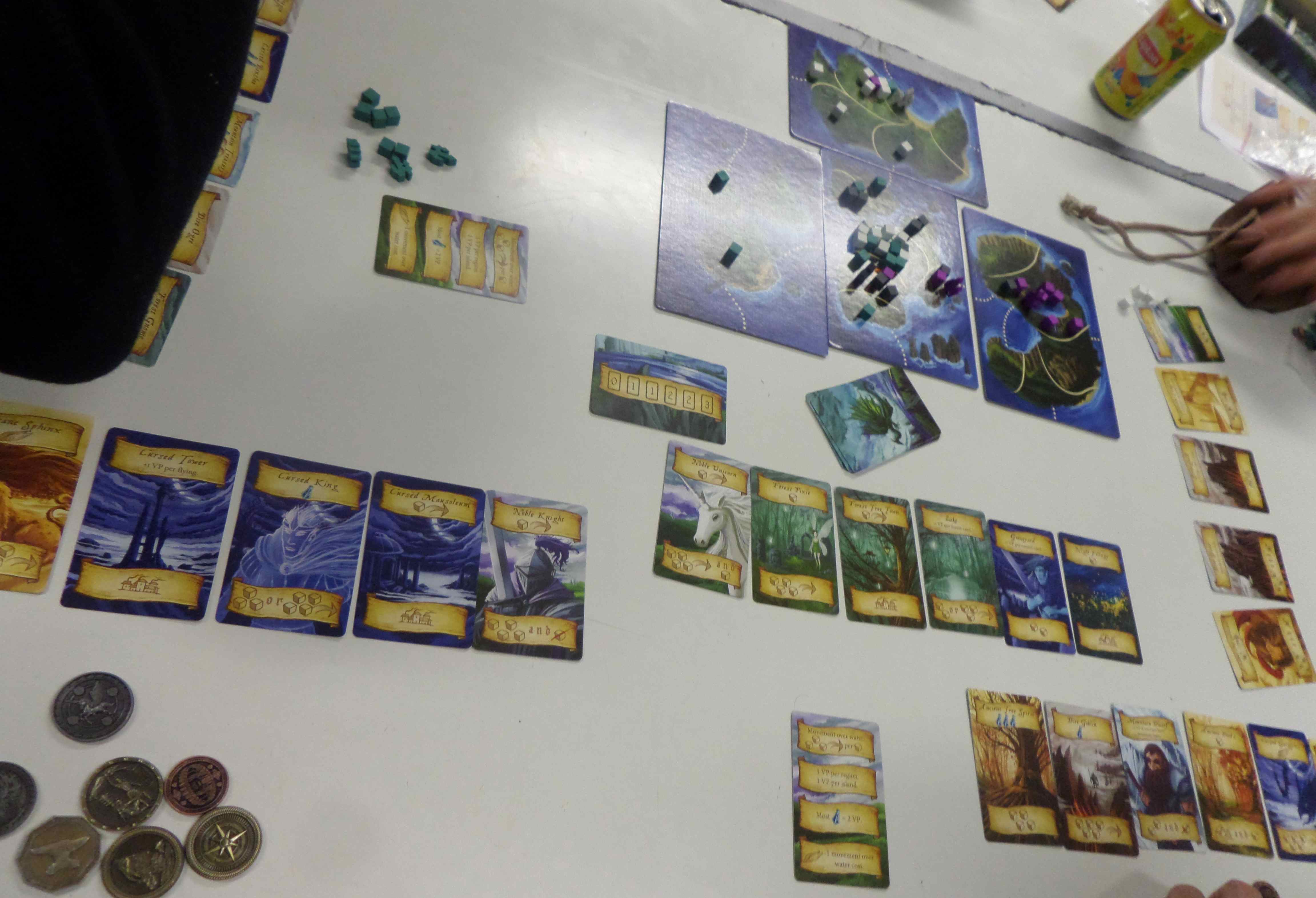 …sur des îles, dans un univers médiéval fantastique. Pas de réelles nouveautés. Sympa et rapide… plus de 8 minutes certes mais moins de 30 ! Et avec les authentiques (fausses) pièces anciennes de Sylvain comme monnaie du jeu, en métal, dans une vraie bourse,… Bien mieux que des petits cercles de carton !