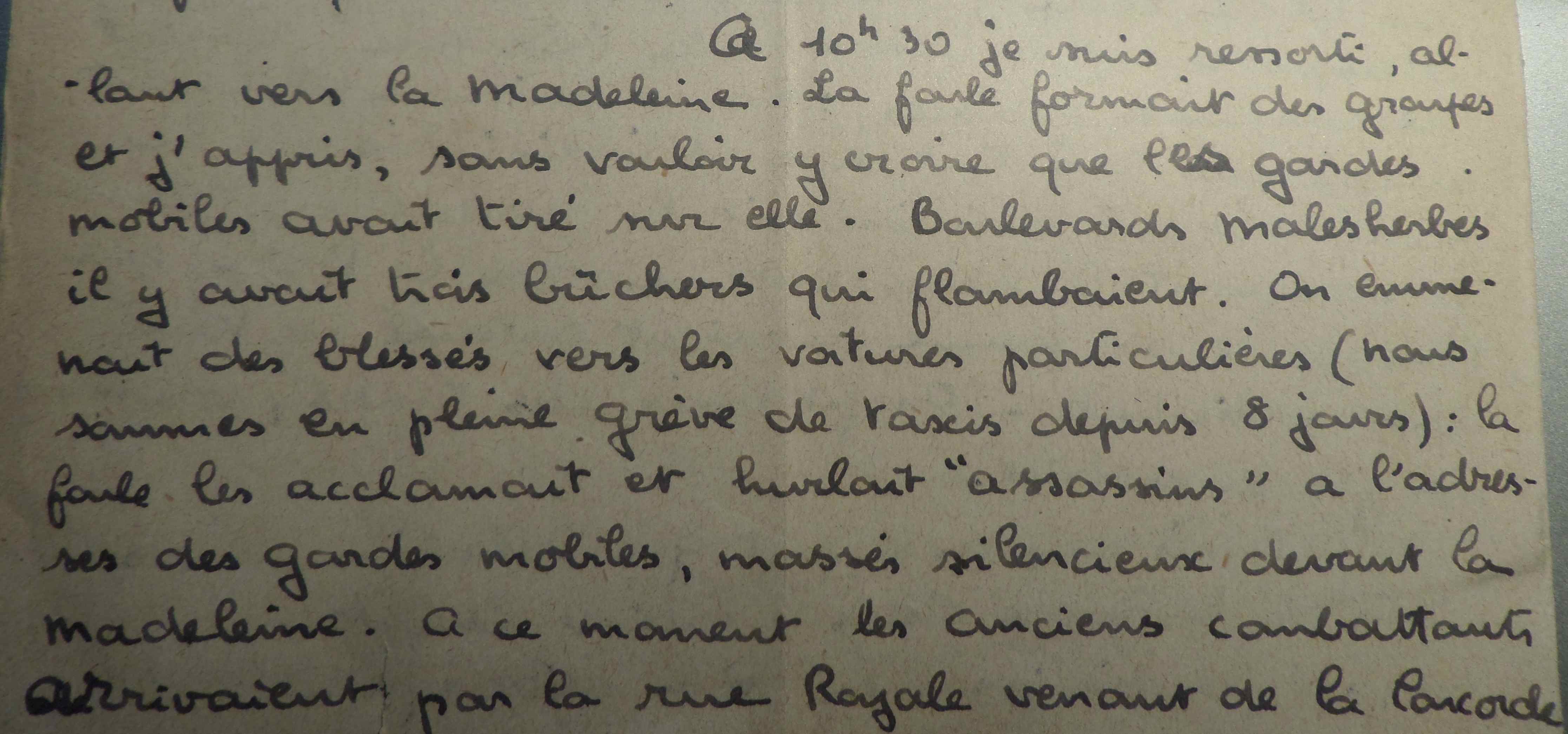 A 10h30 (22H30), je suis ressorti, allant vers la Madeleine. La foule formait des groupes et j’appris, sans vouloir y croire que les Gardes Mobiles avaient tiré sur elle. Boulevard Malherbes, il y avait trois bûchers qui flambaient. On emmenait des blessés vers les voitures particulières (nous sommes en pleine grève des taxis depuis 8 jours). La foule les acclamait et hurlait « Assassins » à l’adresse des Gardes Mobiles massés silencieusement devant la Madeleine. A ce moment, les Anciens Combattants arrivaient par la rue Royale venant de la Concorde.