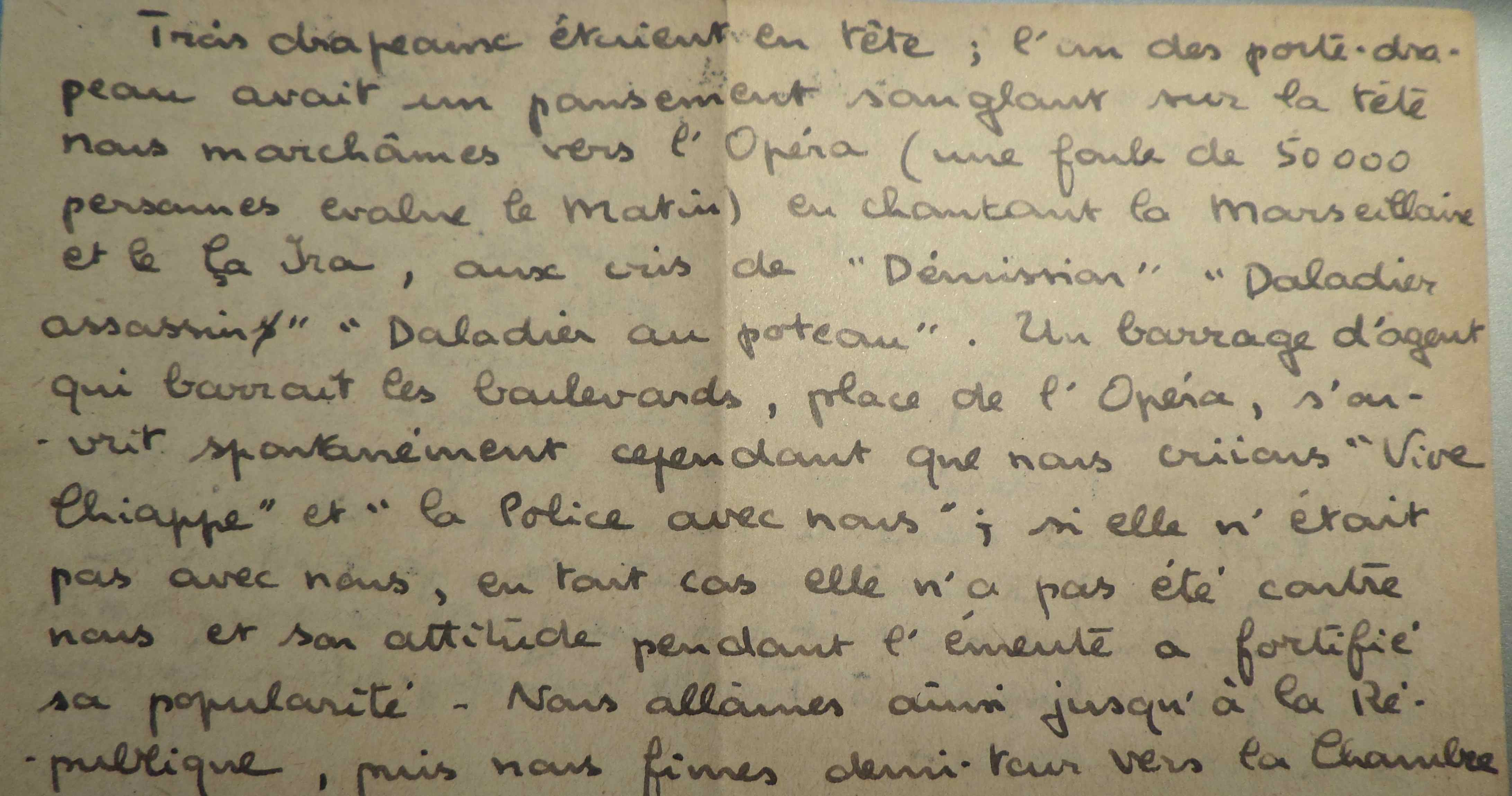 Trois drapeaux étaient en tête, l’un des porte-drapeau avait un pansement sanglant sur la tête. Nous marchâmes vers l’Opéra (une foule de 50 000 personnes envahit le Matin) en chantant la Marseillaise et le Ça Ira, aux cris de « Démission », Daladier assassin », « Daladier au poteau ». Un barrage d’agents qui barrait les boulevards, place de l’Opéra, s’ouvrit spontanément cependant que nous criions « Vive Chiappe » et « La Police avec nous ». Si elle n’était pas avec nous, en tout cas, elle n’a pas été contre nous et son attitude pendant l’émeute a fortifié sa popularité. Nous allâmes ainsi jusqu’à la République, puis nous fîmes demi-tour vers la Chambre.