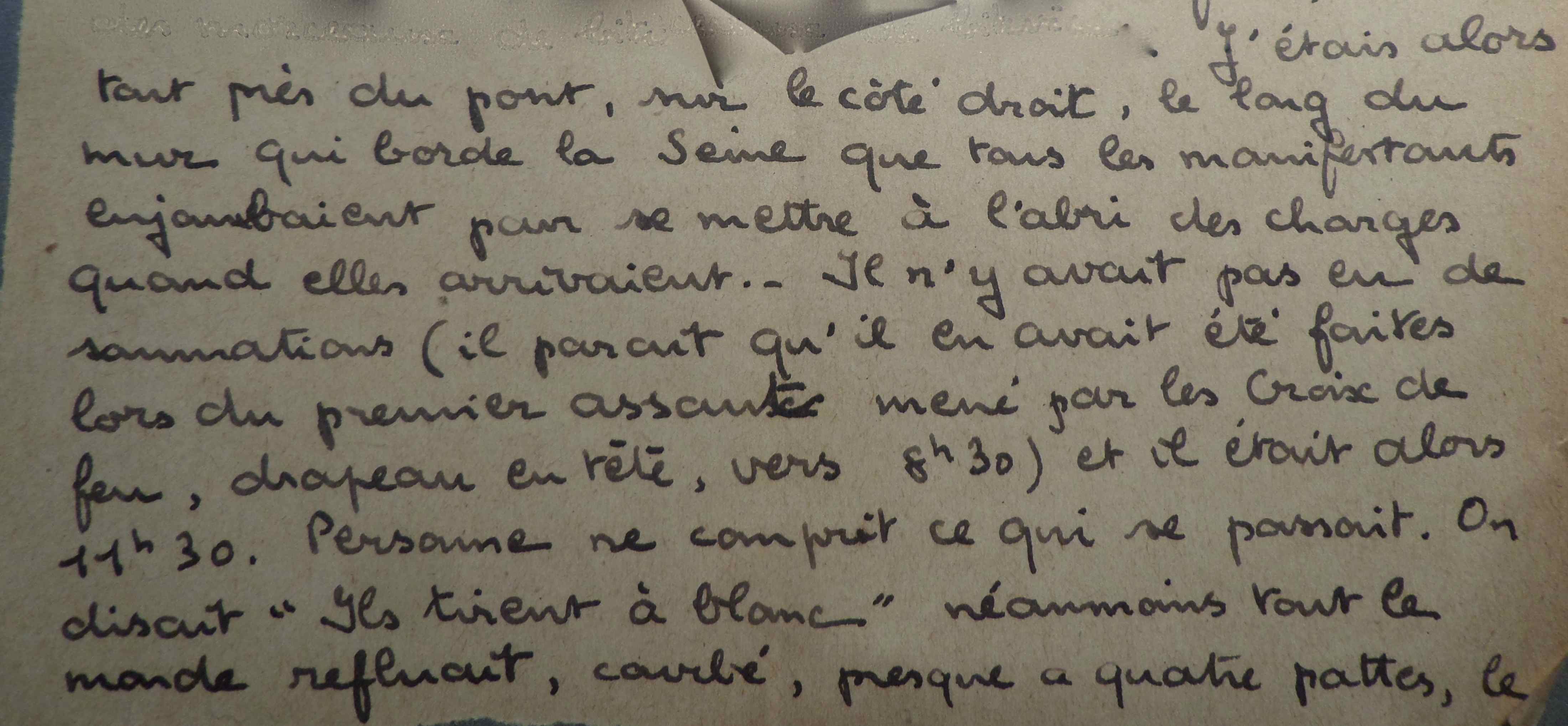 J’étais alors sur le pont, sur le côté droit, le long du mur qui qui borde la Seine que les manifestants enjambaient pour se mettre à l’abrides charges quand elles arrivaient. Il n’y avait pas eu de sommations (il paraît qu’il en avait été faites lors du premier assaut mené par les Croix de Feu, drapeau en tête, vers 8h30-22h30) et il était alors 11h30 (23h30). Personne ne comprit ce qui se passait. On disait « Ils tirent à blanc » néanmoins tout le monde refluait, courbé, presque à quatre pattes, …