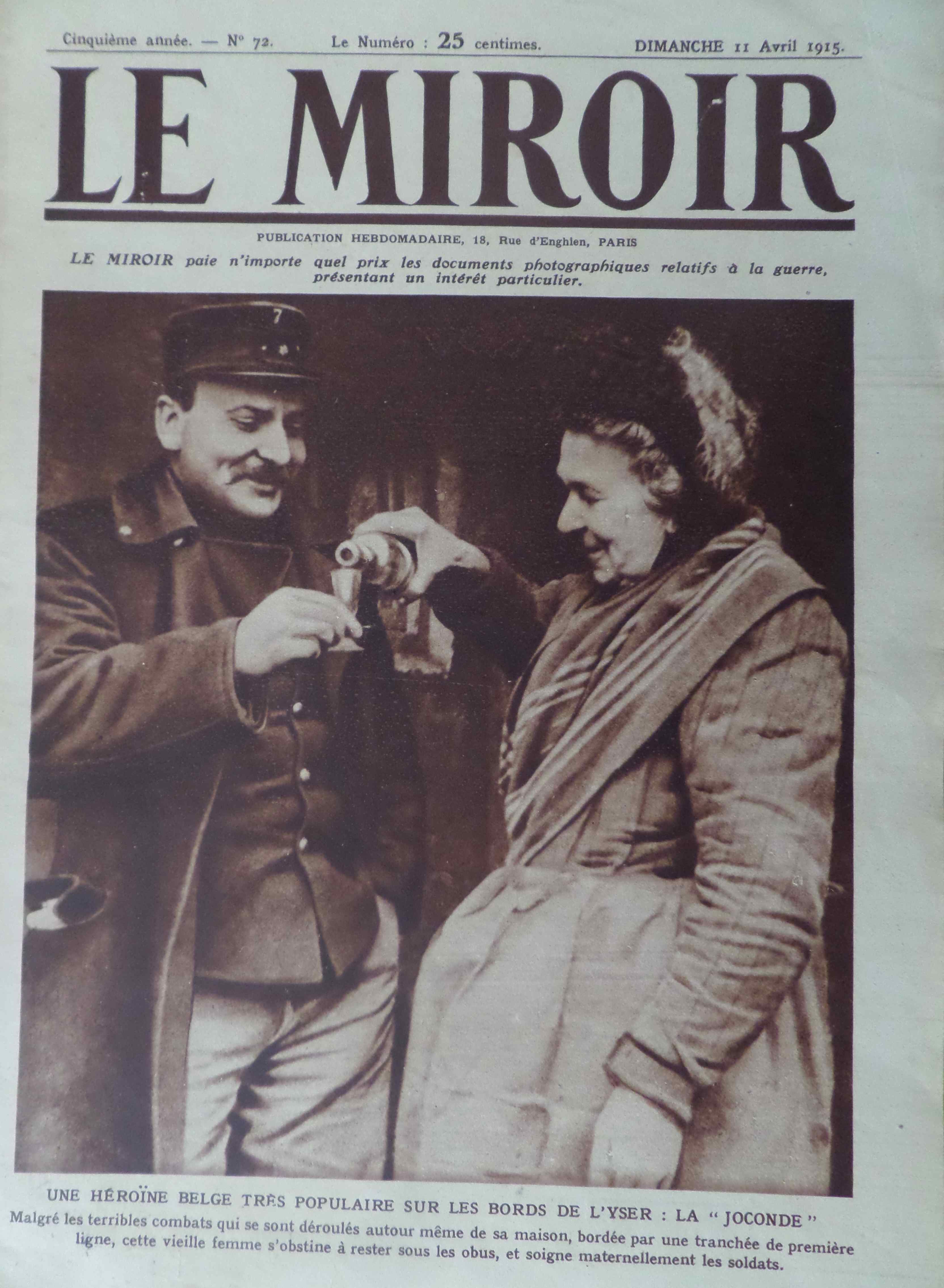 La une est faite d’une photo de « la Joconde », une vieille dame westflandrienne n’ayant pas quitté sa maison devant laquelle se trouvaient les tranchées alliées. Sa maison recevait donc journellement des obus allemands, ce qui ne lui a pas fait quitter les lieux.