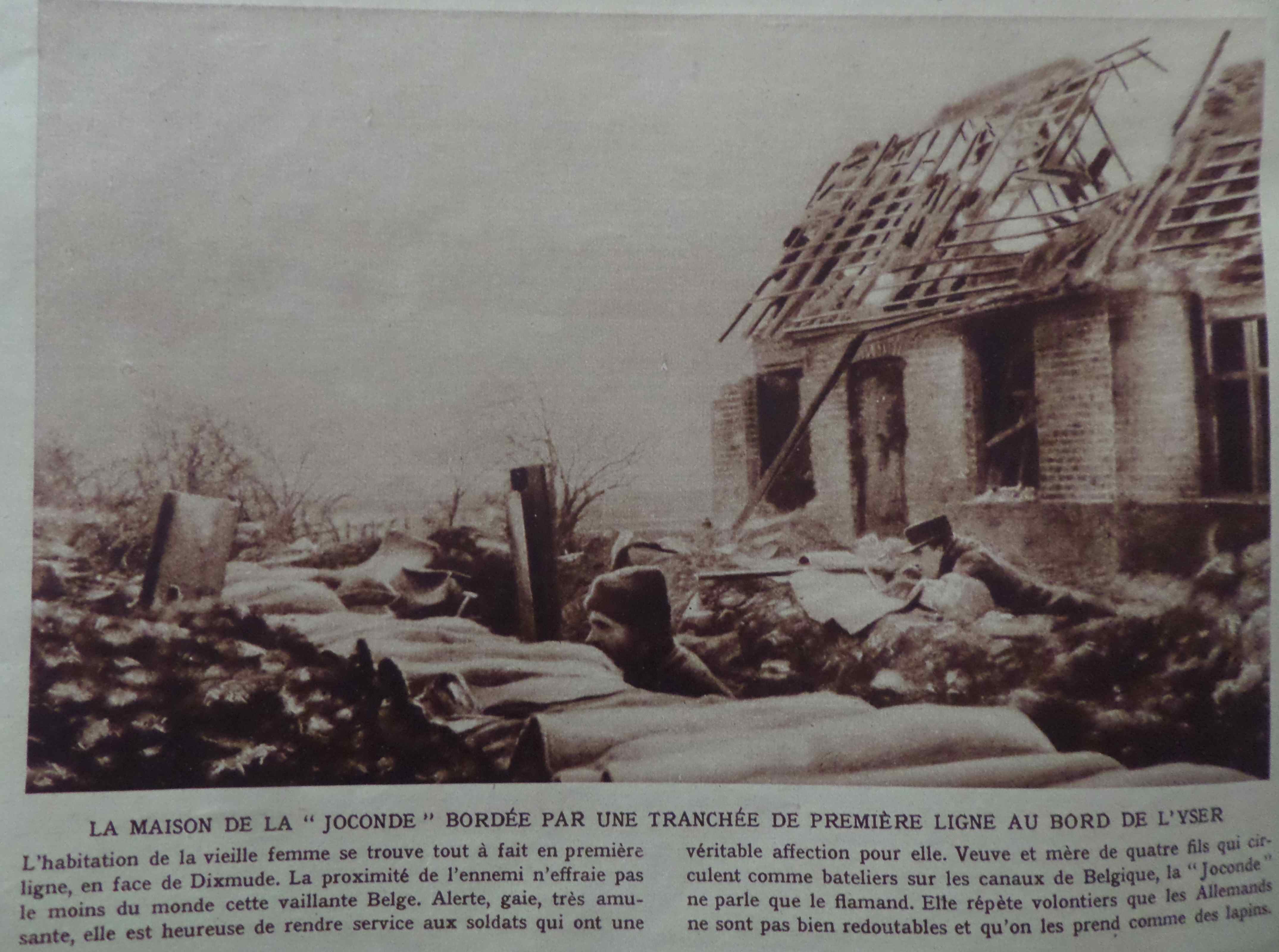 Lorsque notre régiment, le 7° de ligne, arriva le 12 janvier 1915, dans le secteur sud de Dixmude, face au château Hendrickx, grand fut notre étonnement d’y rencontrer, en première ligne, une petite vieille, bien ridée, qui y occupait toujours ce qui restait de sa maison en contrebas de la digue de l’ yser. C’est le général De Wasch, à l’époque jeune sous-lieutenant, qui la baptisa aussitôt de ce surnom, fameux à plus d’un titre: « La joconde ». En effet, à peine l’avait-il aperçue qu’ il s’écria: « Tiens, voilà la Joconde qui est retrouvée. »
