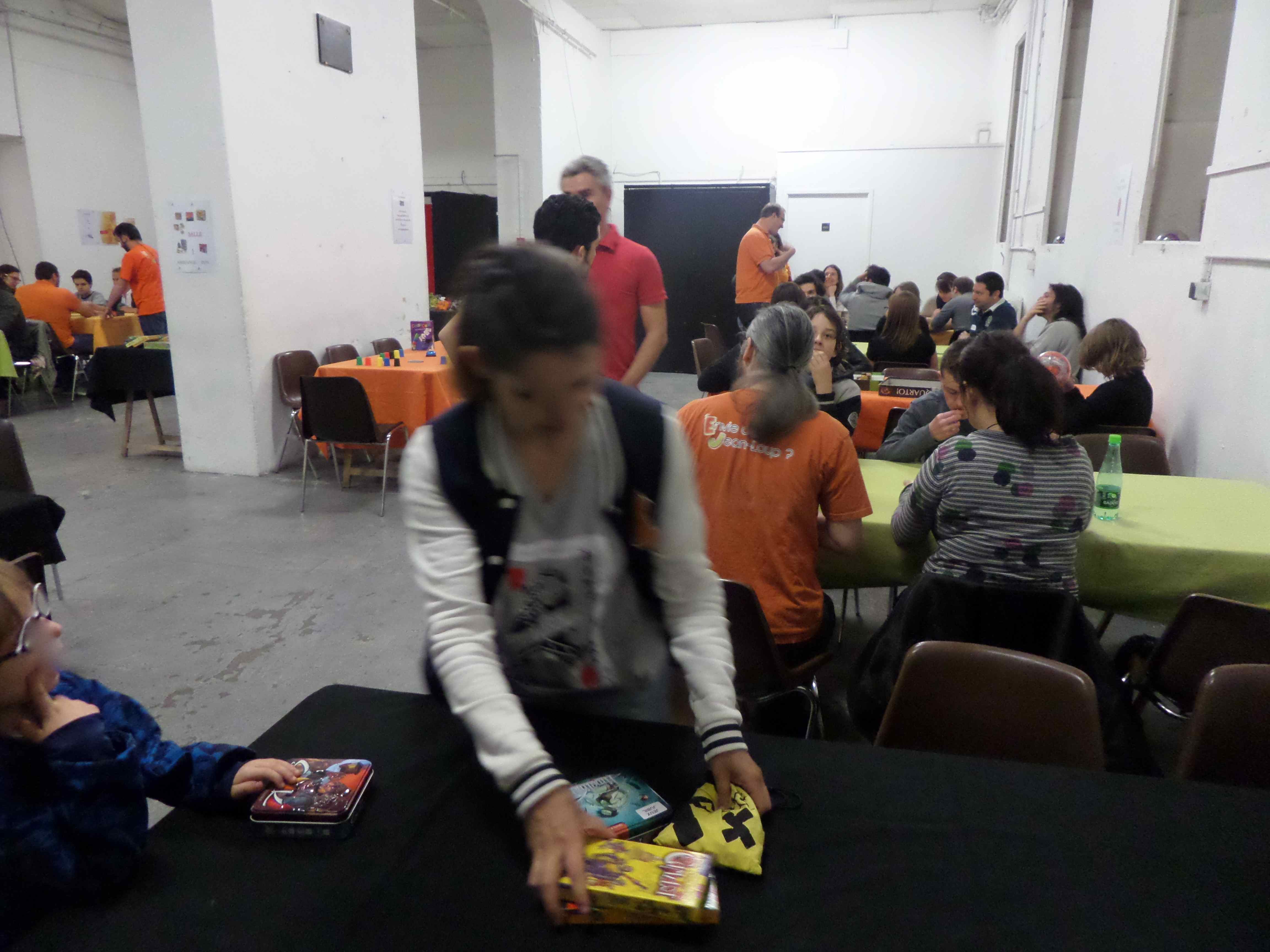Un essai de ce jeu aux Ludivores en décembre ou janvier dernier n’avaient pas enthousiasmé grand monde. La présentation par un animateur très pédagogue de Jeux Jubil’ nous a fait vraiment changé d’avis et c’est vraiment un jeu bien sympa. Le principe: dessiner sur un transparent posé devant soi un circuit à partir d’éléments dictés par la règle correspondant à l’image au centre de la table. Exemple de ce que cela peut donner: