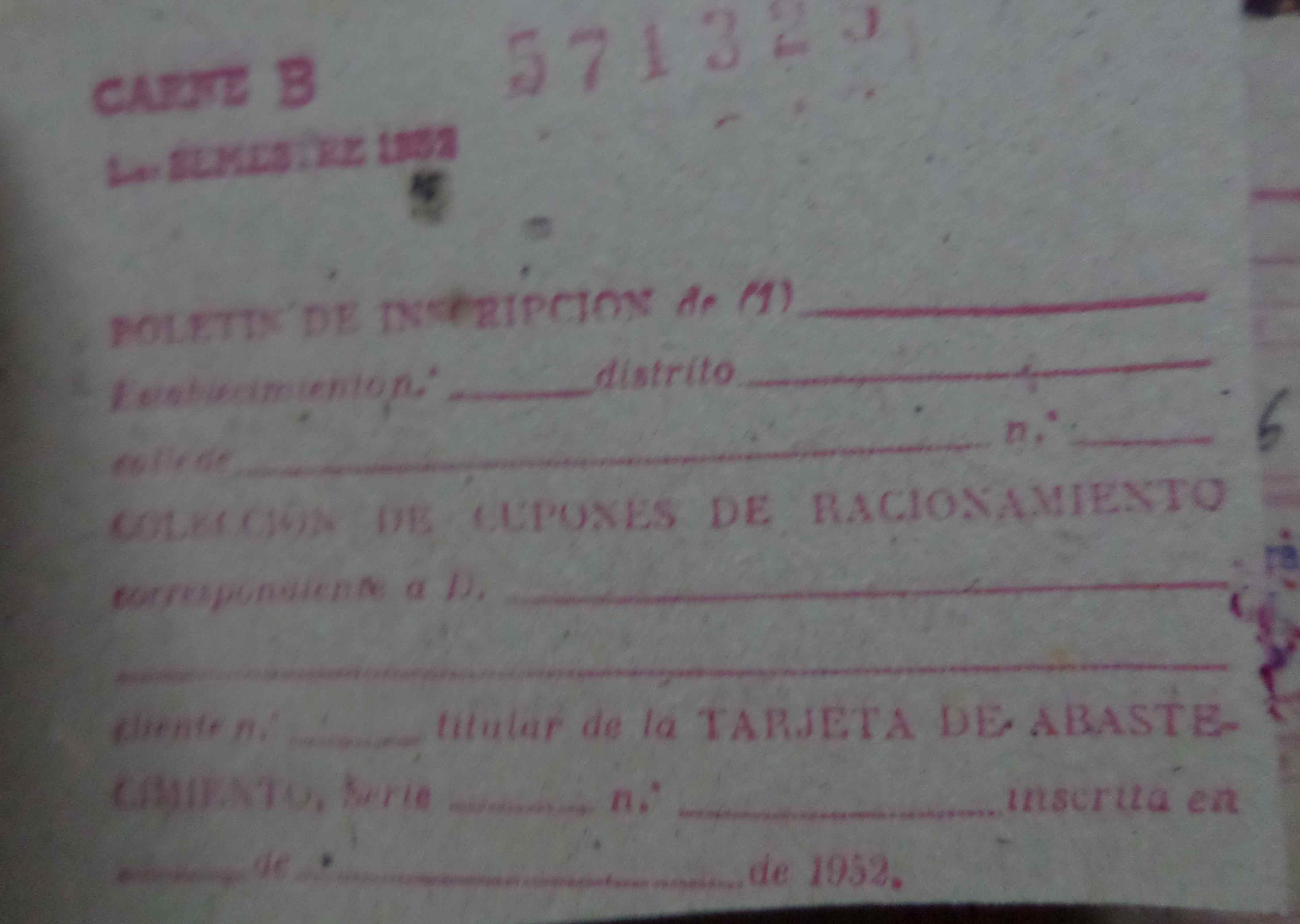 La forme du carnet a changé*, le blason espagnol surmonté de l’aigle trône en grand en couverture mais, alors qu’en France, le rationnement a disparu en 1949, la population espagnole continue de souffrir de la malnutrition. Certes, si ce carnet a été trouvé ainsi aux puces de l’Encant à Barcelone, c’est que son propriétaire ne s’en est pas servi à l’époque. En effet, la date de 1952 correspond à peu près à la fin de la période de rationnement, 13 ans après la fin de la guerre civile, 7 ans après celle de la seconde guerre mondiale.