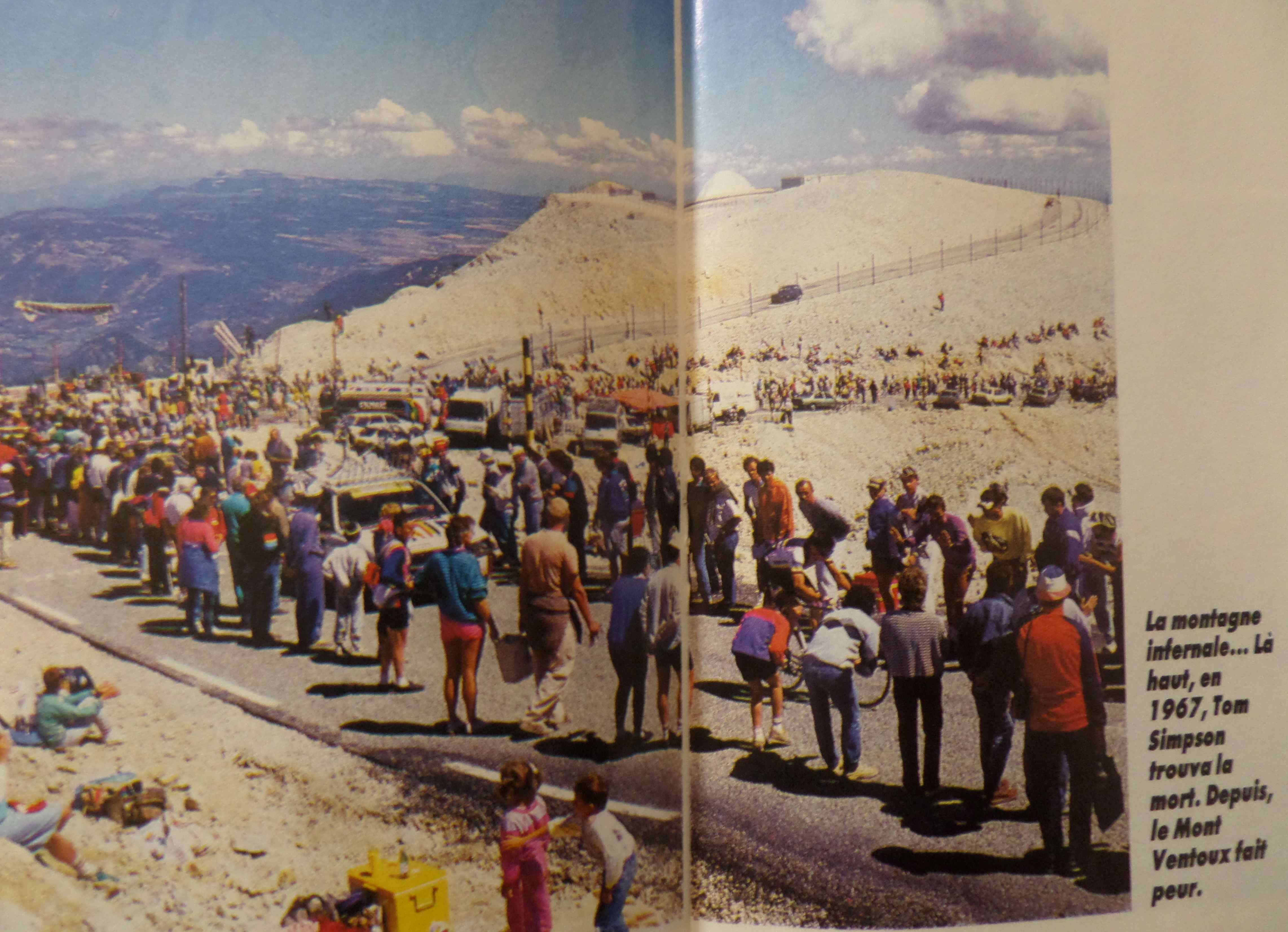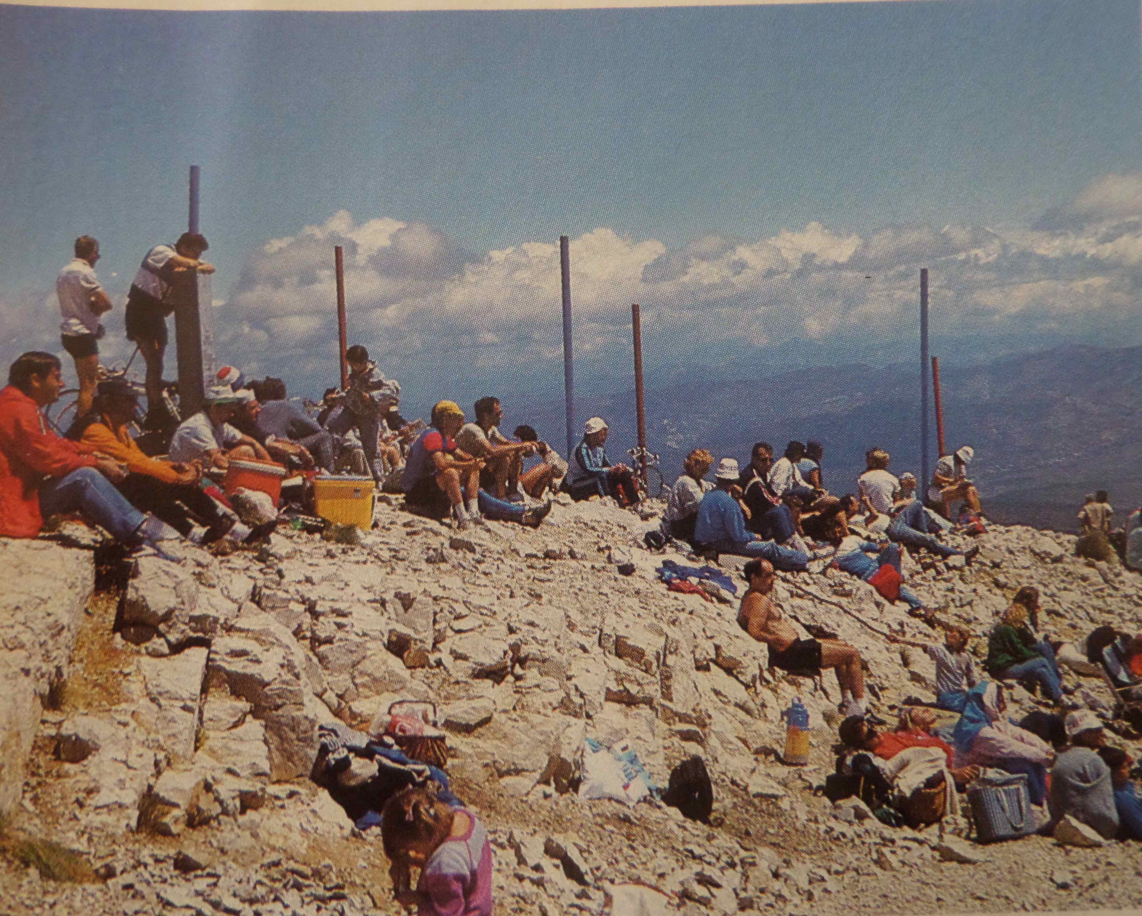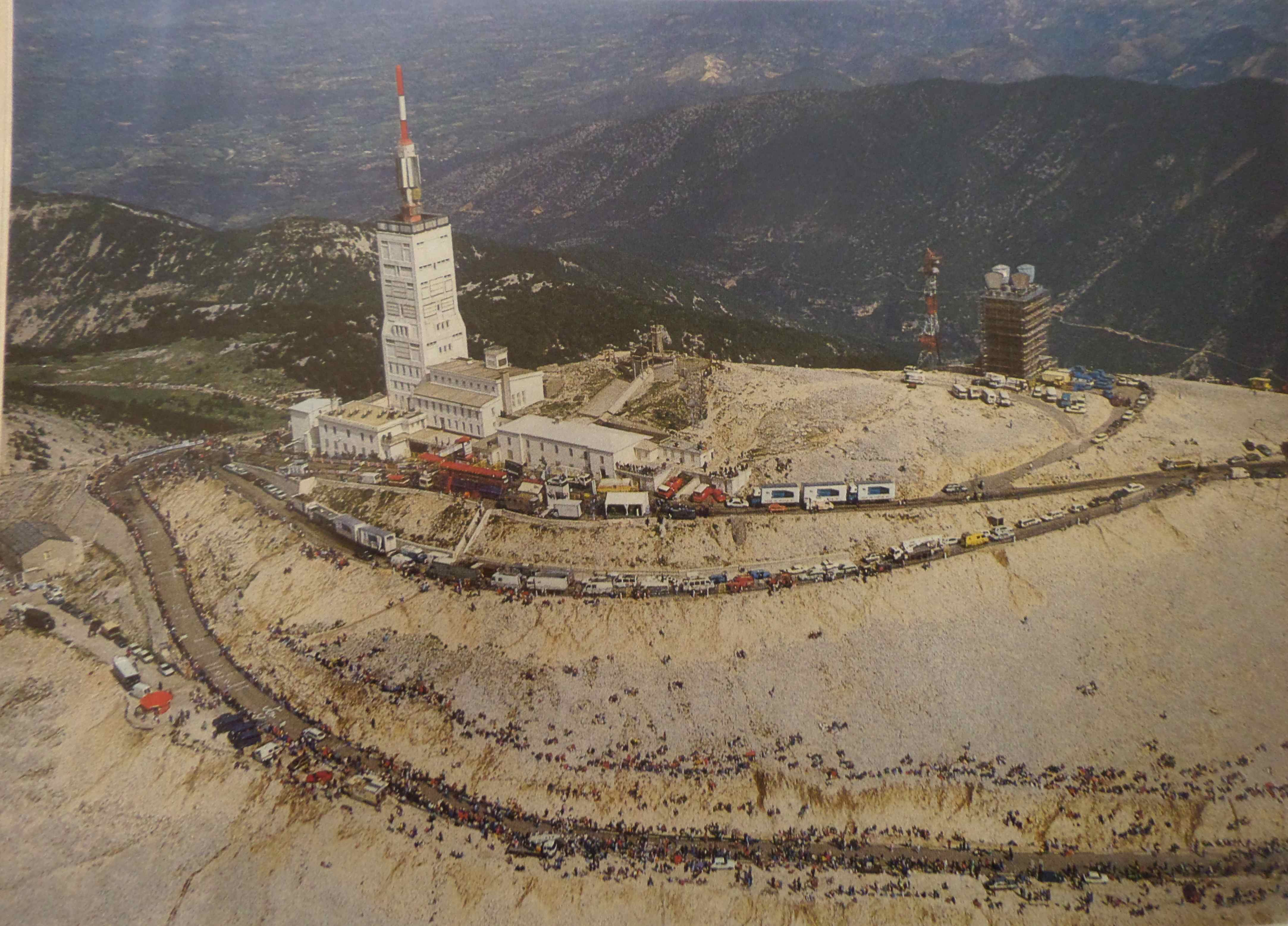 Nous sommes le dimanche 19 juillet 1987 pour la 18ème étape, un contre-la-montre individuel de 36,5km entre Carpentras et l’Observatoire. Le Tour a changé de dimension, des concurrents de pays neufs au cyclisme ont fait leur apparition et l’événement est devenu mondial grâce à la télévision. Le matériel technique a évolué (voir le nombre de camions au sommet pour l’arrivée sur la photo ci-dessus) et le public est présent en masse.