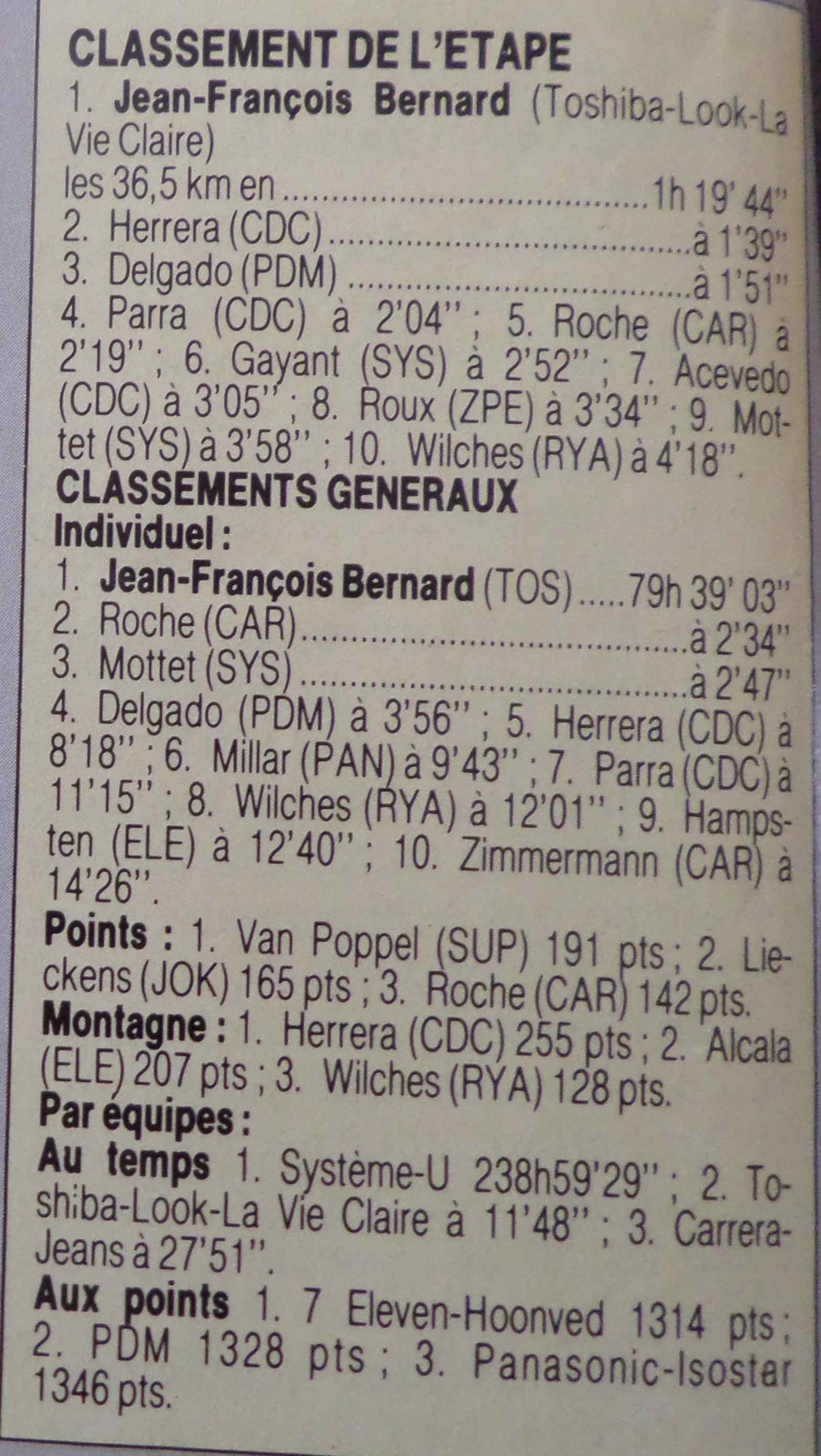Malheureusement la joie du clan Tapie fut de courte durée puisque le lendemain, une crevaison au mauvais moment sur la route de Villard-de-Lans fit perdre son maillot à Jean-François Bernard, qui termina seulement à la troisième place au général à Paris derrière Stephen Roche et Perico Delgado.