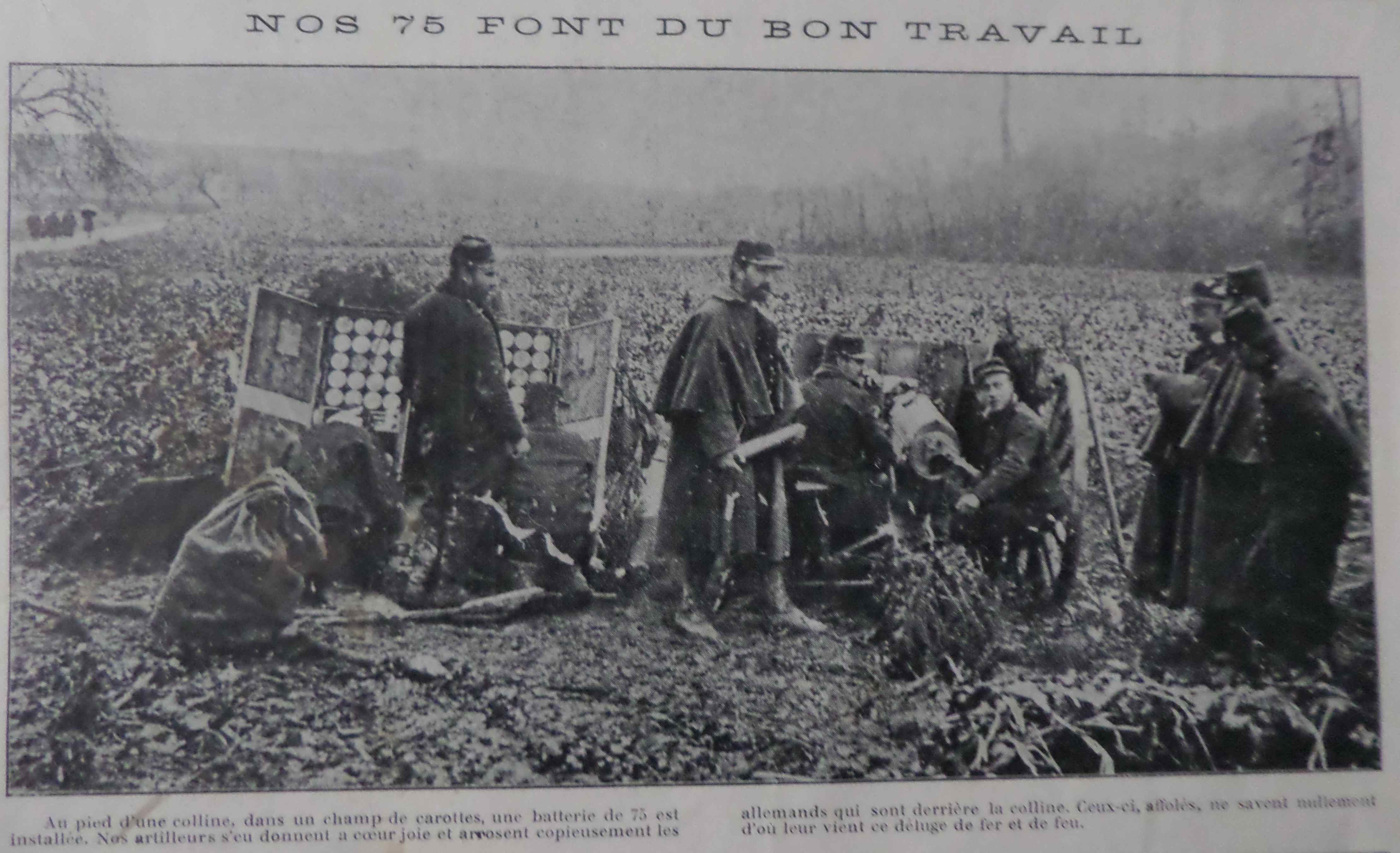 Des canons de 75 en position, les hommes posant paour l’objectif alors que le narrateur essaie de nous faire croire qu’il s’agit d’une scène de bataille… alors que des personnes déambulent à gauche sur la route !