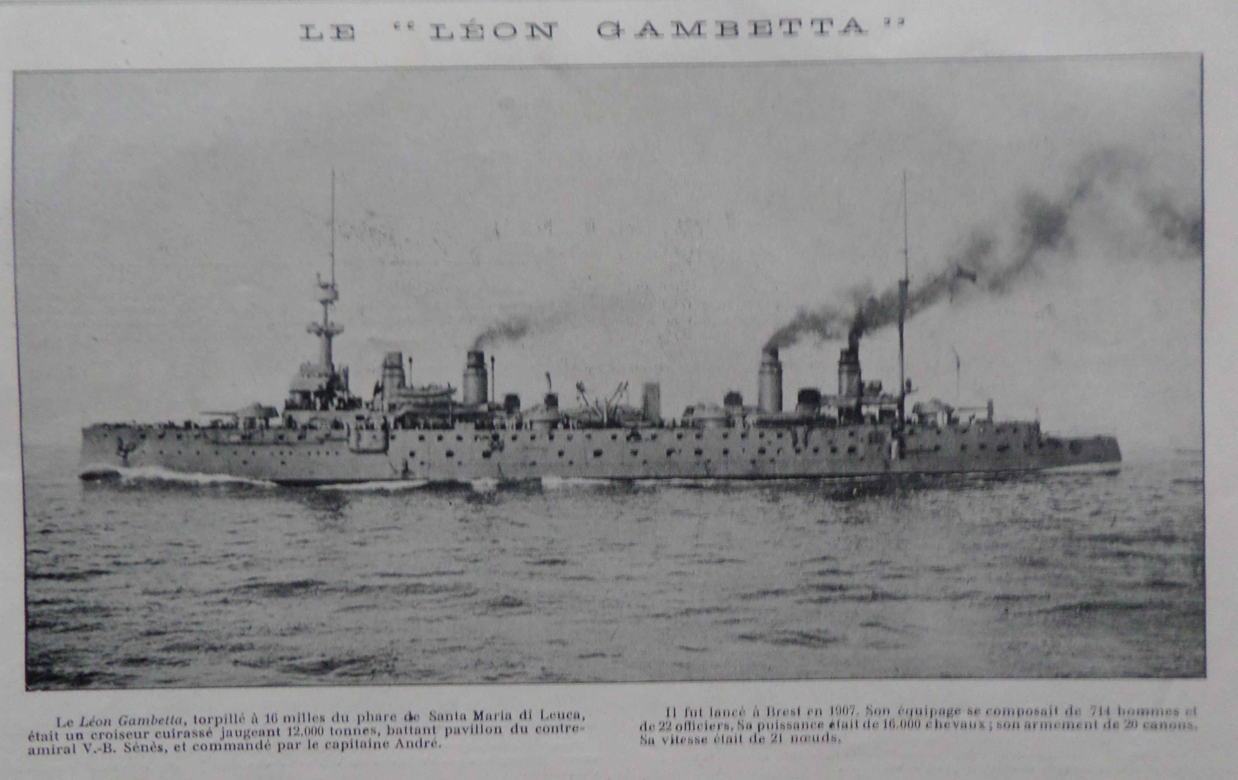 On a déjà parlé du drame du « Léon-Gambetta » torpillé le 25 avril 1915 en entrée d’Adriatique qui coûté la vie à 684 hommes.