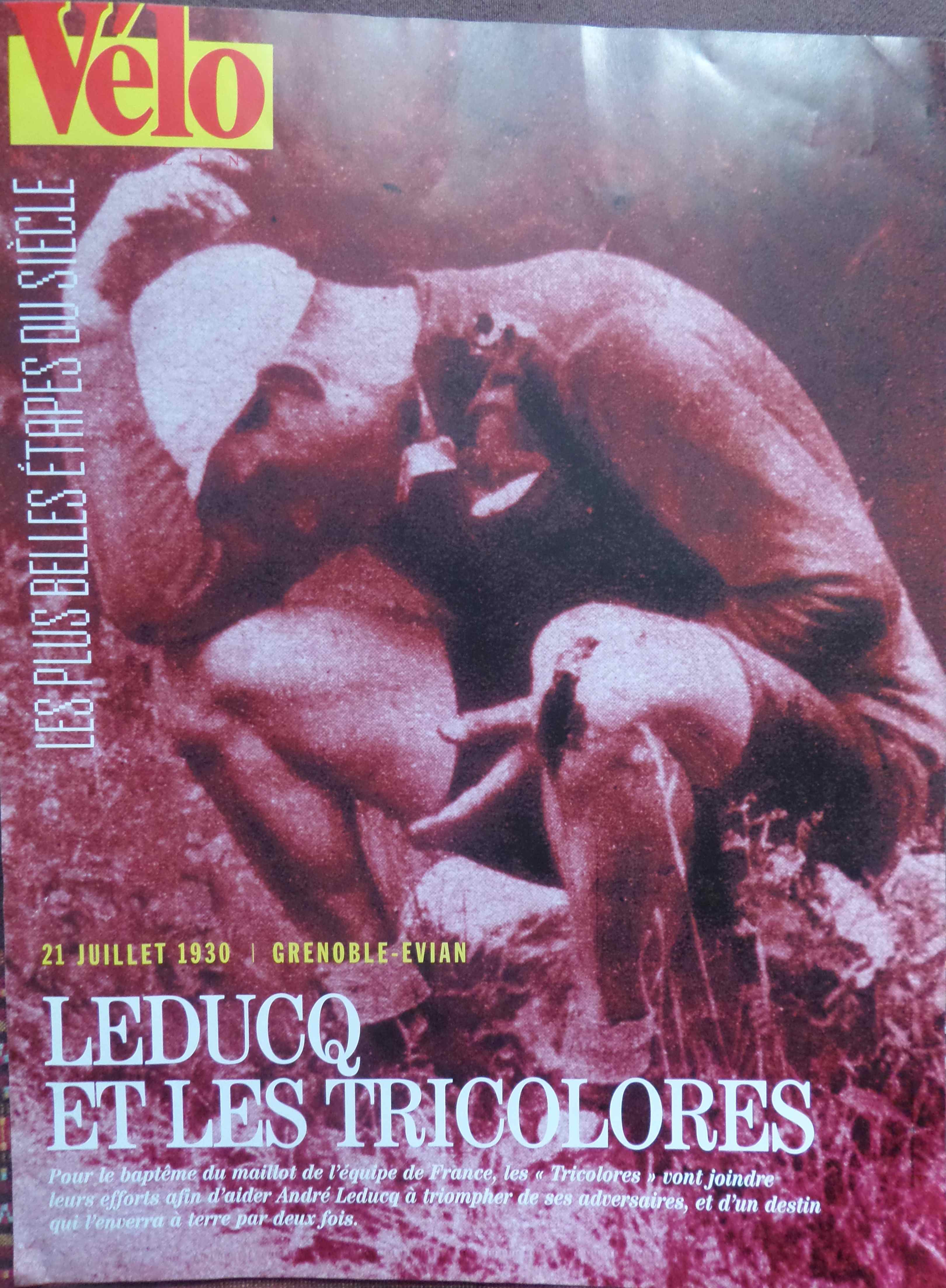 1930, le premier Tour couru par équipes nationales et où apparaît aussi la caravane publicitaire composée de 6 véhicules des marques Menier (chocolat), Lion Noir, Bayard, Staff (gruyère) et Standard (café). L’équipe de France va dominer la course pour une victoire finale de Lucien Leducq… pourtant en fâcheuse posture sur cette photo. En effet, dans la descente du Galibier, en fin de course, une grosse chute le mit à terre qui faillit le priver de la victoire finale.
