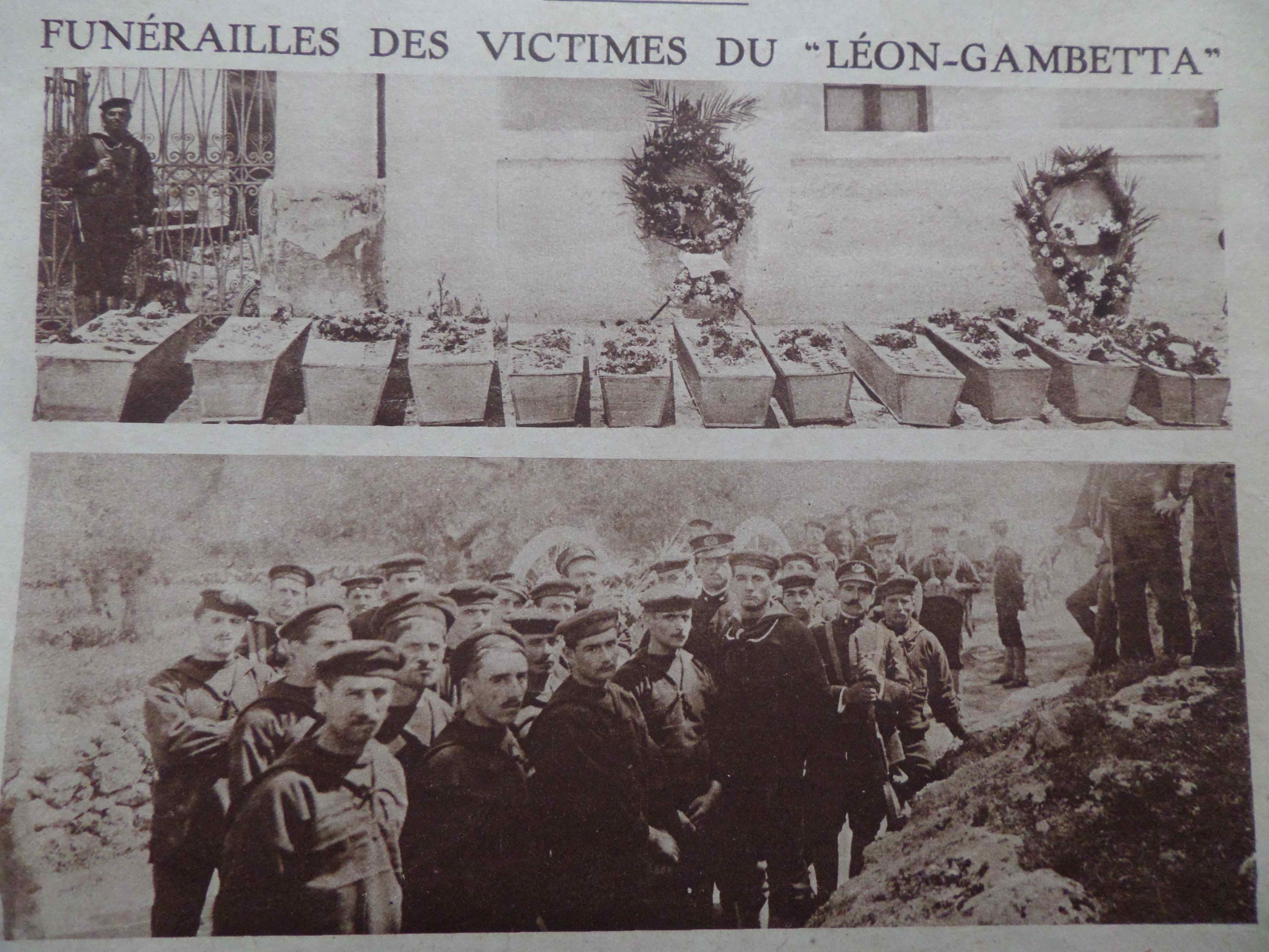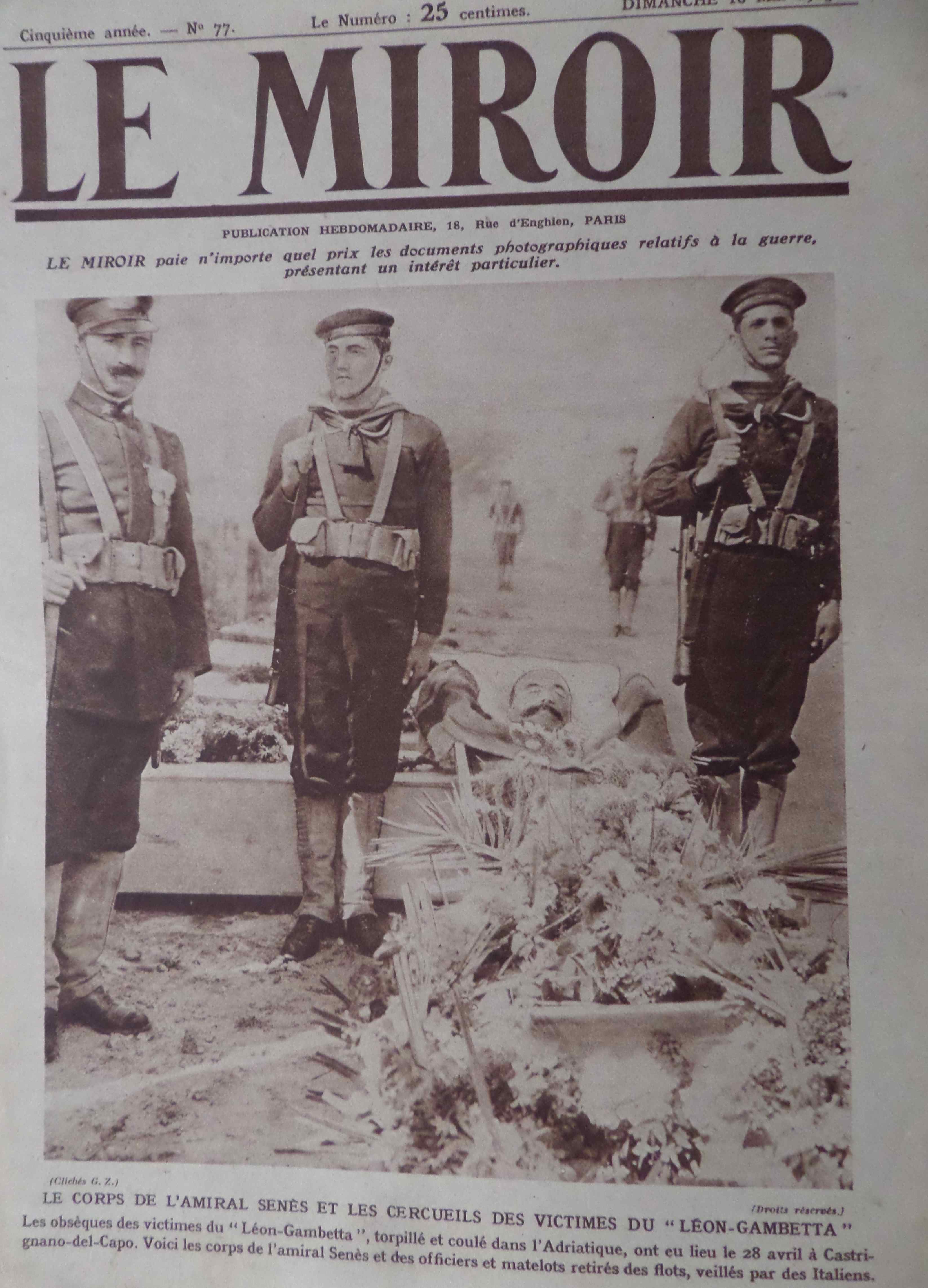 La une de la revue est faite avec la garde d’honneur autour de la dépouille du pacha du « Léon-Gambetta » coulé en entrée d’Adriatique le 28 avril. Les corps ont été récupérés en Italie et vont être enterrés dans cette terre. Une page est consacrée aux conséquences de drame.