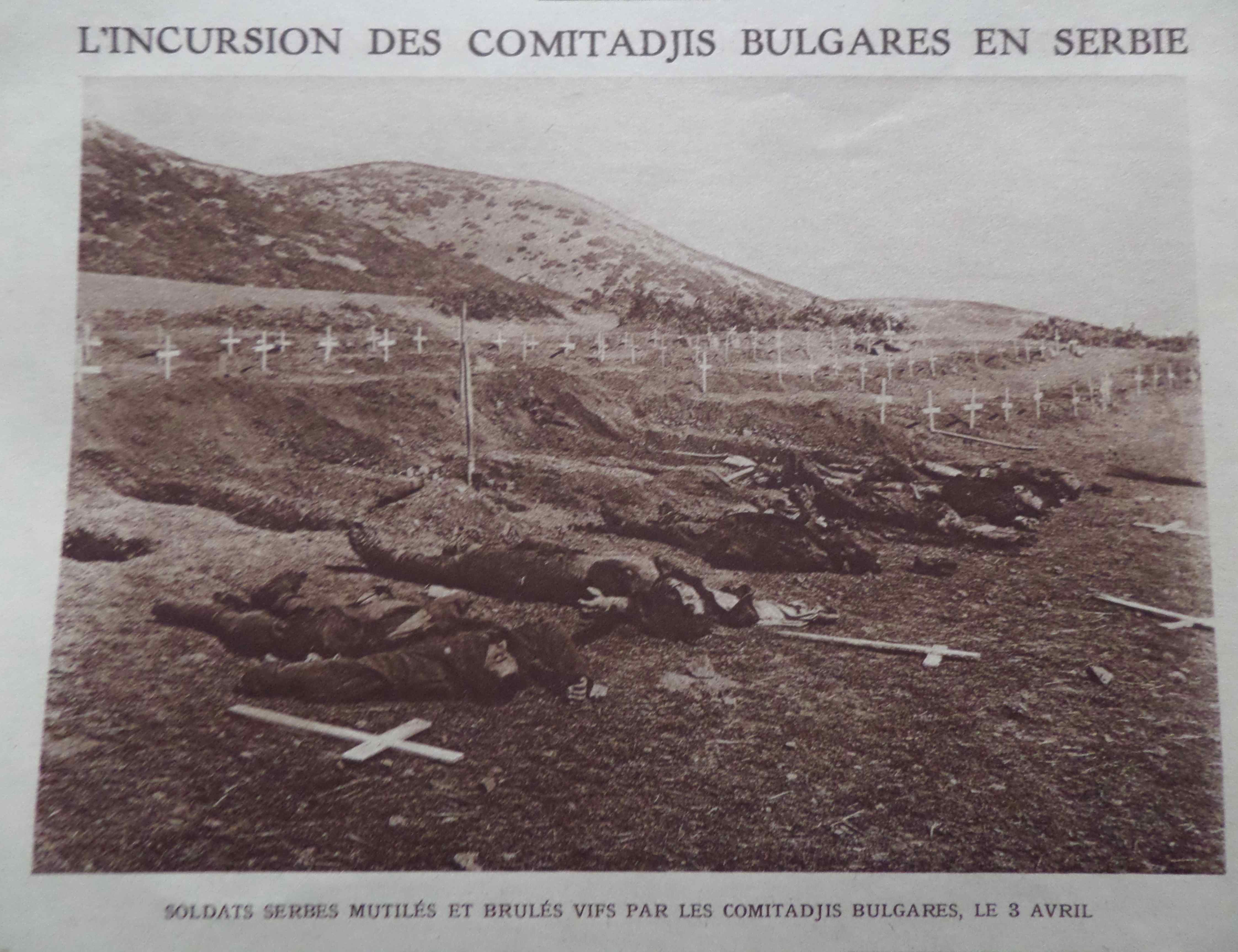 Ce sont des militaires serbes qui attendent leur inhumation après avoir subi des mutilations ou crémations des fameux comitajis bulgares. Au XIXème siècle, ces partisans s’attaquèrent aux occupants d’alors de leur territoire: les Turcs. Après leur départ, ce furent les nouveaux occupants, les Serbes, qui furent leur cible… Cela continua après la Grande Guerre puisqu’Albert Londres les rencontra (difficilement) dans les années 20 puis les années 30. On comprend la difficulté dans les Balkans de régler les problèmes avec des haines qui viennent de si loin !