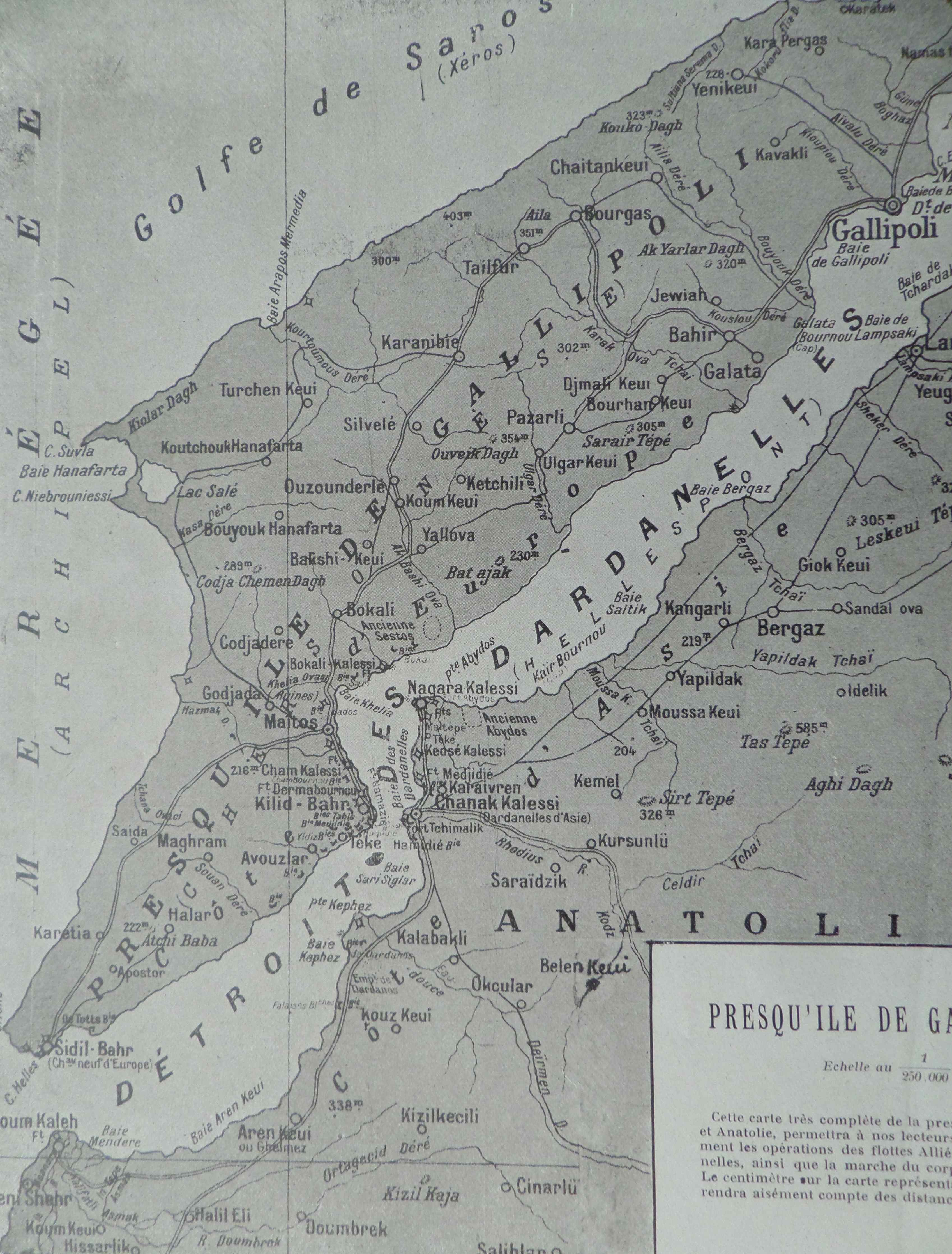Une carte des Dardanelles avec la presqu’île de Gallipoli…
