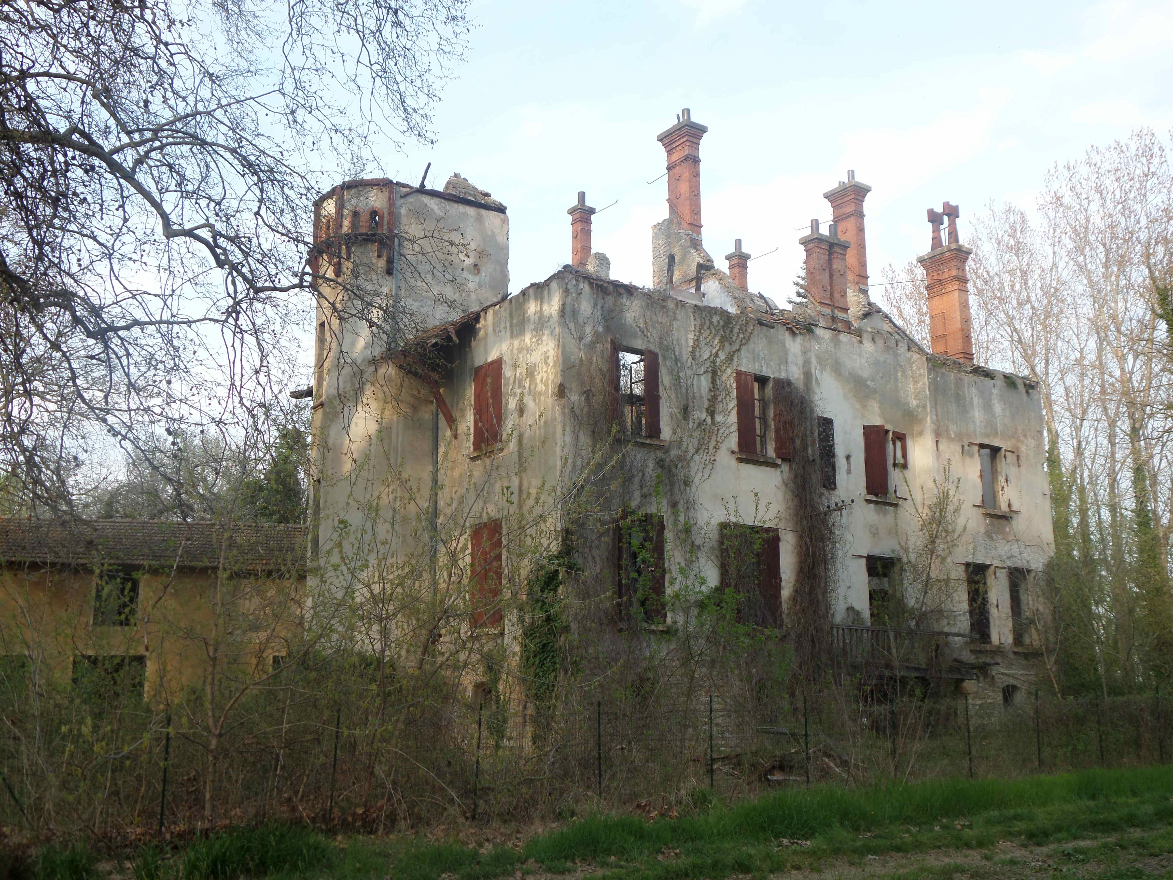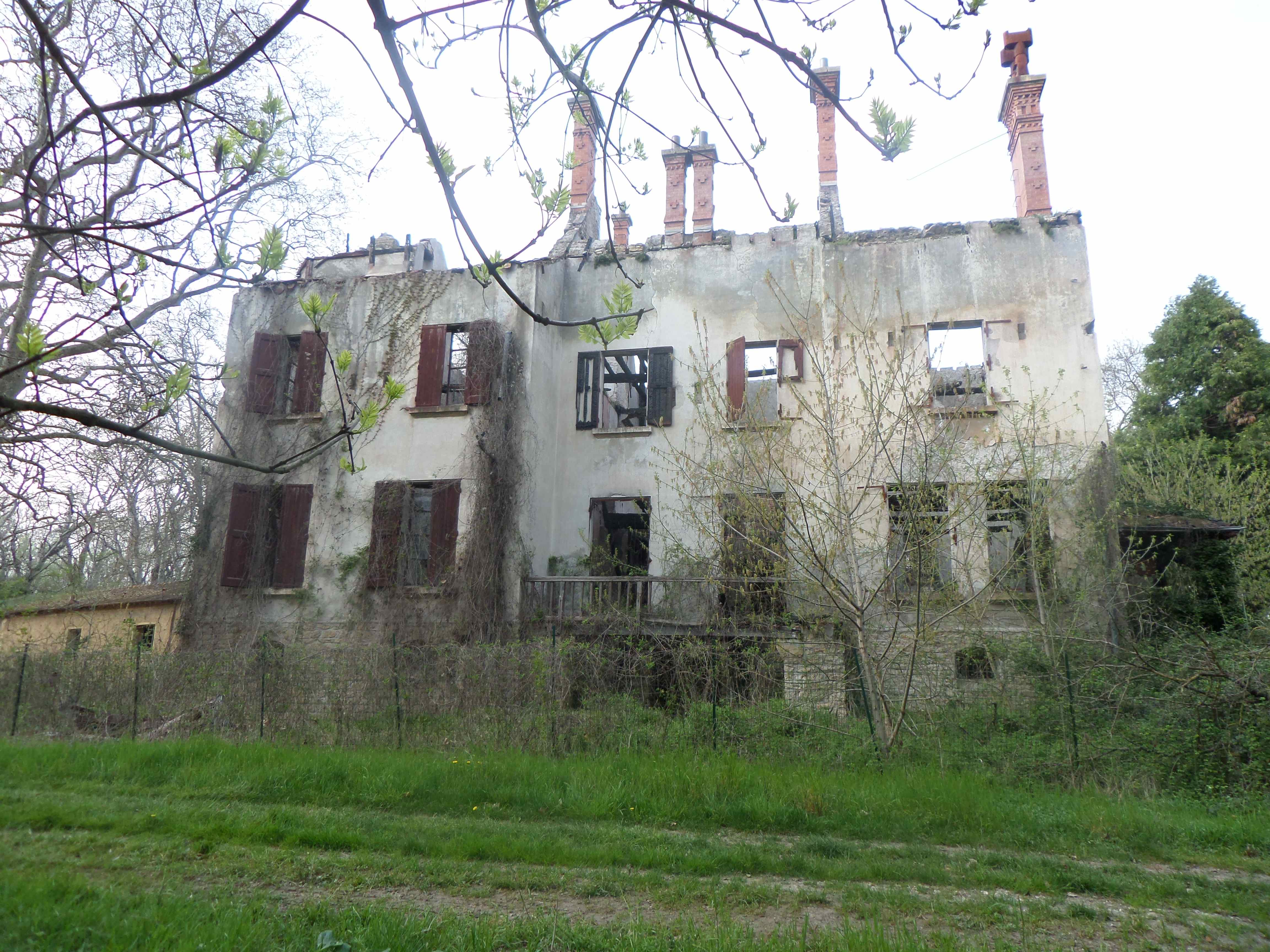 Photos prises en mars 2014. Par rapport à la vue ancienne, la toiture ayant disparu, on peut faire correspondre les fenêtres, les squelettes des cheminées, le corps de bâtiment avancé, le balcon à droite de l’avancée, la tour semi-circulaire de gauche…