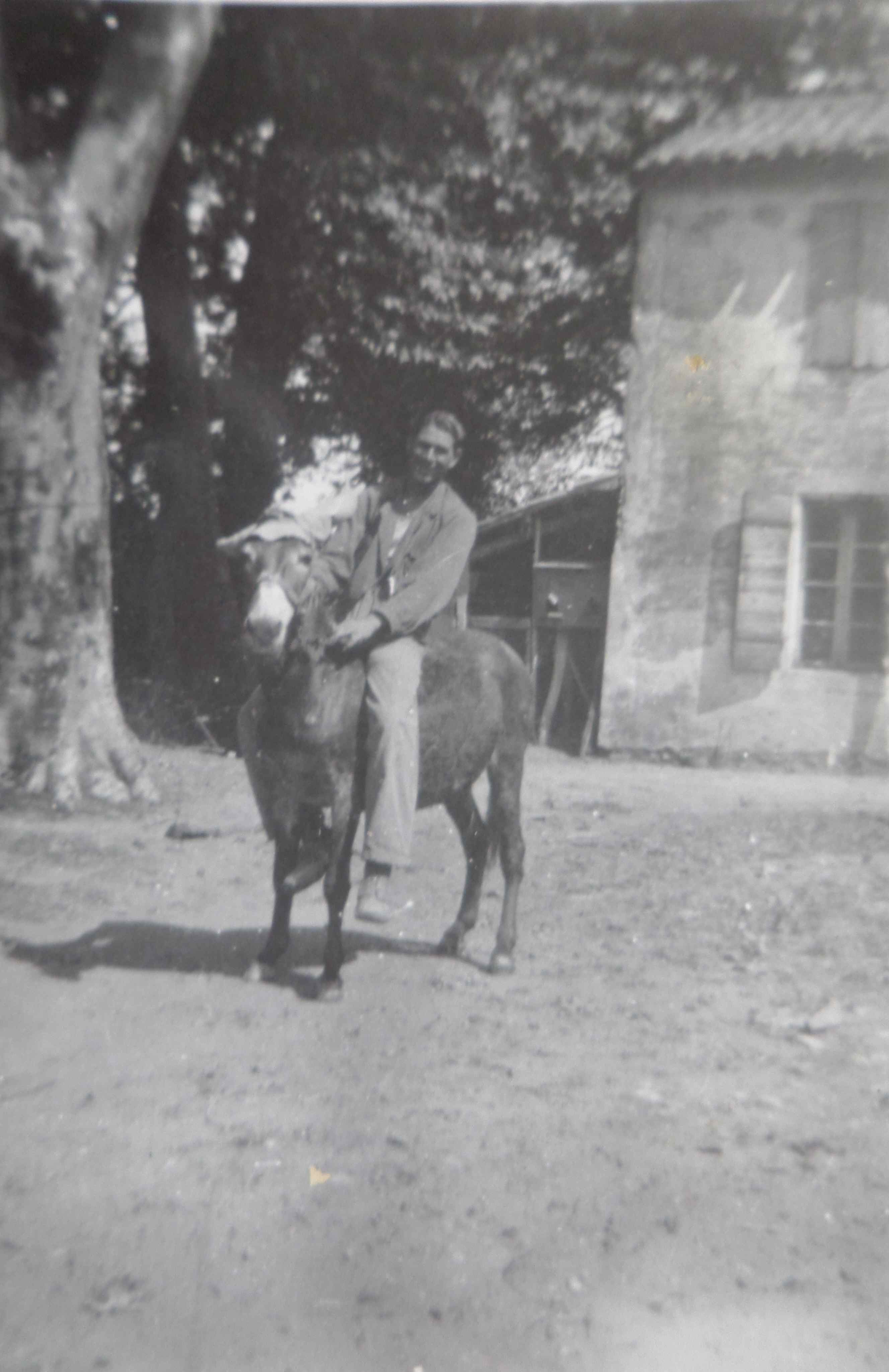 celle de l’oncle Maxime s’essayant à l’équitation sur un petit équidé, avec semble-t-il sa petite belle-soeur Jacqueline dans les bras, certainement dans la cour des dépendances du château de la Piboulette, peut-être le bâtiment le plus clair, à gauche.
